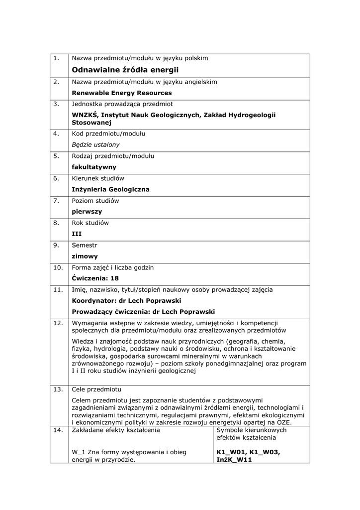 1. Nazwa przedmiotu/modułu w języku polskim Odnawialne źródła energii 2. Nazwa przedmiotu/modułu w języku angielskim Renewable Energy Resources 3. Jednostka prowadząca przedmiot WNZKŚ, Instytut Nauk Geologicznych, Zakład Hydrogeologii Stosowanej 4. Kod przedmiotu/modułu Będzie ustalony 5. Rodzaj przedmiotu/modułu fakultatywny 6. Kierunek studiów Inżynieria Geologiczna 7. Poziom studiów pierwszy 8. Rok studiów III 9. Semestr zimowy 10. Forma zajęć i liczba godzin Ćwiczenia: 18 11. Imię, nazwisko, tytuł/stopień naukowy osoby prowadzącej zajęcia Koordynator: dr Lech Poprawski Prowadzący ćwiczenia: dr Lech Poprawski 12. Wymagania wstępne w zakresie wiedzy, umiejętności i kompetencji społecznych dla przedmiotu/modułu oraz zrealizowanych przedmiotów Wiedza i znajomość podstaw nauk przyrodniczych (geografia, chemia, fizyka, hydrologia, podstawy nauki o środowisku, ochrona i kształtowanie środowiska, gospodarka surowcami mineralnymi w warunkach zrównoważonego rozwoju) – poziom szkoły ponadgimnazjalnej oraz program I i II roku studiów inżynierii geologicznej 13. 14. Cele przedmiotu Celem przedmiotu jest zapoznanie studentów z podstawowymi zagadnieniami związanymi z odnawialnymi źródłami energii, technologiami i rozwiązaniami technicznymi, regulacjami prawnymi, efektami ekologicznymi i ekonomicznymi polityki w zakresie rozwoju energetyki opartej na OZE. Zakładane efekty kształcenia Symbole kierunkowych efektów kształcenia W_1 Zna formy występowania i obieg energii w przyrodzie. K1_W01, K1_W03, InżK_W11 15. W_2 Zna podstawowe problemy energetyczne współczesnego świata K1_W07, InżK_W01, InżK_W11 W_3 Zna podstawowe rozwiązania techniczne i technologiczne w zakresie OZE InżK_W04, InżK_W11 U_1 Potrafi ocenić wpływ człowieka na zmiany klimatyczne K1_U10, K1_U11 U_2 Potrafi zbilansować zapotrzebowanie na energię, K1_U08, InżK_U08 U-3 Potrafi przeprowadzić podstawową analizę techniczną i ekonomiczną konkretnych rozwiązań InżK_U07, InżK_U10 K_1 Ma świadomość konieczności zwiększania udziału OZE w energetyce oraz międzynarodowych uzgodnień w tym zakresie. K1_K05, InżK_K01 K_2 Ma świadomość konieczności ciągłego poszerzania swojej wiedzy w zakresie nowych technologii i rozwiązań w zakresie wykorzystania OZE K1_K06, InżK_K01 K_3 Potrafi pracować w zespole oraz obiektywnie ocenić pracę swoją i innych K1_K01, K1_K07, InżK_K02 Treści programowe Ćwiczenia: 16. W części wprowadzającej do ćwiczeń studenci zapoznają się z bilansem energetycznym ziemi, formami występowania i obiegiem energii w przyrodzie, zmianami klimatu w przeszłości, wpływem człowieka na klimat (efekt cieplarniany, globalne ocieplenie, dziura ozonowa, zmiany kierunków prądów oceanicznych, kontrowersje wokół przyczyn i skutków zmian globalnych oraz regionalnych).Zapoznają się również problemami energetyki (zapotrzebowanie na energię i jego wzrost, ograniczenia surowcowe paliw kopalnych, polityką energetyczną Polski, Europy i Świata) Na bazie przygotowania ogólnego i teoretycznego zapoznają się z konkretnymi rozwiązaniami technicznymi i technologicznymi, przykładami instalacji OZE (elektrownia wodna, elektrownia wiatrowa, pompy cieplne, instalacja geotermalna, baterie słoneczne, kotłownia na biomasę, instalacja fermentacyjna, produkcja biopaliw, zrębek, brykietów i paliwa alternatywnego z odpadów), bilansowaniem zapotrzebowania na energię, analizami ekonomicznymi i trwałością rozwiązań. W trakcie zajęć przewiduje się odwiedzenie 2-3 obiektów związanych z produkcją energii ze źródeł odnawialnych. Zalecana literatura Literatura podstawowa: Lewandowski W.M., 2001 -Proekologiczne źródła energii odnawialnej. Wyd. Naukowo-Techniczne, Warszawa. Tytko R., 2008 - Odnawialne źródła energii - wybrane zagadnienia. Wyd. Deka, Kraków. Kaltschmit M., Streicher W, Wiese A. (Edit.) – 2007. Renevable Energy – Technology, Economics and Environment. Springer-Verlag. BerlinHeidelberg. Twidel J., Weir T – 2008. Renewable Energy Resources. Taylor&Francis, New York. Literatura uzupełniająca: Kapuściński J. i in.1997 – Zasady i metodyka dokumentowania zasobów wód termalnych i energii geotermalnej oraz sposoby odprowadzania wód zużytych. Poradnik Metodyczny. Warszawa. Kupchella CE, Hyland MC, 1989 – Living Within the System of Nature. Allyn and Bacon, Boston, London, Sydney, Toronto. Małecki A., 1997 - Zasady i metodyka dokumentowania zasobów wód termalnych i energii geotermalnej oraz sposoby odprowadzania wód zużytych. Lipiński A., 1998 - Pozyskiwanie energii ze Słońca. Wyd. Inst GSMiE PAN. Rodzoch, J. Kapuściński - Geotermia niskotemperaturowa w Polsce – stan aktualny i perspektywy rozwoju. Ministerstwo Środowiska. Zasoby internetu. 17. Forma zaliczenia poszczególnych komponentów przedmiotu/modułu, sposób sprawdzenia osiągnięcia zamierzonych efektów kształcenia: Ćwiczenia: Sprawozdanie pisemne z przeprowadzonych analiz oraz opracowanie raportów i sprawozdań z wykonanych zadań - uzyskanie łącznie co najmniej 50% punktów W_1, W_2, U_1, U_2, U_3, K_1, K_2, K_3 Sprawdzian teoretyczny (test otwarty). Wynik pozytywny - uzyskanie co najmniej 50% punktów, W_1, W_2, W_3. 18. Język wykładowy polski 19. Obciążenie pracą studenta: Forma aktywności studenta Średnia liczba godzin na zrealizowanie aktywności Godziny zajęć (wg planu studiów) z nauczycielem: - ćwiczenia: 18 22 - konsultacje: 4 Praca własna studenta np.: - przygotowanie do zajęć: 2 - czytanie wskazanej literatury: 10 - napisanie raportu z zajęć: 8 25 - przygotowanie do zaliczenia: 5 Suma godzin Liczba punktów ECTS 47 2