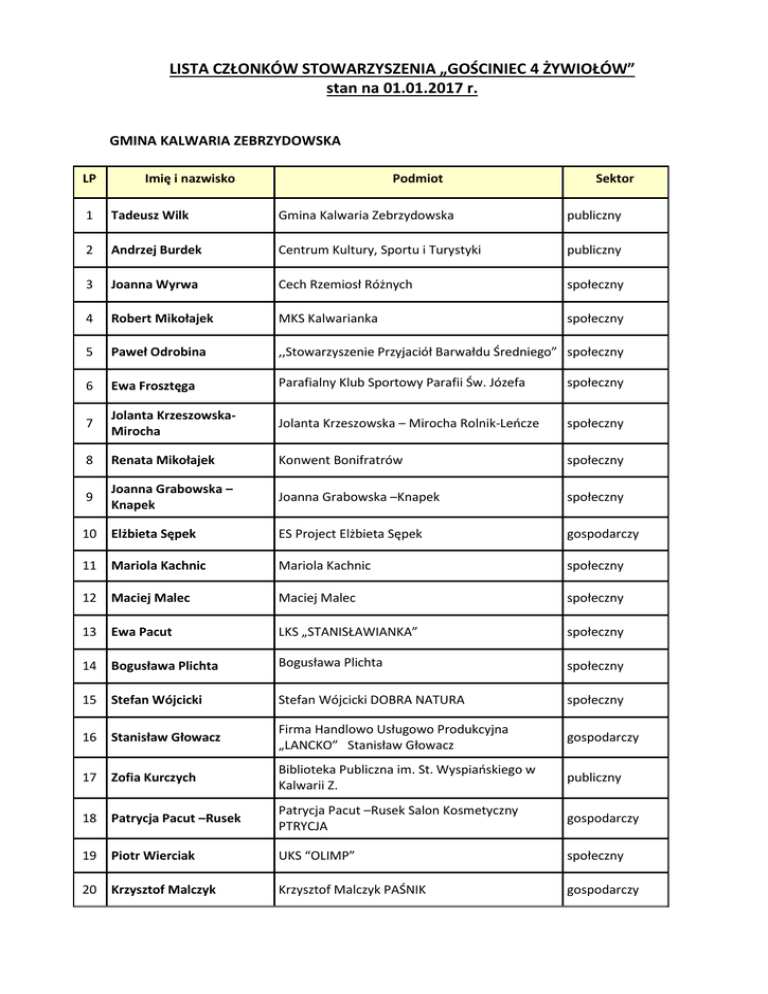 LISTA CZŁONKÓW STOWARZYSZENIA „GOŚCINIEC 4 ŻYWIOŁÓW” stan na 01.01.2017 r. GMINA KALWARIA ZEBRZYDOWSKA LP Imię i nazwisko Podmiot Sektor 1 Tadeusz Wilk Gmina Kalwaria Zebrzydowska publiczny 2 Andrzej Burdek Centrum Kultury, Sportu i Turystyki publiczny 3 Joanna Wyrwa Cech Rzemiosł Różnych społeczny 4 Robert Mikołajek MKS Kalwarianka społeczny 5 Paweł Odrobina ,,Stowarzyszenie Przyjaciół Barwałdu Średniego” społeczny 6 Ewa Frosztęga Parafialny Klub Sportowy Parafii Św. Józefa społeczny 7 Jolanta KrzeszowskaMirocha Jolanta Krzeszowska – Mirocha Rolnik-Leńcze społeczny 8 Renata Mikołajek Konwent Bonifratrów społeczny 9 Joanna Grabowska – Knapek Joanna Grabowska –Knapek społeczny 10 Elżbieta Sępek ES Project Elżbieta Sępek gospodarczy 11 Mariola Kachnic Mariola Kachnic społeczny 12 Maciej Malec Maciej Malec społeczny 13 Ewa Pacut LKS „STANISŁAWIANKA” społeczny 14 Bogusława Plichta Bogusława Plichta społeczny 15 Stefan Wójcicki Stefan Wójcicki DOBRA NATURA społeczny 16 Stanisław Głowacz Firma Handlowo Usługowo Produkcyjna „LANCKO” Stanisław Głowacz gospodarczy 17 Zofia Kurczych Biblioteka Publiczna im. St. Wyspiańskiego w Kalwarii Z. publiczny 18 Patrycja Pacut –Rusek Patrycja Pacut –Rusek Salon Kosmetyczny PTRYCJA gospodarczy 19 Piotr Wierciak UKS “OLIMP” społeczny 20 Krzysztof Malczyk Krzysztof Malczyk PAŚNIK gospodarczy 21 Halina Cimer Halina Cimer społeczny 22 Tadeusz Stela Tadeusz Stela społeczny 23 Mieczysław Login Mieczysław Login społeczny 24 Piotr Wójcikiewicz Piotr Wójcikiewicz społeczny 25 Andrzej Wójcikiewicz Andrzej Wójcikiewicz społeczny 26 Iwona Potoczak Stowarzyszenie Mieszkańców „DOLANY NA SPORTOWO I LUDOWO” społeczny 27 Aleksandra Sępek Aleksandra Sępek społeczny 28 Andrzej Pawlus Uczniowski Klub Sportowy MERITUS społeczny 29 Dragan Łucja Marian Dragan MEBLE-DRAGAN Firma Produkcyjno-Handlowa s.c. Firma StolarskoHandlowa gospodarczy 30 Grzegorz Piotrowski Stowarzyszenie Dobroczynnego im. Mikołaja Zebrzydowskiego społeczny 31 Tadeusz Chrostek Tadeusz Chrostek społeczny 32 Dawid Moskała Dawid Moskała społeczny 33 Katarzyna Lenik Fundacja DZIEDZICTWO społeczny 34 Ryszard Kościelny Maria, Ryszard Kościelny społeczny 35 Sławomir Kościelny Sławomir Kościelny społeczny 36 Dawid Czermak Pacut Andrzej- Przedsiębiorstwo Produkcyjno Handlowe KAMPA gospodarczy 37 Kinga Dulban ZŁOMDEX Robert Dulban gospodarczy 38 Grzegorz Jurek Grzegorz Jurek społeczny 39 Musiał Mirosław OSP Barwałd Górny społeczny 40 Anna Oczkowska Anna Oczkowska społeczny 41 Maciej Dębicki Maciej Dębicki społeczny 42 Michał Nowak Michał Nowak Noe Vision gospodarczy 43 Jurek Wojciech Jurek Wojciech społeczny 44 Wojciech Ślusarczyk Wojciech Ślusarczyk społeczny 45 Ewelina Nowak Ewelina Nowak społeczny 46 Łukasz Głuc Łukasz Głuc społeczny 47 Józef Jamróz Firna Handlowo Produkcyjno Usługowa Józef Jamróz gospodarczy 48 Szymon Baran Szymon Baran społeczny 49 Zbigniew Kochan Stowarzyszenie Niezależni Kalwaria społeczny 50 Paweł Kowalski P.P.H.U. „KOWALSCY” gospodarczy 51 Renata Ryłko Renata Ryłko społeczny 52 Górecki Mirosław Górecki Mirosław społeczny 53 Magdalena Szwarcbach Magdalena Szwarcbach społeczny 54 Joanna Faber MATAB Joanna Faber gospodarczy 55 Katarzyna Czermak Katarzyna Czermak gospodarczy 56 Krzysztof Kleszcz Wadowickie Centrum Rachunkowości Krzysztof Kleszcz gospodarczy 57 Zofia Jończyk Zofia Jończyk społeczny 58 Piotr Pyrek HOUSE FORM Piotr Pyrek gospodarczy 59 Rafał Benedyk FPUH BENEDYK Rafał Benedyk gospodarczy 60 Sebastian Łazarczyk Pracownia Cukiernicza KWIATEK Sebastian Łazarczyk gospodarczy 61 Robert Kwiatek Pracownia Stolarska Robert Kwiatek gospodarczy 62 Anna Ożóg Leon Ożóg społeczny 63 Maria Kudela Kudela Maria Stolarstwo gospodarczy 64 Michał Mentel Michał Mentel społeczny 65 Doniec Arkadiusz Doniec Arkadiusz społeczny 66 Doniec Iwona Doniec Iwona społeczny 67 Marek Faber Faber - Sport Marek Faber gospodarczy GMINA MUCHARZ Lp Imię i nazwisko Przedstawiciel Sektor 1 Wacław Wądolny OSP Skawce społeczny 2 Teresa Chmielarz-Bryndza Gmina Mucharz publiczny 3 Jerzy Wójs OSP Koziniec społeczny 4 Michał Wata OSP Mucharz społeczny 5 Teresa Szczurek Firma Transportowo Usługowa STAŃKO gospodarczy 6 Izabella Łopata Danuta Łopata gospodarczy 7 Paweł Paździora Paweł Paździora społeczny 8 Jolanta Siemieniec Jolanta Siemieniec społeczny 9 Cecylia Glanowska GN„Porabianie” Świnna Poręba społeczny 10 Grzegorz Jamróz Gminny Ośrodek Kultury i Czytelnictwa publiczny 11 Piotr Koźbiał Uczniowski Klub Sportowy „ZALEW” społeczny 12 Wioletta Rupa Stowarzyszenie Przyjaciół Szkoły Podstawowej w Świnnej Porębie „KLEKS” społeczny 13 Mateusz Warchał LKS SPARTAK SKAWCE społeczny 14 Elżbieta Gmerek Elżbieta Gmerek społeczny 15 Maria Bogdanowska Maria Bogdanowska społeczny 16 Jolanta Ficek Jolanta Ficek społeczny 17 Marcin Gładysz Biuro Rachunkowe Byrska Anna gospodarczy 18 Joanna Bogunia Usługi Gastronomiczne GRILL BARR S.C. M Bogunia, B. Jarzyna gospodarczy 19 Mateusz Bogdanowski Mateusz Bogdanowski gospodarczy 20 Robert Czechowicz Robert Czechowicz społeczny 21 Marta Czechowicz Marta Czechowicz społeczny 22 Robert Gurdek Robert Gurdek społeczny 23 Małgorzata Gurdek Małgorzata Gurdek społeczny 24 Teresa Sikora PPHU Market na Górnicy Łukasz Sikora gospodarczy 25 Monika Stanaszek Monika Stanaszek społeczny 26 Paweł Ramenda Paweł Ramenda społeczny 27 Sylwia Ramenda Sylwia Ramenda społeczny 28 Mateusz Surmiak MADE OF WOOD GROUP Surmiak Mateusz gospodarczy 29 Maciej Chmielowski Maciej Chmielowski Biuro Rachunkowe BMC gospodarczy 30 Gabriela Miodońska Gabriela Miodońska społeczny 31 Michał Warchoł Michał Warchoł gospodarczy 32 Barbara Mosór Stowarzyszenie Przyjaciół Zespołu szkół w Jaszczurowej Jawa Plus społeczny 33 Robert Huber Robert Huber społeczny GMINA STRYSZÓW Lp Imię i naz