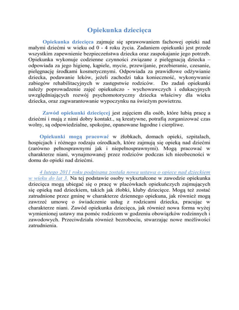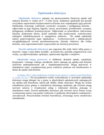 Opiekunka dziecięca Opiekunka dziecięca zajmuje się sprawowaniem fachowej opieki nad małymi dziećmi w wieku od 0 - 4 roku życia. Zadaniem opiekunki jest przede wszystkim zapewnienie bezpieczeństwa dziecka oraz zaspokajanie jego potrzeb. Opiekunka wykonuje codzienne czynności związane z pielęgnacją dziecka – odpowiada za jego higienę, kąpiele, mycie, przewijanie, przebieranie, czesanie, pielęgnację środkami kosmetycznymi. Odpowiada za prawidłowe odżywianie dziecka, podawanie leków, jeżeli zachodzi taka konieczność, wykonywanie zabiegów rehabilitacyjnych w zastępstwie rodziców. Do zadań opiekunki należy poprowadzenie zajęć opiekuńczo - wychowawczych i edukacyjnych uwzględniających rozwój psychomotoryczny dziecka właściwy dla wieku dziecka, oraz zagwarantowanie wypoczynku na świeżym powietrzu. Zawód opiekunki dziecięcej jest zajęciem dla osób, które lubią pracę a dziećmi i mają z nimi dobry kontakt., są kreatywne, potrafią zorganizować czas wolny, są odpowiedzialne, spokojne, opanowane łagodne i cierpliwe. Opiekunki mogą pracować w żłobkach, domach opieki, szpitalach, hospicjach i różnego rodzaju ośrodkach, które zajmują się opieką nad dziećmi (zarówno pełnosprawnymi jak i niepełnosprawnymi). Mogą pracować w charakterze niani, wynajmowanej przez rodziców podczas ich nieobecności w domu do opieki nad dziećmi. 4 lutego 2011 roku podpisana została nowa ustawa o opiece nad dzieckiem w wieku do lat 3. Na tej podstawie osoby wykształcone w zawodzie opiekunka dziecięca mogą ubiegać się o pracę w placówkach opiekuńczych zajmujących się opieką nad dzieckiem, takich jak żłobki, kluby dziecięce. Mogą też zostać zatrudnione przez gminę w charakterze dziennego opiekuna, jak również mogą zawrzeć umowę o świadczenie usług z rodzicami dziecka, pracując w charakterze niani. Zawód opiekunka dziecięca, jak również nowa forma wyżej wymienionej ustawy ma pomóc rodzicom w godzeniu obowiązków rodzinnych i zawodowych. Przeciwdziała również bezrobociu, stwarzając nowe możliwości zatrudnienia.
