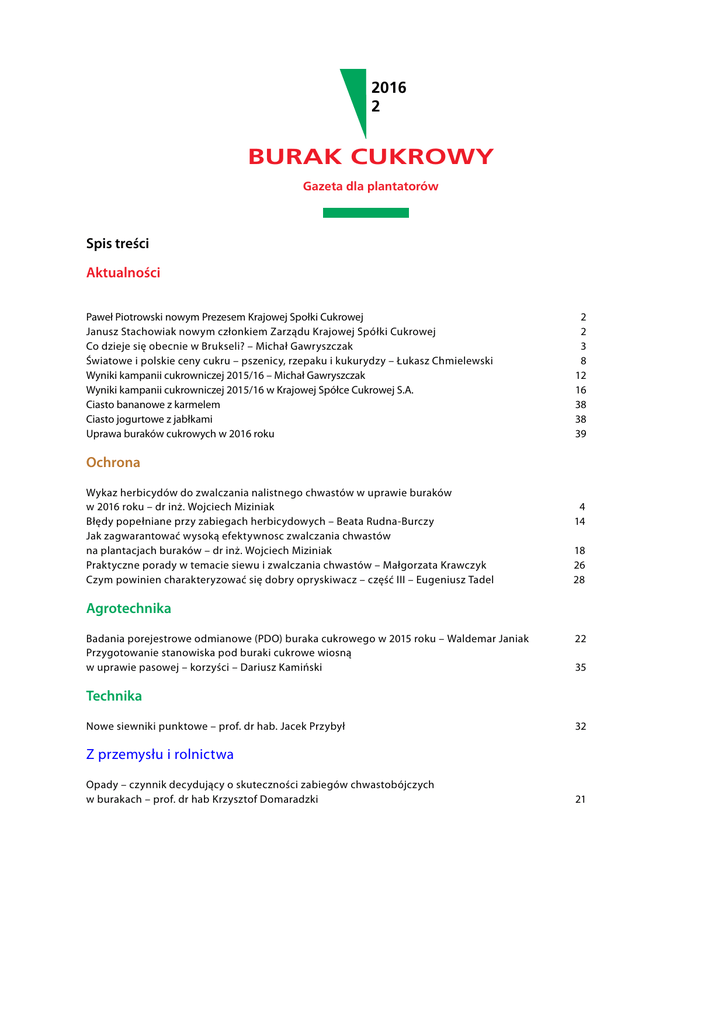 2016 2 Burak cuKROWy Gazeta dla plantatorów Spis treści Aktualności Paweł Piotrowski nowym Prezesem Krajowej Społki Cukrowej 2 Janusz Stachowiak nowym członkiem Zarządu Krajowej Spółki Cukrowej2 Co dzieje się obecnie w Brukseli? – Michał Gawryszczak 3 Światowe i polskie ceny cukru – pszenicy, rzepaku i kukurydzy – Łukasz Chmielewski 8 Wyniki kampanii cukrowniczej 2015/16 – Michał Gawryszczak 12 Wyniki kampanii cukrowniczej 2015/16 w Krajowej Spółce Cukrowej S.A. 16 Ciasto bananowe z karmelem 38 Ciasto jogurtowe z jabłkami 38 Uprawa buraków cukrowych w 2016 roku 39 Ochrona Wykaz herbicydów do zwalczania nalistnego chwastów w uprawie buraków w 2016 roku – dr inż. Wojciech Miziniak Błędy popełniane przy zabiegach herbicydowych – Beata Rudna-Burczy Jak zagwarantować wysoką efektywnosc zwalczania chwastów na plantacjach buraków – dr inż. Wojciech Miziniak Praktyczne porady w temacie siewu i zwalczania chwastów – Małgorzata Krawczyk Czym powinien charakteryzować się dobry opryskiwacz – część III – Eugeniusz Tadel 4 14 18 26 28 Agrotechnika Badania porejestrowe odmianowe (PDO) buraka cukrowego w 2015 roku – Waldemar Janiak Przygotowanie stanowiska pod buraki cukrowe wiosną w uprawie pasowej – korzyści – Dariusz Kamiński 22 35 Technika Nowe siewniki punktowe – prof. dr hab. Jacek Przybył 32 Z przemysłu i rolnictwa Opady – czynnik decydujący o skuteczności zabiegów chwastobójczych w burakach – prof. dr hab Krzysztof Domaradzki 21