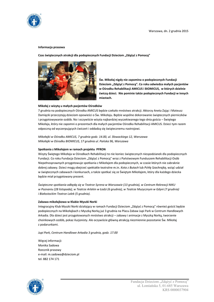Warszawa, dn. 2 grudnia 2015 Informacja prasowa Czas świątecznych atrakcji dla podopiecznych Fundacji Dzieciom „Zdążyć z Pomocą” Św. Mikołaj nigdy nie zapomina o podopiecznych Fundacji Dzieciom „Zdążyć z Pomocą”. Co roku odwiedza małych pacjentów w Ośrodku Rehabilitacji AMICUS i BIOMICUS, w których dzielnie ćwiczą dzieci. Nie pominie także podopiecznych Fundacji w innych miastach. Mikołaj z wizytą u małych pacjentów Ośrodków 7 grudnia na podopiecznych Ośrodka AMICUS będzie czekało mnóstwo atrakcji. Aktorzy Aneta Zając i Mateusz Damięcki przeczytają dzieciom opowieści o Św. Mikołaju. Będzie wspólne dekorowanie świątecznych pierniczków i przygotowywanie ozdób. No i oczywiście wizyta najbardziej wyczekiwanego tego dnia gościa – Świętego Mikołaja, który nie zapomni o prezentach dla małych pacjentów Ośrodka Rehabilitacji AMICUS. Dzieci tym razem odpoczną od wyczerpujących ćwiczeń i oddadzą się świątecznemu nastrojowi. Mikołajki w Ośrodku AMICUS, 7 grudnia godz. 14.00, ul. Słowackiego 12, Warszawa Mikołajki w Ośrodku BIOMICUS, 17 grudnia ul. Pańska 96, Warszawa Spotkania z Mikołajem w ramach projektu PFRON Wizyty Świętego Mikołaja w Ośrodkach Rehabilitacji to nie koniec świątecznych niespodzianek dla podopiecznych Fundacji. Co roku Fundacja Dzieciom „Zdążyć z Pomocą” wraz z Państwowym Funduszem Rehabilitacji Osób Niepełnosprawnych przygotowuje spotkania z Mikołajem dla podopiecznych, w czasie których nie zabraknie dobrej zabawy. Dzieci mogą obejrzeć spektakle teatralne m.in. Kota z Butach lub Pchłę Szachrajkę, wziąć udział w świątecznych zabawach i konkursach, a także spotkać się ze Świętym Mikołajem, który dla każdego dziecka będzie miał przygotowany prezent. Świąteczne spotkania odbędą się w Teatrze Syrena w Warszawie (13 grudnia), w Centrum Rekreacji NIKU w Poznaniu (28 listopada), w Teatrze Arlekin w Łodzi (6 grudnia), w Teatrze Muzycznym w Gdyni (7 grudnia) i Białostockim Teatrze Lalek (5 grudnia). Zabawa mikołajkowa w Klubie Myszki Norki Integracyjny Klub Myszki Norki działający w ramach Fundacji Dzieciom „Zdążyć z Pomocą” również gościć będzie podopiecznych na Mikołajkach z Myszką Norką już 3 grudnia na Placu Zabaw Jupi Park w Centrum Handlowych Arkadia. Dla dzieci jest przygotowanych mnóstwo atrakcji – zabawy i animacje z Myszką Norką, tworzenie choinkowych ozdób, pokaz iluzjonisty. Ale oczywiście główną atrakcją niezmiennie pozostanie Św. Mikołaj z podarunkami. Jupi Park, Centrum Handlowe Arkadia 3 grudnia, godz. 17.00 Więcej informacji: Monika Sadowa Rzecznik prasowy e-mail: [email protected] tel. 882 174 171 Fundacja Dzieciom „Zdążyć z Pomocą” ul. Łomiańska 5, 01-685 Warszawa KRS 0000037904