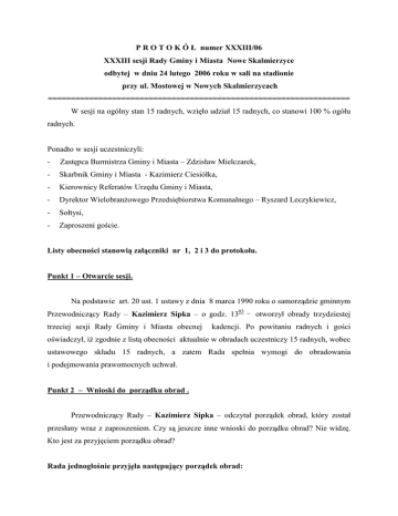 P R O T O K Ó Ł numer XXXIII/06 XXXIII sesji Rady Gminy i Miasta Nowe Skalmierzyce odbytej w dniu 24 lutego 2006 roku w sali na stadionie przy ul. Mostowej w Nowych Skalmierzycach ================================================================== W sesji na ogólny stan 15 radnych, wzięło udział 15 radnych, co stanowi 100 % ogółu radnych. Ponadto w sesji uczestniczyli: - Zastępca Burmistrza Gminy i Miasta – Zdzisław Mielczarek, - Skarbnik Gminy i Miasta - Kazimierz Ciesiółka, - Kierownicy Referatów Urzędu Gminy i Miasta, - Dyrektor WielobranŜowego Przedsiębiorstwa Komunalnego – Ryszard Leczykiewicz, - Sołtysi, - Zaproszeni goście. Listy obecności stanowią załączniki nr 1, 2 i 3 do protokołu. Punkt 1 – Otwarcie sesji. Na podstawie art. 20 ust. 1 ustawy z dnia 8 marca 1990 roku o samorządzie gminnym Przewodniczący Rady – Kazimierz Sipka – o godz. 1303 trzeciej sesji Rady Gminy i Miasta obecnej otworzył obrady trzydziestej kadencji. Po powitaniu radnych i gości oświadczył, iŜ zgodnie z listą obecności aktualnie w obradach uczestniczy 15 radnych, wobec ustawowego składu 15 radnych, a zatem Rada spełnia wymogi do obradowania i podejmowania prawomocnych uchwał. Punkt 2 – Wnioski do porządku obrad . Przewodniczący Rady – Kazimierz Sipka – odczytał porządek obrad, który został przesłany wraz z zaproszeniem. Czy są jeszcze inne wnioski do porządku obrad? Nie widzę. Kto jest za przyjęciem porządku obrad? Rada jednogłośnie przyjęła następujący porządek obrad: 2 1. Otwarcie posiedzenia. 2. Wnioski do porządku obrad. 3. Przyjęcie protokołu obrad XXXII sesji Rady. 4. Sprawozdanie z działalności Burmistrza w okresie międzysesyjnym. 5. Wnioski i zapytania radnych 6. Podjęcie uchwały w sprawie szczegółowych zasad przyznawania i odpłatności za usługi opiekuńcze oraz szczegółowych warunków częściowego lub całkowitego zwalniania od opłat i trybu ich pobierania świadczone przez Miejsko-Gminny Ośrodek Pomocy Społecznej w Nowych Skalmierzycach. 7. Podjęcie uchwały w sprawie ustalenia zasad ponoszenia odpłatności za korzystanie ze świadczeń w Środowiskowym Domu Samopomocy w Nowych Skalmierzycach. 8. Podjęcie uchwały w sprawie wyraŜenia zgody na udzielenie bonifikaty od opłaty za przekształcenie prawa uŜytkowania wieczystego w prawo własności. 9. Podjęcie uchwały w sprawie tworzenia preferencji dla przedsiębiorców zwiększających zatrudnienie i inwestujących na obszarze Gminy i Miasta Nowe Skalmierzyce oraz zwolnień w podatku od nieruchomości. 10. Podjęcie uchwały w sprawie przyjęcia programów pomocy dla przedsiębiorców zwiększających zatrudnienie i inwestujących na obszarze Gminy i Miasta Nowe Skalmierzyce. 11. Podjęcie uchwały w sprawie zmian w budŜecie Gminy i Miasta Nowe Skalmierzyce na rok 2006. 12. Podjęcie uchwały zmieniającej uchwałę w sprawie ustalenia odznaki – medalu „Za zasługi dla Ziemi Skalmierzyckiej”. 13. Sprawozdanie Komisji Rewizyjnej za swojej działalności w 2005 roku. 14. Odpowiedzi na wnioski i zapytania radnych. 15. Wolne głosy. 16. Zakończenie sesji. Projekt porządku obrad stanowi załącznik nr 4 do protokołu. 3 Punkt 3 – Przyjęcie protokołu obrad XXXII sesji Rady Gminy i Miasta. Zastępca Przewodniczącego Rady – Józef Marciniak – zaproponował przyjęcie protokołu bez odczytywania w sporządzonym brzmieniu. Protokół obrad XXXII sesji był wyłoŜony do wglądu w biurze rady oraz przed obradami dzisiejszej sesji i nie wniesiono do niego Ŝadnych uwag. Przewodniczący Rady – Kazimierz Sipka – kto jest za przyjęciem protokołu XXXII sesji bez odczytywania w sporządzonym brzmieniu? Rada Gminy i Miasta jednogłośnie przyjęła protokół obrad XXXII sesji. Pisemny wniosek do Rady o przyjęcie protokołu stanowi załącznik nr 5 do protokołu Punkt 4 – Sprawozdanie z działalności Burmistrza w okresie międzysesyjnym. Zastępca Burmistrza – Zdzisław Mielczarek – przedstawił sprawozdania: 1) z pracy Burmistrza Gminy i Miasta w okresie międzysesyjnym tj. od 29 grudnia do 24 lutego 2006 roku, 2) z realizacji uchwał podjętych na XXXII sesji Rady Gminy i Miasta Nowe Skalmierzyce w dniu 29 grudnia 2006 roku. Sprawozdania stanowią załącznik nr 6 i 7 do protokołu. Punkt 5 – Wnioski i zapytania radnych Radna – Ewa Pussak – mam kilka pytań, a mianowicie: 1) zbliŜa się koniec lutego i choć były mrozy chciałabym się dowiedzieć jak kończy się sprawa z Pupil Foods, który miał zainstalować urządzenia pochłaniające wydzielany przez zakład smród, 2) kończy się budowa targowiska i handlujący zostaną przeniesieni na nowy plac. Co stanie się z placem przy ul. Kaliskiej, 3) na ukończeniu jest rozbudowa i modernizacja Ośrodka Zdrowia, czy moŜliwe byłoby zorganizowanie specjalistycznej opieki lekarskiej: okulistycznej i chirurgicznej, 4) w Nowych Skalmierzycach są dwie krótkie drogi dojazdowe jednokierunkowe. Od ul. Kaliskiej jest postawiony znak: „Droga z pierwszeństwem przejazdu”, a od strony Kalisza znak: „Uwaga na ul. jednokierunkową” Kierowcy jeŜdŜą tam bardzo szybko i naleŜałoby poprawić bezpieczeństwo ruchu na tym odcinku. 4 Radny – Stanisław Cierniak – zostałem upowaŜniony przez sołtysów jak równieŜ sam jestem sołtysem i mam pytanie na jakiej podstawie sołtysi zostali wykluczeni z roznoszenia nakazów płatniczych. Mieszkańcy są zaskoczeni tym, Ŝe sołtysi ich nie roznoszą. W gminach: Ostrów Wlkp. oraz Gołuchów nakazy roznosili sołtysi. Jeśli w tym zakresie obowiązuje ustawa, to powinna obowiązywać w całej Polsce, a mnie się wydaje, Ŝe najbardziej tych ustaw przestrzega gmina Nowe Skalmierzyce. Czy to jest taniej, Ŝe poszli urzędnicy? Skarbnik – Kazimierz Ciesiółka – jest taniej, poniewaŜ ordynacja podatkowa mówi wyraźnie, Ŝe nakazy powinny być wysłane pocztą za potwierdzeniem odbioru. Taki list kosztuje 6, 50 zł. W ustawie dodano, Ŝe