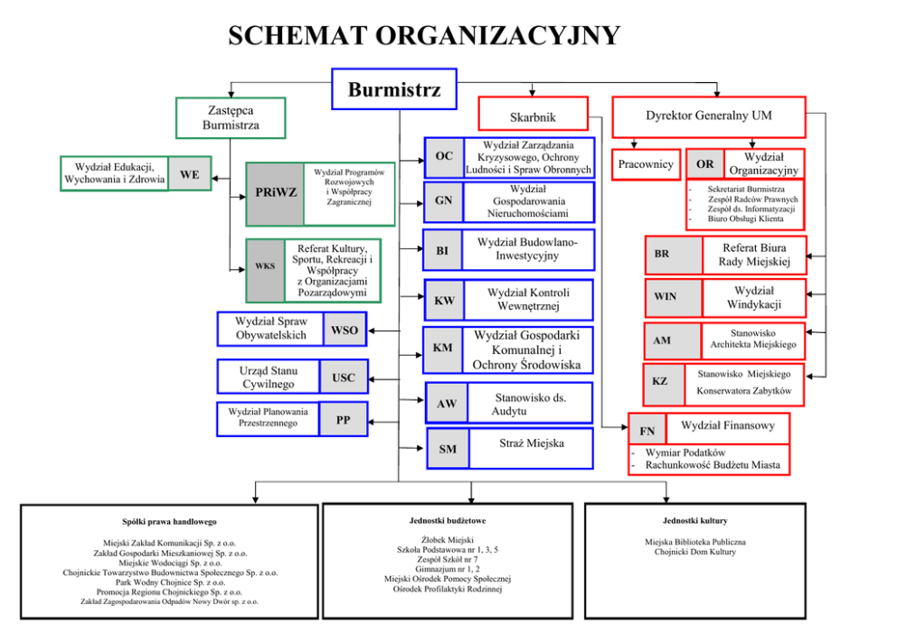 SCHEMAT ORGANIZACYJNY Burmistrz Zastępca Burmistrza Wydział Edukacji, Wychowania i Zdrowia Skarbnik WE PRiWZ WKS Wydział Programów Rozwojowych i Współpracy Zagranicznej Referat Kultury, Sportu, Rekreacji i Współpracy z Organizacjami Pozarządowymi Wydział Spraw Obywatelskich Urząd Stanu Cywilnego Wydział Planowania Przestrzennego OC Wydział Zarządzania Kryzysowego, Ochrony Ludności i Spraw Obronnych GN Wydział Gospodarowania Nieruchomościami BI Wydział BudowlanoInwestycyjny KW Wydział Kontroli Wewnętrznej KM Wydział Gospodarki Komunalnej i Ochrony Środowiska WSO USC Dyrektor Generalny UM Pracownicy - BR WIN AM KZ AW PP SM Stanowisko ds. Audytu Straż Miejska FN Wydział Organizacyjny OR Sekretariat Burmistrza Zespół Radców Prawnych Zespół ds. Informatyzacji Biuro Obsługi Klienta Referat Biura Rady Miejskiej Wydział Windykacji Stanowisko Architekta Miejskiego Stanowisko Miejskiego Konserwatora Zabytków Wydział Finansowy - Wymiar Podatków - Rachunkowość Budżetu Miasta Spółki prawa handlowego Jednostki budżetowe Jednostki kultury Miejski Zakład Komunikacji Sp. z o.o. Zakład Gospodarki Mieszkaniowej Sp. z o.o. Miejskie Wodociągi Sp. z o.o. Chojnickie Towarzystwo Budownictwa Społecznego Sp. z o.o. Park Wodny Chojnice Sp. z o.o. Promocja Regionu Chojnickiego Sp. z o.o. Żłobek Miejski Szkoła Podstawowa nr 1, 3, 5 Zespół Szkół nr 7 Gimnazjum nr 1, 2 Miejski Ośrodek Pomocy Społecznej Ośrodek Profilaktyki Rodzinnej Miejska Biblioteka Publiczna Chojnicki Dom Kultury Zakład Zagospodarowania Odpadów Nowy Dwór sp. z o.o.