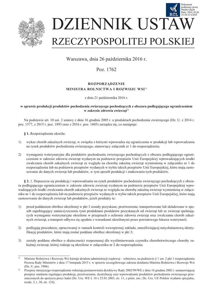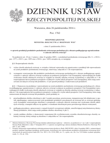 Dokument podpisany przez Marek Głuch Data: 2016.10.26 15:38:33 CEST DZIENNIK USTAW RZECZYPOSPOLITEJ POLSKIEJ Warszawa, dnia 26 października 2016 r. Poz. 1762 ROZPORZĄDZENIE MINISTRA ROLNICTWA I ROZWOJU WSI 1) z dnia 21 października 2016 r. w sprawie produkcji produktów pochodzenia zwierzęcego pochodzących z obszaru podlegającego ograniczeniom w zakresie zdrowia zwierząt2) Na podstawie art. 10 ust. 2 ustawy z dnia 16 grudnia 2005 r. o produktach pochodzenia zwierzęcego (Dz. U. z 2014 r. poz. 1577, z 2015 r. poz. 1893 oraz z 2016 r. poz. 1605) zarządza się, co następuje: § 1. Rozporządzenie określa: 1) wykaz chorób zakaźnych zwierząt, w związku z którymi wprowadza się ograniczenia w produkcji lub wprowadzaniu na rynek produktów pochodzenia zwierzęcego, stanowiący załącznik nr 1 do rozporządzenia; 2) wymagania weterynaryjne dla produktów pochodzenia zwierzęcego pochodzących z obszaru podlegającego ograniczeniom w zakresie zdrowia zwierząt wydanym na podstawie przepisów Unii Europejskiej wprowadzających środki zwalczania chorób zakaźnych zwierząt ze względu na chorobę zakaźną zwierząt wymienioną w załączniku nr 1 do rozporządzenia lub na podstawie przepisów wydanych w trybie takich przepisów Unii Europejskiej, które mają zastosowanie do danych zwierząt lub produktów, w tym sposób produkcji i znakowania tych produktów. § 2. 1. Dopuszcza się produkcję i wprowadzanie na rynek produktów pochodzenia zwierzęcego pochodzących z obszaru podlegającego ograniczeniom w zakresie zdrowia zwierząt wydanym na podstawie przepisów Unii Europejskiej wprowadzających środki zwalczania chorób zakaźnych zwierząt ze względu na chorobę zakaźną zwierząt wymienioną w załączniku nr 1 do rozporządzenia lub na podstawie przepisów wydanych w trybie takich przepisów Unii Europejskiej, które mają zastosowanie do danych zwierząt lub produktów, jeżeli produkty te: 1) przed poddaniem obróbce określonej w pkt 3 zostały pozyskane, przetworzone, transportowane lub składowane w sposób zapobiegający zanieczyszczeniu tymi produktami produktów pozyskanych od zwierząt lub ze zwierząt spełniających wymagania weterynaryjne określone w przepisach o ochronie zdrowia zwierząt oraz zwalczaniu chorób zakaźnych zwierząt, a transport odbywa się zgodnie z warunkami określonymi przez powiatowego lekarza weterynarii; 2) podlegają procedurze, opracowanej w ramach kontroli wewnętrznej zakładu, umożliwiającej natychmiastową identyfikację produktów, które mają zostać poddane obróbce określonej w pkt 3; 3) zostały poddane obróbce o skuteczności rozpoznanej dla wyeliminowania czynnika chorobotwórczego choroby zakaźnej zwierząt, której rodzaje są określone w załączniku nr 2 do rozporządzenia. 1) 2) Minister Rolnictwa i Rozwoju Wsi kieruje działem administracji rządowej – rolnictwo, na podstawie § 1 ust. 2 pkt 1 rozporządzenia Prezesa Rady Ministrów z dnia 17 listopada 2015 r. w sprawie szczegółowego zakresu działania Ministra Rolnictwa i Rozwoju Wsi (Dz. U. poz. 1906). Przepisy niniejszego rozporządzenia wdrażają postanowienia dyrektywy Rady 2002/99/WE z dnia 16 grudnia 2002 r. ustanawiającej przepisy sanitarne regulujące produkcję, przetwarzanie, dystrybucję oraz wprowadzanie produktów pochodzenia zwierzęcego przeznaczonych do spożycia przez ludzi (Dz. Urz. WE L 18 z 23.01.2003, str. 11, z późn. zm.; Dz. Urz. UE Polskie wydanie specjalne, rozdz. 3, t. 38, str. 124). Dziennik Ustaw –2– Poz. 1762 2. Obróbkę produktów pochodzenia zwierzęcego, o której mowa w ust. 1 pkt 3, przeprowadza zakład, który: 1) dysponuje technologią umożliwiającą przeprowadzenie tej obróbki; 2) został wyznaczony przez powiatowego lekarza weterynarii, w drodze decyzji, do przeprowadzenia tej obróbki. § 3. 1. Świeże mięso pochodzące z obszaru podlegającego ograniczeniom w zakresie zdrowia zwierząt wydanym na podstawie przepisów Unii Europejskiej wprowadzających środki zwalczania chorób zakaźnych zwierząt ze względu na chorobę zakaźną zwierząt wymienioną w załączniku nr 1 do rozporządzenia lub na podstawie przepisów wydanych w trybie takich przepisów Unii Europejskiej, pozyskane od zwierząt, do których mają zastosowanie te ograniczenia, znakuje się specjalnym znakiem jakości zdrowotnej, który: 1) ma kształt owalny o szerokości 6,5 cm oraz wysokości 4,5 cm i zawiera informację pozwalającą na identyfikację urzędowego lekarza weterynarii przeprowadzającego badanie mięsa oraz: a) w górnej części – litery PL, b) na środku – weterynaryjny numer identyfikacyjny zakładu, c) w dolnej części – litery WE – przy czym wysokość liter PL oraz WE wynosi co najmniej 0,8 cm, a wysokość weterynaryjnego numeru identyfikacyjnego zakładu – co najmniej 1 cm; 2) przestemplowuje się znakiem składającym się z 2 linii ukośnych przecinających się pod kątem prostym, z punktem skrzyżowania w środku pieczęci, tak aby informacje zawarte w tym znaku były czytelne; 3) jest nanoszony przez urzędowego lekarza weterynarii lub pod jego bezpośrednim nadzorem. 2. Powiatowy lekarz weterynarii prowadzi, na podstawie danych zawartych w specjalnym znaku jakości zdrowotnej, wykaz zawierający informacje pozwalające na identyfikację urzędowego lekarza weterynarii, który przeprowadził badanie mięsa, o którym mowa w ust. 1. § 4. Traci moc rozporządzenie Ministra Rolnictwa i Rozwoju Wsi z dnia 16 września 2010 r. w sprawie produkcji produktów pochodzenia zwierzęcego pochodzących z obszarów podlegających ograniczeniom, nakazom lub zakazom (Dz. U. z 2015 r. poz. 391). § 5. Rozporządzenie wchodzi w życie z dniem następującym po dniu ogłoszenia. Minister Rolnictwa i Rozwoju Wsi: K. Jurgiel Dziennik Ustaw –3– Poz. 1762 Załączniki do rozporządzenia Ministra Rolnictwa i Rozwoju Wsi z dnia 21 października 2016 r. (poz. 1762) Załącznik nr 1 WYKAZ CHORÓB ZAKAŹNYCH ZW