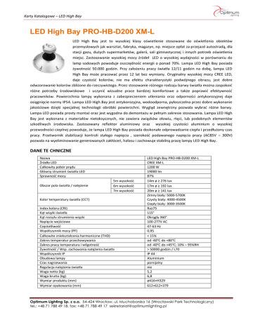 Karty Katalogowe – LED High Bay LED High Bay PRO-HB-D200 XM-L LED High Bay jest to wysokiej klasy oświetlenie stosowane do oświetlenia obiektów przemysłowych jak warsztat, fabryka, magazyn, np. miejsce opłat za przejazd autostradą, dla stacji gazu, dużych supermarketów, galerii, sali gimnastycznej i innych potrzeb oświetlenia miejsc. Zastosowanie wysokiej mocy źródeł LED o wysokiej wydajności w porównaniu do lamp sodowych powoduje oszczędność energii o ponad 70%. Lampa LED High Bay posiada żywotność 50.000 godzin. Przy założeniu pracy światła 12/11 godzin na dobę, lampa LED High Bay może pracować przez 12 lat bez wymiany. Oryginalny wysokiej mocy CREE LED, daje czystość kolorów, nie ma efektu charakterystyki podwójnego obrazu, jest dobre odwzorowanie kolorów zbliżone do rzeczywistego. Przez stosowanie różnego rodzaju barwy światła można zaspokoić różne potrzeby środowiskowe i uczynić wizualne prace bardziej komfortowe a także poprawić efektywność pracowników. Powierzchnia lampy wykonana z zabezpieczeniem utleniania oraz odporności antykorozyjnej daje osiągnięcie normy IP54. Lampa LED High Bay jest antykorozyjna, wodoodporna, pyłoszczelna przez dobre wykonanie jakościowe dzięki specjalnej technologii obróbki powierzchni. Wygląd zewnętrzny pozwala wybrać różne barwy. Lampa LED posiada prosty montaż oraz jest wygodna do demontażu w pełnym zakresie stosowania. Lampa LED High Bay jest wykonana z materiałów nietoksycznych, nie zawiera związków ołowiu, rtęci, lub podobnych elementów szkodliwych środowiska. Zastosowany reflektor aluminiowy oraz wysokiej czystości aluminium o wysokiej przewodności cieplnej powoduje, że lampa LED High Bay posiada doskonałe odprowadzanie ciepła i przedłużony czas pracy. Przetwornik stabilizacji kontroli stałego napięcia , szerokość podawanego napięcia pracy (AC85V – 300V) pozwala na wyeliminowanie generowanych zakłóceń, hałasu i zachowuje stabilną pracę lampy LED High Bay . DANE TE CHNICZNE Nazwa Źródło LED Całkowity pobór prądu Główny strumień światła LED Sprawność mocy Obszar pola światła / natężenie 5m wysokość 6m wysokość 7m wysokość Kolor temperatury światła (CCT) Index koloru (CRI) Kąt wiązki światła Kąt rozsyłu strumienia wiązki Napięcie wejściowe Częstotliwość Współczynnik mocy (PF) Całkowite zniekształcenia harmoniczne (THD) Zakres temperatur przechowywania Zakres pracy temperatura i wilgotność Żywotność / Wsp. zachowania natężenia światła Współczynnik IP Obudowa lampy Czas nagrzewania Regulacja natężenia światła Waga netto (kg) Waga brutto (kg) Wymiar produktu (mm) Wymiar opakowania (mm) LED High Bay PRO-HB-D200 XM-L CREE XM-L 1200 W 19000 lm 87% 14m ø ≥ 276 lux 17m ø ≥ 192 lux 20m ø ≥ 141 lux Zimny biały: 5000-5700K Czysty biały: 4000-4500K Ciepły biały: 3000-3500K Ra≥75 115° Okrągły 360° 100-277V AC 47-63 Hz 0,95 < 15% od -40℃ do +80℃ od -40℃ do +45℃; 10% – 95%RH > 50000 godzin / L70 IP 44 Aluminium pomijalny nie 5,2 6,8 ø416×H329 612×612×379 Optimum Lighting Sp. z o.o. 54-424 Wrocław, ul. Muchoborska 16 (Wrocławski Park Technologiczny) tel.: +48 71 788 49 18, fax: +48 71 788 49 17 [email protected]