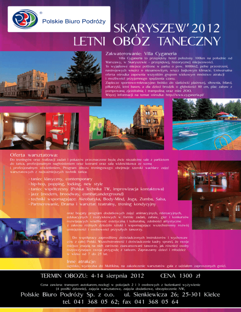SKARYSZEW’ 2012 LETNI OBÓZ TANECZNY Zakwaterowanie: Villa Cyganeria Villa Cyganeria to przepiękny hotel położony 100km na południe od Warszawy, w Skaryszewie - przepięknej, historycznej miejscowości. To wyjątkowe miejsce połżone w parku o pow. 8000m2, pełne przestrzeni, nastrojowych wnętrz o niesamowitym, wręcz bajkowym klimacie. Uniwersalna oferta ośrodka zapewnia wszystkim grupom wiekowym mnóstwo atrakcji i możliwości przyjemnego spędzenia czasu. Zaplecze sportowo-rekreacyjne: boisko do siatkówki plażowej, siłownia, bilard, piłkarzyki, letni basen, a dla dzieci brodzik o głębokości 80 cm, plac zabaw z pompowaną zjeżdżalnią i trampoliną oraz mini ZOO. Więcej informacji na temat ośrodka: http://www.cyganeria.pl/ PROJEKT I DRUK - VERSOREKLAMY 501373151 Oferta warsztatowa: Do treningów oraz realizacji zadań i pokazów przeznaczone będą dwie niezależne sale z parkietem do tańca, profesjonalnym nagłośnieniem oraz lustrami oraz sala widowiskowa ze sceną i profesjonalnym oświetleniem. Program obozu treningowego obejmuje szeroki wachlarz zajęć warsztatowych z najważniejszych technik tańca: - taniec klasyczny, contemporary - hip-hop, popping, locking, new style - taniec współczesny (Polska Technika TW, improwizacja kontaktowa) - jazz (modern, broodway, combat,underground) - techniki wspomagające: Akrobatyka, Body-Mind, Joga, Zumba, Salsa, - Partnerowanie, Drama i warsztat teatralny, trening kondycyjny oraz bogaty program dodatkowych zajęć animacyjnych, rekreacyjnych, edukacyjnych i rozrywkowych w formie zadań, zabaw, gier i konkursów rozwijających wrażliwość estetyczną i kulturalną, zdolności artystyczne z zakresu różnych dziedzin sztuki i wspomagające wszechstronny rozwój umiejętności i osobowości przyszłych tancerzy. Do współpracy zaprosiliśmy doświadczonych instruktorów i wychowaw ców z całej Polski. Wszechstronność i doświadczenie kadry sprawi, że swoje miejsce znajdą na nich zarówno zaawansowani tancerze, jak również osoby rozpoczynające swoja przygodę z tańcem. Zapraszamy dzieci i młodzież w wieku od 7 do 25 lat. Inne atrakcje: ognisko, wycieczka do Multikina, na zakończenie warsztatów gala z udziałem zaproszonych gości. TERMIN OBOZU: 4-14 sierpnia 2012 CENA 1300 zł Cena zawiera: transport autokarem, noclegi w pokojach 2 i 3 osobowych z łazienkami wyżywienie (4 posiłki dziennie), zajęcia warsztatowe, zajęcia dodatkowe, ubezpieczenie NW, Polskie Biuro Podróży Sp. z o.o. ul. Sienkiewicza 26; 25-301 Kielce tel. 041 368 05 62; fax 041 368 05 64