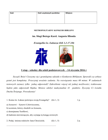 Kod: Ilość uzyskanych punktów: Miejsce: METROPOLITARNY KONKURS BIBLIJNY im. Sługi Bożego Kard. Augusta Hlonda Ewangelia św. Łukasza (ŁK 1,1-17,10) I etap - szkolny dla szkół podstawowych - 14 stycznia 2016 r Szczęść Boże! Cieszymy się i gratulujemy udziału w Konkursie Biblijnym. Sprawdź czy arkusz pytań jest kompletny. Przeczytaj uważnie zadania. Na rozwiązanie masz 60 minut. W zadaniach testowych zaznacz tylko jedną odpowiedź! Zakreślenie więcej niż jednej możliwości, traktowane będzie jako odpowiedź błędna. Możesz zdobyć maksymalnie 41 punktów. Życzymy Ci światła Ducha Świętego. Powodzenia! 1. Komu św. Łukasz poświęca swoją Ewangelię? (Łk 1, 3) 1 p. a) Jezusowi – Synowi Człowieczemu, b) uczniom, którzy chodzili za Jezusem, c) dostojnemu Teofilowi, d) ludziom niewierzącym, aby czytając tę księgę uwierzyli. 2. Podaj imiona rodziców Jana Chrzciciela. (Łk 1, 5) ........................................................................................... 2 p. 3. W której z opisanych sytuacji Zachariasz dowiedział się, że żona urodzi mu syna? (Łk 1, 9-1) 1 p. a) gdy przy ołtarzu składał ofiarę kadzenia, b) anioł powiedział mu o tym podczas snu, c) gdy żona wróciła od lekarza, d) powiedział mu to prorok Izajasz. 4. Ile miesięcy Maryja pozostała u Elżbiety, aby jej pomagać przed narodzeniem dziecka? (Łk 1, 56) a) około 1 miesiąca, b) około 5 miesięcy, c) około 9 miesięcy, d) około 3 miesiące. 5. Kim był Kwiryniusz? (Łk 2, 2) 1 p. a) ogrodnikiem, który pielęgnował figowiec, b) człowiekiem opętanym przez złe duchy, c) właścicielem gospody w Betlejem, d) wielkorządcą Syrii. 6. W jakiej krainie znajdowało się miasto Betlejem? (Łk 2, 4) 1 p. a) w Samarii, b) w Judei, c) w Galilei, d) nad Jordanem. 7. Jaką ofiarę Maryja i Józef mieli złożyć Panu Bogu podczas ofiarowania Jezusa w świątyni? (Łk 2, 24) a) dwa młode gołębie, b) parę synogarlic albo dwa młode gołębie, c) młodego baranka, d) plony ziemi. 8. W jaki sposób prorokini Anna służyła Panu Bogu? (Łk 2, 37) 1 p. 1 p. a) przez śpiewanie psalmów, b) przez sprzątanie świątyni, c) przez post i modlitwę, d) przez czytanie ksiąg prorockich. 9. Czym byli zdumieni wszyscy, którzy słuchali 12-letniego Jezusa w Jeruzalem? (Łk 2, 47) a) samodzielnością w tak młodym wieku, b) wysokim poziomem kultury, c) urodą i wysokim wzrostem, d) bystrością Jego umysłu i odpowiedziami. 1 p. 1 p. 10. Na jakim terenie Jan Chrzciciel głosił chrzest nawrócenia dla odpuszczenia grzechów? (Łk 3,3) a) na pustyni judzkiej, b) nad jeziorem Genezaret, c) nad Jordanem, d) na Górze Oliwnej. 1 p. 11. Tłumy ludzi, które chciały przyjąć chrzest Janowy, pytały Jana Chrzciciela "Cóż więc mamy czynić?" Komu Jan tak odpowiedział? a) "Nie pobierajcie nic ponad to, co wam wyznaczono". (Łk 3, 12 - 13) ...................................................................... 1 p. b) "Na nikim pieniędzy nie wymuszajcie i nikogo nie uciskajcie, lecz poprzestawajcie na waszym żołdzie" .(Łk 3, 14) .......................................................... 1 p. 12. Na co chorował Syryjczyk Naaman? (Łk 4, 27) 1 p. a) miał w sobie ducha nieczystego, b) miał uschłą rękę, c) był trędowaty, d) był paralitykiem. 13. Do kogo należała łódź, z której Pan Jezus nauczał tłumy ludzi nad Jeziorem Genezaret? (Łk 5,3) a) do Szymona Piotra, b) do Szymona Gorliwego, c) do Szymona faryzeusza, d) do Szymona z Cyreny. 1 p. 14. Kogo setnik z Kafarnaum wysłał do Pana Jezusa z prośbą, aby przyszedł i uzdrowił chorego sługę? (Łk 7, 3) 1 p. a) innego zdrowego sługę, b) sam poszedł prosić o uzdrowienie sługi, c) jednego z uczniów Jezusa, d) starszyznę żydowską. 15. W domu Szymona faryzeusza Pan Jezus opowiadał o 2 dłużnikach. ( Łk 7,41 ) Ile wynosił ? a) dług pierwszego dłużnika .................................................................... 1 p. b) dług drugiego dłużnika ....................................................................... 1 p. 16. Czym były zajęte siostry Łazarza: Marta i Maria, podczas gdy przebywał u nich Jezus? (Łk 10, 38-40) a) Marta ......................................................................................................................... ..................................................................................................................... 1 p. b) Maria ........................................................................................................................ ...................................................................................................................... 1 p. 17. Jakie pytanie zadał Jezus swoim uczniom, którzy bali się burzy na jeziorze? (Łk 8,25) a) Dlaczego się boicie? b) Gdzie jest wasza wiara? c) Czy umiecie pływać? d) Co my teraz zrobimy? 18. Kto został uzdrowiony, gdy dotknął frędzli u płaszcza Jezusa? (Łk 8, 44) 1 p. 1 p. a) kobieta cierpiąca na upływ krwi, b) człowiek chory na wodną puchlinę, c) młodzieniec z Nain, d) kobieta, która 18 lat miała ducha niemocy. 19. Które z wymienionych zachowań NIE dotyczy miłosiernego Samarytanina? (Łk 10, 30-37) 1 p. a) podszedł do pobitego człowieka, zostawionego na drodze, b) zawołał innych ludzi do pomocy, c) opatrzył rany poszkodowanego, d) zapłacił 2 denary gospodarzowi, który go pielęgnował. 20.Pan Jezus ostrzegał tłumy ludzi, które chodziły za Nim przed kwasem faryzeuszów. Przed czym ostrzegał? (Łk 12, 1) 1 p. a) przed ich błędnymi naukami, b) przed ich ciągłymi wojnami, c) przed ich chciwością bogactwa, d) przed ich obłudą postępowania. 21.Wymień 3 przypowieści Pana Jezusa, w których naucza o Bożym przebaczeniu i radości z powodu jednego grzesznika, który się nawraca. (Łk 15, 1 – 32) a) ...................................................................................................................... 1 p. b) ....