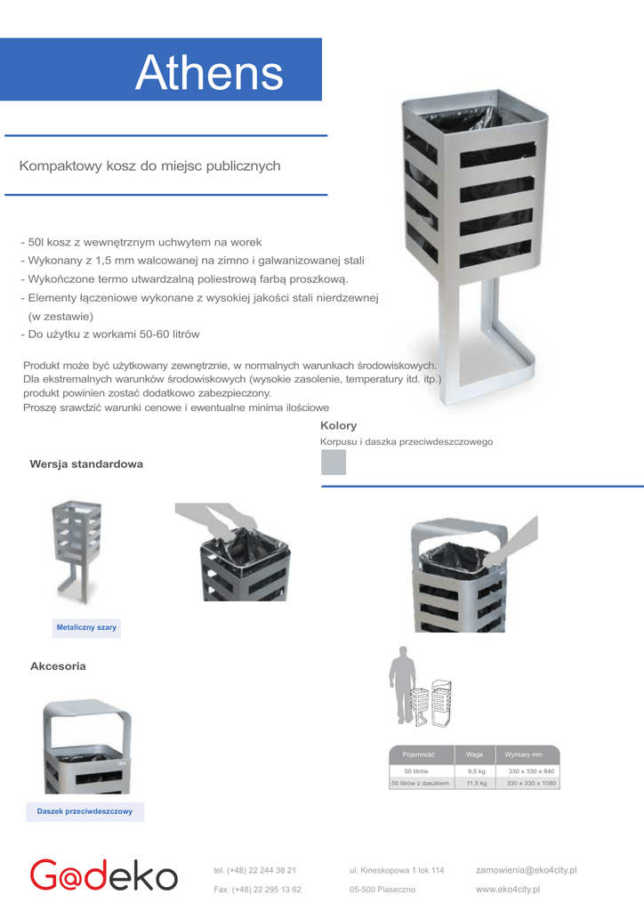 Athens Kompaktowy kosz do miejsc publicznych - 50l kosz z wewnętrznym uchwytem na worek - Wykonany z 1,5 mm walcowanej na zimno i galwanizowanej stali - Wykończone termo utwardzalną poliestrową farbą proszkową. - Elementy łączeniowe wykonane z wysokiej jakości stali nierdzewnej (w zestawie) - Do użytku z workami 50-60 litrów Produkt może być użytkowany zewnętrznie, w normalnych warunkach środowiskowych. Dla ekstremalnych warunków środowiskowych (wysokie zasolenie, temperatury itd. itp.) produkt powinien zostać dodatkowo zabezpieczony. Proszę srawdzić warunki cenowe i ewentualne minima ilościowe Kolory Korpusu i daszka przeciwdeszczowego Wersja standardowa Metaliczny szary Akcesoria Pojemność 50 litrów 50 litrów z daszkiem Waga Wymiary mm 9,5 kg 330 x 330 x 840 11,5 kg 330 x 330 x 1080 Daszek przeciwdeszczowy tel. (+48) 22 244 38 21 ul. Kineskopowa 1 lok 114 [email protected] Fax. (+48) 22 295 13 62 05-500 Piaseczno www.eko4city.pl