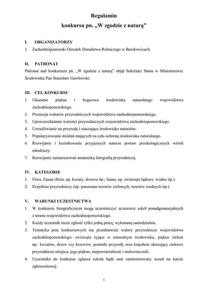 Regulamin konkursu pn. „W zgodzie z naturą” I. 1. II. ORGANIZATORZY Zachodniopomorski Ośrodek Doradztwa Rolniczego w Barzkowicach. PATRONAT Patronat nad konkursem pn. „W zgodzie z naturą” objął Sekretarz Stanu w Ministerstwie Środowiska Pan Stanisław Gawłowski. III. CEL KONKURSU 1. Ukazanie piękna i bogactwa środowiska naturalnego województwa zachodniopomorskiego. 2. Promocja walorów przyrodniczych województwa zachodniopomorskiego. 3. Upowszechnianie wartości przyrodniczych województwa zachodniopomorskiego. 4. Uwrażliwianie na przyrodę i otaczające środowisko naturalne. 5. Popularyzowanie działań mających na celu ochronę środowiska naturalnego. 6. Rozwijanie i kształtowanie przyjaznych naturze postaw proekologicznych wśród młodzieży. 7. Rozwijanie zainteresowań amatorską fotografią przyrodniczą. IV. KATEGORIE 1. Flora, Fauna (flora, np. kwiaty, drzewa itp.; fauna, np. zwierzęta lądowe, wodne itp.). 2. Krajobraz przyrodniczy (np. panorama terenów zielonych, terenów wodnych itp.). V. 1. WARUNKI UCZESTNICTWA W konkursie fotograficznym mogą uczestniczyć uczniowie szkół ponadgimnazjalnych z terenu województwa zachodniopomorskiego. 2. Każdy uczestnik może zgłosić tylko jedną pracę, wykonaną samodzielnie. 3. Tematyka prac konkursowych ma przedstawiać walory przyrodnicze województwa zachodniopomorskiego: zwierzęta żyjące w naturalnym środowisku, piękno zieleni np.: kwiatów, drzew czy krzewów, pomniki przyrody oraz krajobraz ukazujący ciekawe przyrodniczo miejsca, jego piękno, niepowtarzalność i malowniczość. 4. Uczestnika do konkursu zgłasza szkoła bądź sam zainteresowany uczeń na karcie zgłoszeniowej. 1 Regulamin konkursu pn. „W zgodzie z naturą” 5. Uczestnik konkursu składając swój podpis na karcie zgłoszenia jednocześnie oświadcza, że: posiada pełnie praw autorskich i przenosi nieodpłatnie na rzecz Organizatora zgodnie z Ustawą z dnia 4 lutego 1994 r. o prawie autorskim i prawach pokrewnych (Dz. U. z 2006 r. Nr 90, poz. 631, z późn. zm.) prawa majątkowe do zgłoszonej przez niego fotografii, w tym w szczególności w zakresie wykorzystywania ich do druku, wystawiana na wystawie pokonkursowej, udostępniania na stronach internetowych Organizatorów oraz wszelkich materiałach promocyjnych i reklamowych bez względu na sposób ich zwielokrotnienia i wprowadzenia do obrotu. wyraża zgodę na przetwarzanie przez Organizatora swoich danych osobowych na potrzeby Konkursu, w zakresie koniecznym do prawidłowego przeprowadzenia Konkursu (ustawa z dnia 29 sierpnia 1997 r. o ochronie danych osobowych (Dz. U. z 2002 r. Nr 101, poz. 926, z późn. zm.). W przypadku osób niepełnoletnich oświadczenie podpisuje rodzic lub opiekun. 6. Prace zgłaszane do konkursu powinny być przekazane w formie wydruku o formacie A4 na papierze fotograficznym o rozdzielczości 300 dpi oraz wersję cyfrową zamieszczoną na płycie CD. 7. Zarówno zdjęcia, jak i płyta CD powinny być opatrzone informacją zawierającą następujące dane: imię i nazwisko, adres zamieszkania, nazwę i adres szkoły. 8. Do każdego zdjęcia należy dołączyć notatkę informacyjną zawierającą: tytuł fotografii, opis miejsca uwzględniając powiat, gminę, miejscowość, datę wykonania fotografii, opis fotografii. 9. Do konkursu fotograficznego mogą być zgłaszane zdjęcia kolorowe i czarno-białe, wykonane aparatami cyfrowymi oraz analogowymi. Zabrania się fotomontażu. 10. Organizatorzy konkursu fotograficznego zastrzegają sobie prawo do wyłączenia z udziału w konkursie fotograficznym przekazanych fotografii niezgodnych z warunkami konkursu lub niskiej jakości technicznej. 2 Regulamin konkursu pn. „W zgodzie z naturą” VI. WARUNKI UCZESTNICTWA 1. Ogłoszenie konkursu fotograficznego nastąpi 11 czerwca 2012 roku w prasie o zasięgu wojewódzkim oraz na stronie internetowej Organizatora. 2. Informacja o realizowanym konkursie zostanie przekazana do Zachodniopomorskiego Kuratorium Oświaty w Szczecinie, celem rozesłania informacji do wszystkich szkół ponadgimnazjalnych w województwie zachodniopomorskim. 3. Formularz zgłoszenia wraz z zgłoszoną praca konkursową, notatką informacyjną i płytą CD należy przesyłać do 20 lipca 2012 r. na adres: Zachodniopomorski Ośrodek Doradztwa Rolniczego w Barzkowicach 73 – 134 Barzkowice z dopiskiem: Konkurs pn. „W zgodzie z naturą” 4. Ocena prac nadesłanych na konkurs fotograficzny przez Komisję konkursową nastąpi do 31 lipca 2012 r. 5. Zawiadomienie o werdykcie Komisji Konkursowej ogłoszone zostanie do 10 sierpnia 2012 roku na stronie Zachodniopomorskiego Ośrodka Doradztwa Rolniczego w Barzkowicach - www.zodr.pl w zakładce KONKURSY. 6. Zwycięzcy zostaną powiadomieni indywidualnie i zaproszeni na uroczyste podsumowanie. 7. Uroczyste podsumowanie konkursu fotograficznego połączone z otwarciem wystawy prezentującej nagrodzone prace oraz wręczeniem nagród, odbędzie się podczas XXV Barzkowickich Targów Rolnych „Agro Pomerania 2012” w Barzkowicach. 8. Z nagrodzonych i wyróżnionych zdjęć zostanie wydany album. VII. OCENA PRAC KONKURSOWYCH 1. Do podstawowych zadań Komisji Konkursowej należy: 3 Regulamin konkursu pn. „W zgodzie z naturą” ocena zgłoszonych do konkursu fotografii pod względem formalnym, zgodnie z warunkami określonymi w Regulaminie konkursu, ocena zgłoszonych do konkursu fotografii, spełniających wymogi formalne, wyłonienie indywidualnych laureatów w kategorii „Flora, Fauna”, ze wskazaniem zdobywców pierwszego, drugiego i trzeciego miejsca oraz wyróżnienia, wyłonienie indywidualnych laureatów w kategorii „Krajobraz przyrodniczy”, ze wskazaniem zdobywców pierwszego, drugiego i trzeciego miejsca oraz wyróżnienia. 2. Przy ocenie zdjęć Komisja Konkursowa uwzględnia następujące kryteria: zgodność przedstawionego na zdjęciu obrazu z tematem konkursu, jakość techniczną i poziom artystyczny zdjęcia. VIII. 