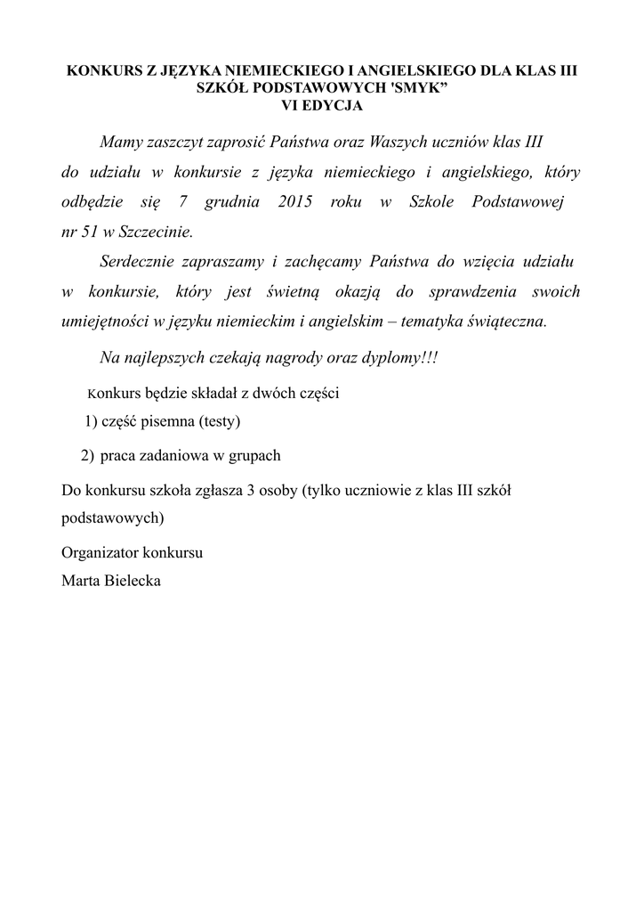 KONKURS Z JĘZYKA NIEMIECKIEGO I ANGIELSKIEGO DLA KLAS III SZKÓŁ PODSTAWOWYCH 'SMYK” VI EDYCJA Mamy zaszczyt zaprosić Państwa oraz Waszych uczniów klas III do udziału w konkursie z języka niemieckiego i angielskiego, który odbędzie się 7 grudnia 2015 roku w Szkole Podstawowej nr 51 w Szczecinie. Serdecznie zapraszamy i zachęcamy Państwa do wzięcia udziału w konkursie, który jest świetną okazją do sprawdzenia swoich umiejętności w języku niemieckim i angielskim – tematyka świąteczna. Na najlepszych czekają nagrody oraz dyplomy!!! Konkurs będzie składał z dwóch części 1) część pisemna (testy) 2) praca zadaniowa w grupach Do konkursu szkoła zgłasza 3 osoby (tylko uczniowie z klas III szkół podstawowych) Organizator konkursu Marta Bielecka REGULAMIN KONKURSU Zasady uczestnictwa:  konkurs jest imprezą otwartą,  proszę o zabezpieczenie uczniów w piórnik, nożyczki, klej, długopis, kredki,  tematyka bożonarodzeniowa. KATEGORIE WIEKOWE  UCZNIOWIE KLAS III TERMIN I MIEJSCE Konkurs odbędzie się 7 grudnia 2015 roku o godz. 10.00 w Szkole Podstawowej nr 51 w Szczecinie przy ul. Jodłowej 21. Termin zgłoszeń- do 03. 12. 2015 roku Zgłoszenia przyjmowane są pod adresem: Szkoła Podstawowa nr 51 ul. Jodłowa 21 71-414 Szczecin z dopiskiem „ Konkurs językowy- SMYK” fax 0-91 4523311 lub poczta: [email protected] [email protected] pieczątka Szkoły KARTA ZGŁOSZENIOWA NA IV EDYCJĘ KONKURSU JĘZYKOWEGO „SMYK” Lista uczestników ( proszę wypełnić czytelnie) język………………………( wpisać jaki język) 1. ……………………………………………………………… 2. ……………………………………………………………… 3. ..……………………………………………………………... Imię i nazwisko Opiekuna: ……………………………………………………………………………………. Dokładny adres Szkoły: ……………………………………………………………………………………. Oświadczam, że regulamin konkursu jest mi znany. …………………………………………………. Podpis i pieczątka dyrektora ……………………………………. podpis nauczyciela