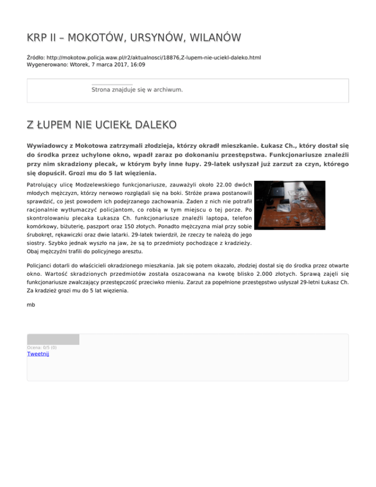 KRP II – MOKOTÓW, URSYNÓW, WILANÓW Źródło: http://mokotow.policja.waw.pl/r2/aktualnosci/18876,Z-lupem-nie-uciekl-daleko.html Wygenerowano: Wtorek, 7 marca 2017, 16:09 Strona znajduje się w archiwum. Z ŁUPEM NIE UCIEKŁ DALEKO Wywiadowcy z Mokotowa zatrzymali złodzieja, którzy okradł mieszkanie. Łukasz Ch., który dostał się do środka przez uchylone okno, wpadł zaraz po dokonaniu przestępstwa. Funkcjonariusze znaleźli przy nim skradziony plecak, w którym były inne łupy. 29-latek usłyszał już zarzut za czyn, którego się dopuścił. Grozi mu do 5 lat więzienia. Patrolujący ulicę Modzelewskiego funkcjonariusze, zauważyli około 22.00 dwóch młodych mężczyzn, którzy nerwowo rozglądali się na boki. Stróże prawa postanowili sprawdzić, co jest powodem ich podejrzanego zachowania. Żaden z nich nie potrafił racjonalnie wytłumaczyć policjantom, co robią w tym miejscu o tej porze. Po skontrolowaniu plecaka Łukasza Ch. funkcjonariusze znaleźli laptopa, telefon komórkowy, biżuterię, paszport oraz 150 złotych. Ponadto mężczyzna miał przy sobie śrubokręt, rękawiczki oraz dwie latarki. 29-latek twierdził, że rzeczy te należą do jego siostry. Szybko jednak wyszło na jaw, że są to przedmioty pochodzące z kradzieży. Obaj mężczyźni trafili do policyjnego aresztu. Policjanci dotarli do właścicieli okradzionego mieszkania. Jak się potem okazało, złodziej dostał się do środka przez otwarte okno. Wartość skradzionych przedmiotów została oszacowana na kwotę blisko 2.000 złotych. Sprawą zajęli się funkcjonariusze zwalczający przestępczość przeciwko mieniu. Zarzut za popełnione przestępstwo usłyszał 29-letni Łukasz Ch. Za kradzież grozi mu do 5 lat więzienia. mb Ocena: 0/5 (0) Tweetnij