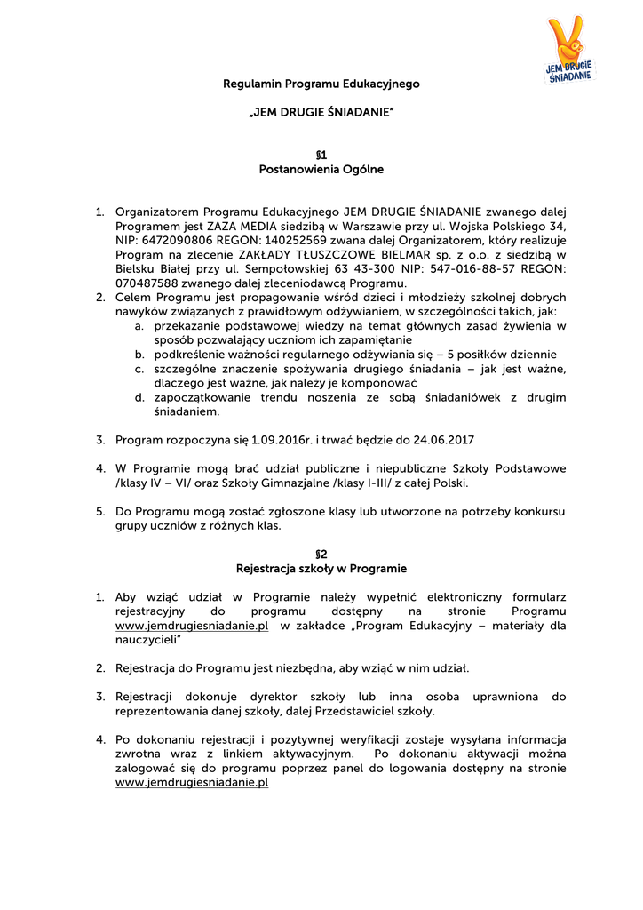 Regulamin Programu Edukacyjnego „JEM DRUGIE ŚNIADANIE” §1 Postanowienia Ogólne 1. Organizatorem Programu Edukacyjnego JEM DRUGIE ŚNIADANIE zwanego dalej Programem jest ZAZA MEDIA siedzibą w Warszawie przy ul. Wojska Polskiego 34, NIP: 6472090806 REGON: 140252569 zwana dalej Organizatorem, który realizuje Program na zlecenie ZAKŁADY TŁUSZCZOWE BIELMAR sp. z o.o. z siedzibą w Bielsku Białej przy ul. Sempołowskiej 63 43-300 NIP: 547-016-88-57 REGON: 070487588 zwanego dalej zleceniodawcą Programu. 2. Celem Programu jest propagowanie wśród dzieci i młodzieży szkolnej dobrych nawyków związanych z prawidłowym odżywianiem, w szczególności takich, jak: a. przekazanie podstawowej wiedzy na temat głównych zasad żywienia w sposób pozwalający uczniom ich zapamiętanie b. podkreślenie ważności regularnego odżywiania się – 5 posiłków dziennie c. szczególne znaczenie spożywania drugiego śniadania – jak jest ważne, dlaczego jest ważne, jak należy je komponować d. zapoczątkowanie trendu noszenia ze sobą śniadaniówek z drugim śniadaniem. 3. Program rozpoczyna się 1.09.2016r. i trwać będzie do 24.06.2017 4. W Programie mogą brać udział publiczne i niepubliczne Szkoły Podstawowe /klasy IV – VI/ oraz Szkoły Gimnazjalne /klasy I-III/ z całej Polski. 5. Do Programu mogą zostać zgłoszone klasy lub utworzone na potrzeby konkursu grupy uczniów z różnych klas. §2 Rejestracja szkoły w Programie 1. Aby wziąć udział w Programie należy wypełnić elektroniczny formularz rejestracyjny do programu dostępny na stronie Programu www.jemdrugiesniadanie.pl w zakładce „Program Edukacyjny – materiały dla nauczycieli” 2. Rejestracja do Programu jest niezbędna, aby wziąć w nim udział. 3. Rejestracji dokonuje dyrektor szkoły lub inna osoba reprezentowania danej szkoły, dalej Przedstawiciel szkoły. uprawniona do 4. Po dokonaniu rejestracji i pozytywnej weryfikacji zostaje wysyłana informacja zwrotna wraz z linkiem aktywacyjnym. Po dokonaniu aktywacji można zalogować się do programu poprzez panel do logowania dostępny na stronie www.jemdrugiesniadanie.pl 5. Po zalogowaniu do programu można pobrać materiały edukacyjne do przeprowadzenia lekcji na temat prawidłowego odżywiania., zwanej dalej „Lekcją”. 6. Każda szkoła która zarejestruje się do Programu powinna zrealizować przynajmniej jedną Lekcję w swojej szkole. Każda zrealizowana Lekcja powinna być udokumentowana 3 fotografiami obrazującymi przebieg Lekcji oraz wypełnieniem ankiety dostępnej po zalogowaniu się do Programu. 7. Każda szkoła która zarejestruje się do Programu i przeprowadzi przynajmniej jedną Lekcję jest zobowiązana do wypełnienia ankiety ewaluacyjnej, dostępnej na stronie Programu a następnie dołączenie 3 fotografii dokumentujących realizację Lekcji i wysłanie on-line. 8. Po otrzymaniu ankiety oraz dokumentacji fotograficznej, szkoła otrzymuje tytuł „Partner Programu JEM DRUGIE ŚNIADANIE”, wraz z certyfikatem oraz prawem do posługiwania się logotypem Kampanii JEM DRUGIE ŚNIADANIE w swoich materiałach informacyjno-promocyjnych zgodnie z wytycznymi Organizatora. 9. Przedstawiciele szkół biorących udział w Konkursie są zobowiązani do zapoznania się z regulaminem Programu oraz do jego akceptacji, co jest warunkiem do uzyskania prawa do posługiwania się logotypem Kampanii JEM DRUGIE ŚNIADANIE. 10. Organizator ma prawo żądać od Przedstawiciela szkoły, wykazania umocowania do działania w imieniu szkoły, pod rygorem wykluczenia szkoły z Programu. 11. Każda szkoła biorąca udział w Programie, akceptując niniejszy regulamin oświadcza, że posiada zgody rodziców (lub innych przedstawicieli ustawowych) uczniów, na rozpowszechnianie wizerunku uczniów na fotografiach dokumentujących przebieg Lekcji, na warunkach określonych w Regulaminie. Formularz zgody rodziców (przedstawicieli ustawowych) szkoła przechowuje we własnym archiwum, a Organizator ma prawo w każdej chwili poprosić szkołę o przedstawienie ww. zgód, pod rygorem wykluczenia szkoły z Programu. Organizator oraz Zleceniodawca programu nie ponoszą odpowiedzialności za skutki mogące wyniknąć z nieprawdziwości powyższego oświadczenia. Wyłączną odpowiedzialność w tym zakresie ponosi szkoła. §3 Zasady Programu 1. Organizator ma prawo wykluczyć szkołę z Programu, w przypadku stwierdzenia naruszenia przez szkołę postanowień niniejszego regulaminu. 2. Organizator oraz Zleceniodawca Programu zapewniają, że dokumentacja fotograficzna niezbędna do pełnego udziału w Programie nie będzie wykorzystywana do celów o charakterze komercyjnym. Zamiarem Organizatora i Zleceniodawcy Programu jest pokazanie fotografii wyłącznie w celu rozpropagowania programu edukacyjnego „JEM DRUGIE ŚNIADANIE”. 3. Każda szkoła biorąca udział w Programie wyraża zgodę na podanie do publicznej wiadomości informacji o udziale szkoły w Programie. §4 Postanowienia końcowe 1. Administratorem danych osobowych osób fizycznych przetwarzanych w niniejszym Programie, w celu i zakresie niezbędnym do jego przeprowadzenia, są ZAKŁADY TŁUSZCZOWE BIELMAR sp. z o.o. z siedzibą w Bielsku Białej przy ul. Sempołowskiej 63 43-300 NIP: 547-016-88-57 REGON. 070487588, która powierza przetwarzanie danych osobowych Organizatorowi. Dane osobowe osób fizycznych będą przetwarzane w celach związanych z Programem. Każda osoba fizyczna ma prawo wglądu w swoje dane osobowe, prawo ich poprawiania i prawo żądania ich usunięcia. Podanie danych osobowych jest dobrowolne, ale może być niezbędne do wzięcia udziału przez szkołę w Programie. 2. Szkoła biorąca udział w Programie oświadcza, że jest uprawniona do przetwarzania danych osobowych wszystkich osób fizycznych uczestniczących z ramienia szkoły w Programie na każdym jego etapie, w szczególności uczniów oraz pracowników. 3. Niniejszy regulamin jest dostępny w siedzibie Organizatora or