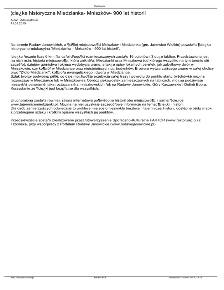 Piechowice ¦cie¿ka historyczna Miedzianka- Mniszków- 900 lat historii Autor: Administrator 11.05.2015. Na terenie Rudaw Janowickich, a ¶ci¶lej miejscowo¶ci Mniszków i Miedzianka (gm. Janowice Wielkie) powsta³a ¶cie¿ka historyczno-edukacyjna "Miedzianka - Mniszków - 900 lat historii". ¦cie¿ka ³±cznie liczy 6 km. Na ca³ej d³ugo¶ci rozmieszczonych zosta³o 16 pulpitów i 3 du¿e tablice. Przedstawiona jest na nich m.in. historia miejscowo¶ci, która zniknê³a: Miedzianki oraz Mniszkowa (od którego wszystko na tym terenie siê zaczê³o), dziejów górnictwa i okresu wydobycia uranu, a tak¿e opisy lokalnych pere³ek, jak zabytkowy dwór w Mniszkowie, czy ko¶ció³ w Miedziance oraz nieistniej±cych ju¿ budynków: Browaru wytwarzaj±cego znane w ca³ej okolicy piwo "Z³oto Miedzianki", ko¶cio³a ewangelickiego i dworu w Miedziance. Szlak tworzy podwójn± pêtlê, co daje mo¿liwo¶æ przebycia ca³ej trasy i powrotu do punktu startu (wêdrówkê mo¿na rozpocz±æ w Miedziance lub w Mniszkowie). Oprócz ciekawostek zamieszczonych na tablicach, mo¿na podziwiaæ niezwyk³± panoramê, jaka roztacza siê z mniszkowskich ³±k na Rudawy Janowickie, Góry Kaczawskie i Dolinê Bobru. Korzystanie ze ¶cie¿ki jest bezp³atne dla wszystkich. Uruchomiona zosta³a równie¿ strona internetowa po¶wiêcona historii obu miejscowo¶ci i samej ¶cie¿ce: www.tajemnicemiedzianki.pl. Mo¿na na niej uzyskaæ szczegó³owe informacje na temat ¶cie¿ki i historii. Dla osób zamierzaj±cych odwiedziæ to urokliwe miejsce o niezwykle burzliwej i tajemniczej historii, dostêpne bêd± mapki z przebiegiem szlaku i krótkim opisem wszystkich jej punktów. Przedsiêwziêcie zosta³o zrealizowane przez Stowarzyszenie Spo³eczno-Kulturalne FAKTOR (www.faktor.org.pl) z Trzciñska, przy wspó³pracy z Portalem Rudawy Janowickie (www.rudawyjanowickie.pl). http://old.piechowice.pl Kreator PDF Utworzono 7 March, 2017, 15:18