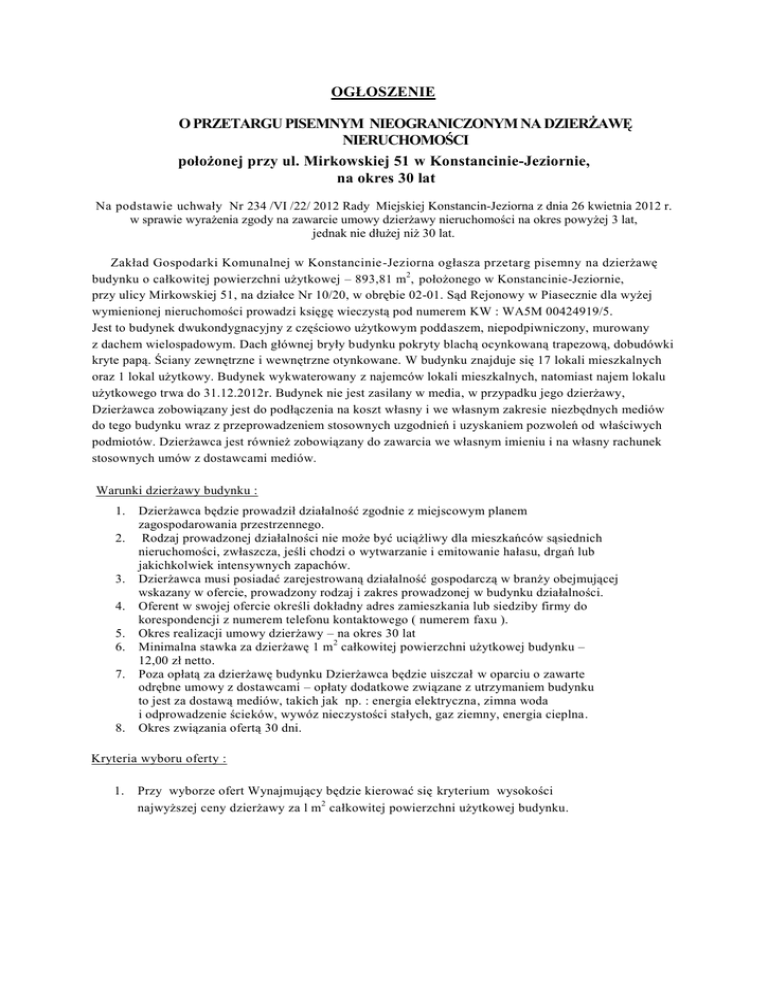 OGŁOSZENIE O PRZETARGU PISEMNYM NIEOGRANICZONYM NA DZIERŻAWĘ NIERUCHOMOŚCI położonej przy ul. Mirkowskiej 51 w Konstancinie-Jeziornie, na okres 30 lat Na podstawie uchwały Nr 234 /VI /22/ 2012 Rady Miejskiej Konstancin-Jeziorna z dnia 26 kwietnia 2012 r. w sprawie wyrażenia zgody na zawarcie umowy dzierżawy nieruchomości na okres powyżej 3 lat, jednak nie dłużej niż 30 lat. Zakład Gospodarki Komunalnej w Konstancinie-Jeziorna ogłasza przetarg pisemny na dzierżawę budynku o całkowitej powierzchni użytkowej – 893,81 m2, położonego w Konstancinie-Jeziornie, przy ulicy Mirkowskiej 51, na działce Nr 10/20, w obrębie 02-01. Sąd Rejonowy w Piasecznie dla wyżej wymienionej nieruchomości prowadzi księgę wieczystą pod numerem KW : WA5M 00424919/5. Jest to budynek dwukondygnacyjny z częściowo użytkowym poddaszem, niepodpiwniczony, murowany z dachem wielospadowym. Dach głównej bryły budynku pokryty blachą ocynkowaną trapezową, dobudówki kryte papą. Ściany zewnętrzne i wewnętrzne otynkowane. W budynku znajduje się 17 lokali mieszkalnych oraz 1 lokal użytkowy. Budynek wykwaterowany z najemców lokali mieszkalnych, natomiast najem lokalu użytkowego trwa do 31.12.2012r. Budynek nie jest zasilany w media, w przypadku jego dzierżawy, Dzierżawca zobowiązany jest do podłączenia na koszt własny i we własnym zakresie niezbędnych mediów do tego budynku wraz z przeprowadzeniem stosownych uzgodnień i uzyskaniem pozwoleń od właściwych podmiotów. Dzierżawca jest również zobowiązany do zawarcia we własnym imieniu i na własny rachunek stosownych umów z dostawcami mediów. Warunki dzierżawy budynku : 1. 2. 3. 4. 5. 6. 7. 8. Dzierżawca będzie prowadził działalność zgodnie z miejscowym planem zagospodarowania przestrzennego. Rodzaj prowadzonej działalności nie może być uciążliwy dla mieszkańców sąsiednich nieruchomości, zwłaszcza, jeśli chodzi o wytwarzanie i emitowanie hałasu, drgań lub jakichkolwiek intensywnych zapachów. Dzierżawca musi posiadać zarejestrowaną działalność gospodarczą w branży obejmującej wskazany w ofercie, prowadzony rodzaj i zakres prowadzonej w budynku działalności. Oferent w swojej ofercie określi dokładny adres zamieszkania lub siedziby firmy do korespondencji z numerem telefonu kontaktowego ( numerem faxu ). Okres realizacji umowy dzierżawy – na okres 30 lat Minimalna stawka za dzierżawę 1 m 2 całkowitej powierzchni użytkowej budynku – 12,00 zł netto. Poza opłatą za dzierżawę budynku Dzierżawca będzie uiszczał w oparciu o zawarte odrębne umowy z dostawcami – opłaty dodatkowe związane z utrzymaniem budynku to jest za dostawą mediów, takich jak np. : energia elektryczna, zimna woda i odprowadzenie ścieków, wywóz nieczystości stałych, gaz ziemny, energia cieplna. Okres związania ofertą 30 dni. Kryteria wyboru oferty : 1. Przy wyborze ofert Wynajmujący będzie kierować się kryterium wysokości najwyższej ceny dzierżawy za l m2 całkowitej powierzchni użytkowej budynku. Wymogi dotyczące treści oferty : 1). Imię i nazwisko oraz adres oferenta, albo nazwa firmy oraz siedziba, jeżeli oferentem jest osoba prawna lub inny podmiot. 2). Data sporządzenia oferty. 3). Adres budynku, o który ubiega się oferent. 4). Oświadczenie o niezaleganiu z płatnościami składek ZUS i Urzędu Skarbowego. 5). Oświadczenie oferenta o zapoznaniu się z warunkami przetargu i przyjęciu tych warunków bez zastrzeżeń. 6). Oświadczenie oferenta o zapoznaniu się z wzorem umowy dzierżawy, która stanowi załącznik do ogłoszenia ( wzór umowy dostępny w siedzibie ZGK oraz zamieszczony na stronie internetowej Zakładu www.zgk-konstancin.pl) oraz oświadczenie Oferenta o wyrażeniu zgody na podpisanie umowy w formie aktu notarialnego i o akceptacji poniesienia przez Dzierżawcę kosztów związanych ze sporządzeniem aktu notarialnego ( opłaty notarialne). 7). Oferowana wysokość stawki czynszu netto za l m2 całkowitej powierzchni użytkowej budynku. 8). Określenie rodzaju działalności prowadzonej w wydzierżawianym budynku. 9). Oświadczenie o wyrażeniu zgody na przetwarzanie danych osobowych oferenta w zakresie niezbędnym do przeprowadzenia przetargu, przy zachowaniu zasady jawności postępowania przetargowego i wyniku przetargu, 10). Oferent w swojej ofercie musi złożyć oświadczenie, że wszystkie prace adaptacyjne budynku będą wykonane na koszt własny i we własnym zakresie po uprzednim uzyskaniu zgody właściciela oraz że będą dokonywane zgodnie z prawem budowlanym i polskimi normami, a Dzierżawca na swój koszt uzyska wszystkie decyzje administracyjne niezbędne do ich przeprowadzenia. Dokumenty wymagane od składającego ofertę : 1). Aktualne, wystawione nie wcześniej niż trzy miesiące przed datą złożenia oferty, dokumenty identyfikujące podmiot składający ofertę ( zaświadczenie o wpisie do ewidencji działalności gospodarczej lub wyciąg z rejestru handlowego – osoby fizyczne rozpoczynające działalność gospodarczą zamiast wpisu do ewidencji dostarczają oświadczenie, że w przypadku wygrania przetargu – wpis do ewidencji dostarczą przed podpisaniem umowy dzierżawy ( pod rygorem unieważnienia wyboru ). 2). W przypadku gdy umowa ma być zawierana przez pełnomocnika pełnomocnictwo udzielone w formie pisemnej potwierdzonej notarialnie. 3). Zaświadczenie o braku zaległości w opłatach wobec Urzędu Skarbowego i ZUS ( wystawione nie wcześniej niż na 1 miesiąc przed upływem terminu składania ofert ). Wymogi dotyczące złożenia oferty : Oferty należy składać w zamkniętych, zaklejonych i ostemplowanych, bądź podpisanych w miejscu jej zaklejenia kopertach w sekretariacie Zakładu Gospodarki Komunalnej w Konstancinie-Jeziornie, ul. Warecka 22 do dnia 16.07.2012r., godz. 11 00. Koperty powinny być opatrzone informacją, jakiego przetargu dotyczą oraz danymi identyfikacyjnymi oferenta. Otwarcie ofert nastąpi w dn