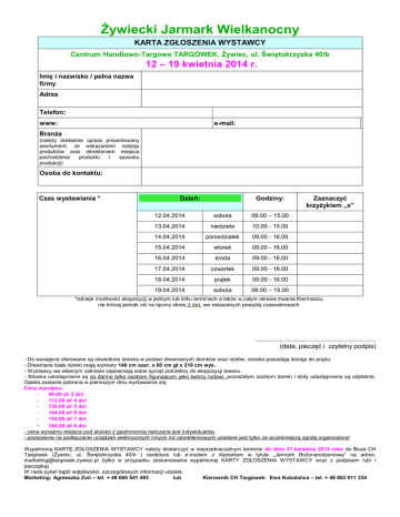 Żywiecki Jarmark Wielkanocny KARTA ZGŁOSZENIA WYSTAWCY Centrum Handlowo-Targowe TARGÓWEK, Żywiec, ul. Świętokrzyska 40/b 12 – 19 kwietnia 2014 r. Imię i nazwisko / pełna nazwa firmy Adres Telefon: www: e-mail: Branża (należy dokładnie opisać prezentowany asortyment, ze wskazaniem rodzaju produktów oraz określeniem miejsca pochodzenia produktu i sposobu produkcji) Osoba do kontaktu: Czas wystawiania * Dzień: Godziny: 12.04.2014 sobota 09.00 – 15.00 13.04.2014 niedziela 10.00 - 15.00 14.04.2014 poniedziałek 09.00 - 16.00 15.04.2014 wtorek 09.00 - 16.00 16.04.2014 środa 09.00 - 16.00 17.04.2014 czwartek 09.00 - 16.00 18.04.2014 piątek 09.00 - 16.00 19.04.2014 sobota 09.00 – 15.00 Zaznaczyć krzyżykiem „x” *istnieje możliwość ekspozycji w jednym lub kilku terminach a także w całym okresie trwania Kiermaszu, nie krócej jednak niż na łączny okres 3 dni, we wskazanych powyżej czasookresach. ................................................................. (data, pieczęć i czytelny podpis) - Do wynajęcia oferowane są oświetlone stoiska w postaci drewnianych domków oraz stołów, stoiska posiadają dostęp do prądu; - Drewniane białe domki mają wymiary 140 cm szer. x 60 cm gł x 210 cm wys.. - Wystawcy we własnym zakresie zapewniają sobie sprzęt potrzebny do ekspozycji towaru. - Stoiska udostępniane są za darmo tylko osobom figurującym jako twórcy ludowi, pozostałym osobom domki i stoły udostępniane są odpłatnie. Opłata zostanie pobrana w pierwszym dniu wystawiania się. Ceny wynajmu: − 90,00 zł/ 3 dni − 112,00 zł/ 4 dni − 130,00 zł/ 5 dni − 144,00 zł/ 6 dni − 154,00 zł/ 7 dni − 160,00 zł/ 8 dni - cena wynajmu miejsca pod stoisko z gastronomią naliczana jest indywidualnie - pozwolenie na podłączanie urządzeń elektrycznych innych niż oświetleniowych ustalane jest tylko za wcześniejszą zgodą organizatora! Wypełnioną KARTĘ ZGŁOSZENIA WYSTAWCY należy dostarczyć w nieprzekraczalnym terminie do dnia 31 kwietnia 2014 roku do Biura CH Targówek (Żywiec, ul. Świętokrzyska 40/b ) osobiście lub e-mailem z dopiskiem w tytule „Jarmark Bożonarodzeniowy” na adres: [email protected] (tylko w przypadku zeskanowania wypełnionej KARTY ZGŁOSZENIA WYSTAWCY wraz z podpisem lub/ i pieczątką) W razie pytań bądź wątpliwości, szczegółowych informacji udziela: Marketing: Agnieszka Zoń – tel. + 48 660 541 493 lub Kierownik CH Targówek: Ewa Kubalańca – tel. + 48 663 911 334