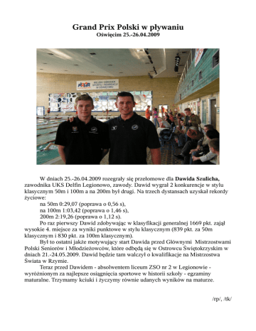 Grand Prix Polski w pływaniu Oświęcim 25.-26.04.2009 W dniach 25.-26.04.2009 rozegrały się przełomowe dla Dawida Szulicha, zawodnika UKS Delfin Legionowo, zawody. Dawid wygrał 2 konkurencje w stylu klasycznym 50m i 100m a na 200m był drugi. Na trzech dystansach uzyskał rekordy życiowe: na 50m 0:29,07 (poprawa o 0,56 s), na 100m 1:03,42 (poprawa o 1,46 s), 200m 2:19,26 (poprawa o 1,12 s). Po raz pierwszy Dawid zdobywając w klasyfikacji generalnej 1669 pkt. zajął wysokie 4. miejsce za wyniki punktowe w stylu klasycznym (839 pkt. za 50m klasycznym i 830 pkt. za 100m klasycznym). Był to ostatni jakże motywujący start Dawida przed Głównymi Mistrzostwami Polski Seniorów i Młodzieżowców, które odbędą się w Ostrowcu Świętokrzyskim w dniach 21.-24.05.2009. Dawid będzie tam walczył o kwalifikacje na Mistrzostwa Świata w Rzymie. Teraz przed Dawidem - absolwentem liceum ZSO nr 2 w Legionowie wyróżnionym za najlepsze osiągnięcia sportowe w historii szkoły - egzaminy maturalne. Trzymamy kciuki i życzymy równie udanych wyników na maturze. /rp/, /tk/
