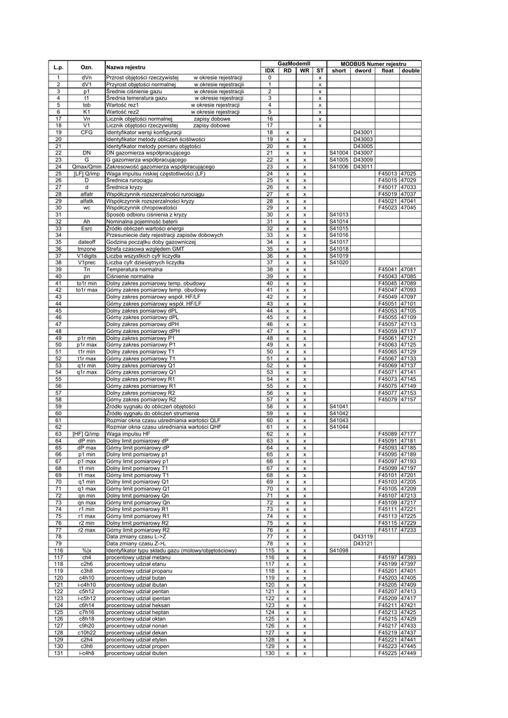 L.p. Ozn. 1 2 3 4 5 6 17 18 19 20 21 22 23 24 25 26 27 28 29 30 31 32 33 34 35 36 37 38 39 40 41 42 43 44 45 46 47 48 49 50 51 52 53 54 55 56 57 58 59 60 61 62 63 64 65 66 67 68 69 70 71 72 73 74 75 76 77 78 79 116 117 118 119 120 121 122 123 124 125 126 127 128 129 130 131 dVn dV1 p1 t1 tob K1 Vn V1 CFG Nazwa rejestru Przrost objętości rzeczywistej w okresie rejestracji Przyrost objętości normalnej w okresie rejestracjii Średnie ciśnienie gazu w okresie rejestracjii Średnia temeratura gazu w okresie rejestracji Wartość rez1 w okresie rejestracji Wartość rez2 w okresie rejestracji Licznik objętości normalnej zapisy dobowe Licznik objętości rzeczywistej zapisy dobowe Identyfikator wersji konfiguracji Identyfikator metody obliczeń ściśliwości Identyfikator metody pomiaru objętości DN DN gazomierza współpracującego G G gazomierza współpracującego Qmax/Qmin Zakresowość gazomierza współpracującego [LF] Q/imp Waga impulsu niskiej częstotliwości (LF) D Średnica rurociągu d Średnica kryzy alfatr Współczynnik rozszerzalności rurociągu alfatk Współczynnik rozszerzalności kryzy wc Współczynnik chropowatości Sposób odbioru ciśnienia z kryzy Ah Nominalna pojemność baterii Esrc Źródło obliczeń wartości energii Przesuniecie daty rejestracji zapisów dobowych dateoff Godzina początku doby gazowniczej tmzone Strefa czasowa względem GMT V1digits Liczba wszystkich cyfr liczydła V1prec Liczba cyfr dziesiętnych liczydła Tn Temperatura normalna pn Ciśnienie normalna to1r min Dolny zakres pomiarowy temp. obudowy to1r max Górny zakres pomiarowy temp. obudowy Dolny zakres pomiarowy współ. HF/LF Górny zakres pomiarowy współ. HF/LF Dolny zakres pomiarowy dPL Górny zakres pomiarowy dPL Dolny zakres pomiarowy dPH Górny zakres pomiarowy dPH p1r min Dolny zakres pomiarowy P1 p1r max Górny zakres pomiarowy P1 t1r min Dolny zakres pomiarowy T1 t1r max Górny zakres pomiarowy T1 q1r min Dolny zakres pomiarowy Q1 q1r max Górny zakres pomiarowy Q1 Dolny zakres pomiarowy R1 Górny zakres pomiarowy R1 Dolny zakres pomiarowy R2 Górny zakres pomiarowy R2 Źródło sygnału do obliczeń objętości Źródło sygnału do obliczeń strumienia Rozmiar okna czasu uśredniania wartości QLF Rozmiar okna czasu uśredniania wartości QHF [HF] Q/imp Waga impulsu HF dP min Dolny limit pomiarowy dP dP max Górny limit pomiarowy dP p1 min Dolny limit pomiarowy p1 p1 max Górny limit pomiarowy p1 t1 min Dolny limit pomiarowy T1 t1 max Górny limit pomiarowy T1 q1 min Dolny limit pomiarowy Q1 q1 max Górny limit pomiarowy Q1 qn min Dolny limit pomiarowy Qn qn max Górny limit pomiarowy Qn r1 min Dolny limit pomiarowy R1 r1 max Górny limit pomiarowy R1 r2 min Dolny limit pomiarowy R2 r2 max Górny limit pomiarowy R2 Data zmiany czasu L->Z Data zmiany czasu Z->L %|x Identyfikator typu składu gazu (molowy/objętościowy) ch4 procentowy udział metanu c2h6 procentowy udział etanu c3h8 procentowy udział propanu c4h10 procentowy udział butan i-c4h10 procentowy udział ibutan c5h12 procentowy udział pentan i-c5h12 procentowy udział ipentan c6h14 procentowy udział heksan c7h16 procentowy udział heptan c8h18 procentowy udział oktan c9h20 procentowy udział nonan c10h22 procentowy udział dekan c2h4 procentowy udział etylen c3h6 procentowy udział propen i-c4h8 procentowy udział ibuten IDX 0 1 2 3 4 5 16 17 18 19 20 21 22 23 24 25 26 27 28 29 30 31 32 33 34 35 36 37 38 39 40 41 42 43 44 45 46 47 48 49 50 51 52 53 54 55 56 57 58 59 60 61 62 63 64 65 66 67 68 69 70 71 72 73 74 75 76 77 78 115 116 117 118 119 120 121 122 123 124 125 126 127 128 129 130 GazModemII RD WR x x x x x x x x x x x x x x x x x x x x x x x x x x x x x x x x x x x x x x x x x x x x x x x x x x x x x x x x x x x x x x x x x x x x x x x x x x x x x x x x x x x x x x x x x x x x x x x x x x x x x x x x x x x x x x x x x x x x x x x x x x x x x x x x x x x x x x x x x x x x x x x x x x x x x x x x x ST x x x x x x x x MODBUS Numer rejestru short dword float double D43001 D43003 D43005 S41004 D43007 S41005 D43009 S41006 D43011 F45013 F45015 F45017 F45019 F45021 F45023 47025 47029 47033 47037 47041 47045 F45041 F45043 F45045 F45047 F45049 F45051 F45053 F45055 F45057 F45059 F45061 F45063 F45065 F45067 F45069 F45071 F45073 F45075 F45077 F45079 47081 47085 47089 47093 47097 47101 47105 47109 47113 47117 47121 47125 47129 47133 47137 47141 47145 47149 47153 47157 F45089 F45091 F45093 F45095 F45097 F45099 F45101 F45103 F45105 F45107 F45109 F45111 F45113 F45115 F45117 47177 47181 47185 47189 47193 47197 47201 47205 47209 47213 47217 47221 47225 47229 47233 F45197 F45199 F45201 F45203 F45205 F45207 F45209 F45211 F45213 F45215 F45217 F45219 F45221 F45223 F45225 47393 47397 47401 47405 47409 47413 47417 47421 47425 47429 47433 47437 47441 47445 47449 S41013 S41014 S41015 S41016 S41017 S41018 S41019 S41020 S41041 S41042 S41043 S41044 D43119 D43121 S41098 132 133 134 135 136 137 138 139 140 141 142 143 144 145 146 147 148 149 150 151 152 153 154 155 156 157 158 159 160 161 162 163 164 165 166 167 168 169 170 171 172 173 174 175 176 177 178 179 180 181 182 183 184 185 186 187 188 189 190 191 192 193 194 195 196 197 200 201 202 203 204 205 206 207 208 209 210 211 212 213 214 215 216 217 218 219 220 cis-c4h8 izo-c4h8 1,2-c4h6 1,3-c4h6 1-c5h10 c5h10 c6h6 c7h8 ch9oh h2 h2o h2s co he ne ar n2 o2 co2 so2 air Zn Mm Ron dn Hsn Hin LF dV1 V1 dVn Vn V1 [A] Vn [A] E M Qr Q1 Qn Qe Qm Tob T1 P1 [L] dP1 [H] dP1 dP1 F1 Pa1 K1 Fi1 Wi Ws Hs1 Hi1 ro1 d1 wiz1 lpd1 Re HF real HF / LF HF err pm1 pmn Imax dtau IO in IO out Q1src [LF] Q1 [HF] Q1 OP id PRG id [GPF] seg [GPF] off procentowy udział cis2buten procentowy udział izobuten procentowy udział 12butadien procentowy udział 13butadien procentowy udział 1penten procentowy udział cyklopentan procentowy udział benzen procentowy udział toulen procentowy udział metanol procentowy udział wodór procentowy udział para wodna procentowy udział siarkowodór procentowy udział tlen