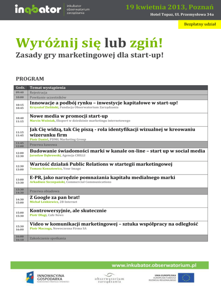 19 kwietnia 2013, Poznań Hotel Topaz, Ul. Przemysłowa 34a Bezpłatny udział Wyróżnij się lub zgiń! Zasady gry marketingowej dla start-up! PROGRAM Godz. Temat wystąpienia 09:40 Rejestracja Powitanie uczestników 10:00 10:15 10:45 10:40 11:15 11:15 11:45 Innowacje a podbój rynku – inwestycje kapitałowe w start-up! Krzysztof Zieliński, Fundacja Obserwatorium Zarządzania Nowe media w promocji start-up Marcin Woźniak, Ekspert w dziedzinie marketingu internetowego Jak Cię widzą, tak Cię piszą - rola identyfikacji wizualnej w kreowaniu wizerunku firm Piotr Daniel, PDMG Marketing Group 11:45 12:00 12:00 12:30 12:30 13:00 13:00 13:30 13:30 14:30 14:30 15:00 15:00 15:30 15:30 16:00 16:00 16:10 Przerwa kawowa Budowanie świadomości marki w kanale on-line – start up w social media Jarosław Dąbrowski, Agencja CHILLI Wartość działań Public Relations w startegii marketingowej Tomasz Konsztowicz, Your Image E-PR, jako narzędzie pomnażania kapitału medialnego marki Arkadiusz Szczepański, Commercial Communications Przerwa obiadowa Z Google za pan brat! Michał Lenkiewicz, 2B Internet Kontrowersyjnie, ale skutecznie Piotr Długi, Cafe News Video w komunikacji marketingowej – sztuka współpracy na odległość Piotr Maczuga, Nowoczesna Firma SA Zakończenie spotkania 19 kwietnia 2013, Poznań Hotel Topaz, Ul. Przemysłowa 34a PRELEGENCI PIOTR DŁUGI Przedsiębiorca, inwestujący w przedsięwzięcia z obszaru TMT. Wcześniej w zarządzie PRESS-SERVICE Monitoring Mediów Sp. z o.o., a od pięciu lat prezes zarządu Cafe News S.A. Realizował wiele projektów o obszarze usług B2B i B2C. Ostatni projekt to program lojalnościowy – PrzeczytamWszystkich.pl i agregator programów lojalnościowych MultiPunkty.pl. MARCIN WOŹNIAK Absolwent kierunku Zarządzanie i Marketing w Szkoły Głównej Handlowej w Warszawie.. Z branżą reklamy internetowej związany od ponad 10 lat. Współzałożyciel i Dyrektor Zarządzający międzynarodowego domu sprzedaży mediów ARBOmedia (początkowo adMaster). W listopadzie 2010 roku IAB Polska wyróżniło Marcina Woźniaka za ponadprzeciętne zasługi dla marketingu interaktywnego i ogłosiło Człowiekiem Roku. MICHAŁ LENKIEWICZ Właściciel B2 Internet, w latach 2006-2009 vice-prezes Cafe News S.A. Pasjonat nowych technologii oraz technik zarządzania. W roku 2012 firma B2 Internet otrzymała wyróżnienie w Konkursie na Poznańskiego Lidera Przedsiębiorczości. Obecnie Dyrektor Zarządzający Grupy B2 NE, składającej się z firm: B2 Internet, C2R oraz B2 Search, które połączyły swoje usługi z zakresu kreowania wizerunku firm w Internecie, pozycjonowania oraz programowania aplikacji internetowych. PIOTR MACZUGA Menadżer ds. multimediów w Nowoczesnej Firmie S.A. Odpowiedzialny za realizowanie projektów związanych z nowymi mediami w nauczaniu i biznesie. Fan wszelkich sztuk audiowizualnych, publikuje na portalach nf.pl i 2edu.pl. KRZYSTOF ZIELINSKI Dyrektor R&D. Od 2004 zaangażowany w planowanie i realizację projektów badawczych, rozwojowych i doradczych skierowanych do biznesu i instytucji rynku pracy. Zarządza międzynarodowymi projektami obejmującymi wykorzystanie nowych mediów. Kierownik projektu Inkubator Obserwatorium Zarządzania, który wspiera powstawanie nowych firm w obszarze usług profesjonalnych, ICT i edukacji. Dotacje na innowacje. Inwestujemy w Waszą przyszłość. Inkubator Obserwatorium Zarządzania realizowany przez Fundację Obserwatorium Zarządzania w ramach projektu „Nowy Horyzont – czas na własny innowacyjny biznes” jest współfinansowany przez Unię Europejską z Europejskiego Funduszu Rozwoju Regionalnego.