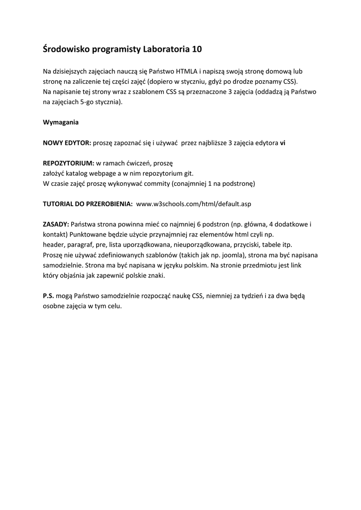Środowisko programisty Laboratoria 10 Na dzisiejszych zajęciach nauczą się Państwo HTMLA i napiszą swoją stronę domową lub stronę na zaliczenie tej części zajęć (dopiero w styczniu, gdyż po drodze poznamy CSS). Na napisanie tej strony wraz z szablonem CSS są przeznaczone 3 zajęcia (oddadzą ją Państwo na zajęciach 5-go stycznia). Wymagania NOWY EDYTOR: proszę zapoznać się i używać przez najbliższe 3 zajęcia edytora vi REPOZYTORIUM: w ramach ćwiczeń, proszę założyć katalog webpage a w nim repozytorium git. W czasie zajęć proszę wykonywać commity (conajmniej 1 na podstronę) TUTORIAL DO PRZEROBIENIA: www.w3schools.com/html/default.asp ZASADY: Państwa strona powinna mieć co najmniej 6 podstron (np. główna, 4 dodatkowe i kontakt) Punktowane będzie użycie przynajmniej raz elementów html czyli np. header, paragraf, pre, lista uporządkowana, nieuporządkowana, przyciski, tabele itp. Proszę nie używać zdefiniowanych szablonów (takich jak np. joomla), strona ma być napisana samodzielnie. Strona ma być napisana w języku polskim. Na stronie przedmiotu jest link który objaśnia jak zapewnić polskie znaki. P.S. mogą Państwo samodzielnie rozpocząć naukę CSS, niemniej za tydzień i za dwa będą osobne zajęcia w tym celu.