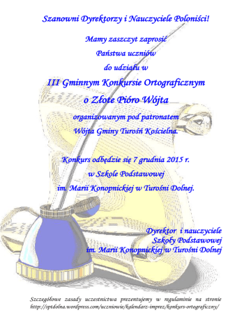 Szanowni Dyrektorzy i Nauczyciele Poloniści! Mamy zaszczyt zaprosić Państwa uczniów do udziału w III Gminnym Konkursie Ortograficznym o Złote Pióro Wójta organizowanym pod patronatem Wójta Gminy Turośń Kościelna. Konkurs odbędzie się 7 grudnia 2015 r. w Szkole Podstawowej im. Marii Konopnickiej w Turośni Dolnej. Dyrektor i nauczyciele Szkoły Podstawowej im. Marii Konopnickiej w Turośni Dolnej Szczegółowe zasady uczestnictwa prezentujemy w regulaminie na stronie http://sptdolna.wordpress.com/uczniowie/kalendarz-imprez/konkurs-ortograficzny/