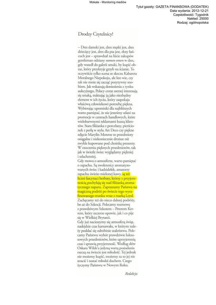 Mokate - Monitoring mediów Tytu³ gazety: GAZETA FINANSOWA (DODATEK) Data wydania: 2012-12-21 Czêstotliwo¶æ: Tygodnik Nak³ad: 25000 Rodzaj: ogólnopolska Drodzy Czytelnicy! - Dres damski jest, dres męski jest, dres dziecięcy jest, dres dla psa jest, złoty łań cuch jest - sprawdzał na liście zakupów gendeman odziany nomen omen w dres, gdy wszedł do galerii sztuki, by kupić ob raz, który przykryje grzyb na ścianie. To oczywiście tylko scena ze skeczu Kabaretu Moralnego Niepokoju, ale kto wie, czy tak nie może się zacząć pozytywny sno bizm. Jak wskazują doniesienia z rynku aukcyjnego, Polacy coraz szerzej interesują się sztuką, traktując ją jako niezbędny element w ich życiu, który zaspokaja właściwą człowiekowi potrzebę piękna. Wybierając upominki dla najbliższych warto pamiętać, że nie jesteśmy zdani na promocje w centrach handlowych, które wielobarwnymi reklamami kuszą klien tów. Stara filiżanka z porcelany, pierścio nek z perłą w stylu Art Deco czy piękne zdjęcie Marylin Monroe to przedmioty osiągalne i niekoniecznie droższe niż zwykle kupowane pod choinkę prezenty. W otoczeniu pięknych przedmiotów, tak jak w świede świec wyglądamy piękniej i szlachetniej. Gdy mowa o atmosferze, warto pamiętać o zapachu. Są zwolennicy aromatyzo wanych świec i kadzidełek, amatorzy zapachu świeżo mielonej kawy, są też liczni fascynaci herbaty, którzy z przyjem nością pochylają się nadfiliżankąaroma tycznego naparu. Zapraszamy Państwa na magiczną podróż po świecie tego wyra finowanego trunku wraz z marką Loyd. Zachęcamy też do nieco dalszej podróży, bo aż do Szkocji. Polecamy rozmowę z prawdziwym Szkotem - Peterem Kerrem, który szczerze opowie, jak i co pije się w Wielkiej Brytanii. Gdy już nacieszymy się atmosferą świąt, nadejdzie czas karnawału, w którym nale ży poddać się odrobinie szaleństwa. Pole camy Państwu wybór prawdziwie luksu sowych przedmiotów, które uprzyjemnią czas i sprawią przyjemność. Według słów Oskara Wilde'a jedyną wartą posiadania rzeczą na świecie jest młodość. Tej jednak nie możemy kupić, możemy za to jej nie stracić i zostać młodzi duchem. Czego życzymy Państwu w Nowym Roku. Redakcja