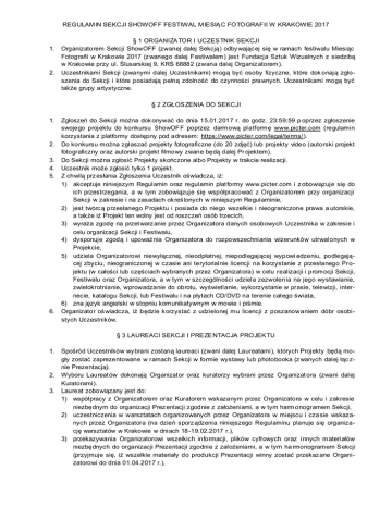 REGULAMIN SEKCJI SHOWOFF FESTIWAL MIESIĄ C FOTOGRAFII W KRAKOWIE 2017 1. 2. § 1 ORGANIZA TOR I UCZES TNIK SEKCJI Organizatorem Sekcji ShowOFF (zwanej dalej Sekcją) odby wając ej się w ramach festiwalu Miesiąc Fotografii w Krakowie 2017 (z wanego dalej Festiwalem) jes t Fundacja Sztuk Wizualnych z siedzibą w Krakowie przy ul. Ślusarskiej 9, KRS 68882 (zwana dalej Organiz atorem). Uczestnikami Sekcji (zwanymi dalej Uczestnikami) mogą być osoby fizyczne, które dok onają zgłoszenia do Sekcji i które posiadają pełną zdolność do czynności prawnych. Uczestnikami mogą być także grupy artystyczne. § 2 ZGŁOS ZENIA DO SEKCJI 1. 2. 3. 4. 5. 6. Zgłoszeń do Sekcji można dok onywać do dnia 15.01.2017 r. do godz. 23:59:59 p oprzez zgłoszenie swojego projektu do konkursu ShowOFF poprzez darmową platformę www.picter.com (regulamin korzystania z platformy dostępny pod adresem: https://www.picter.com/legal/terms/). Do konkursu można zgłaszać projekty fotograficzne (do 20 zdjęć) lub projekty video (autorski projekt fotograficzny oraz autorski projekt filmowy zwane będą dalej Pr ojektem). Do Sekcji można zgłosić Projekty skończone albo Projekty w trakcie realizacji. Uczestnik może zgłosić tylko 1 projekt. Z chwilą prz esłania Zgłoszenia Uczestnik oświadcza, iż: 1) akceptuje niniejszym Regulamin oraz regulamin plat formy www.picter.com i z obowiązuje się do ich przestrzegania, a w tym zobowiązuje się współpracować z Organizatorem przy organizacji Sekcji w zakresie i na zasadach ok reślonych w niniejszym Regulaminie, 2) jest twórc ą przesłanego P rojektu i posiada do niego wszelkie i nieograniczone prawa a utorskie, a także iż Projekt ten wolny jest od roszczeń osób trzecich, 3) wyraża zgodę na przet warz anie przez Organizatora danych osobowych Uczestnika w zakresie i celu organizacji Sekcji i Festiwalu, 4) dysponuje zgodą i upoważ nia Organizatora do rozpowszechniania wizerunków utrwal onych w Projekcie, 5) udziela Organizatorowi niewyłącznej, nieodpłatnej, niepodlegającej wypowi edzeniu, podlegającej zbyciu, nieograniczonej w czasie ani terytorialnie licencji na korzystanie z przesłanego Projektu (w całości lub częściach wybranych przez Organizat ora) w celu realizacji i promocji Sekcji, Festiwalu oraz Organizatora, a w tym w szczególności udziela zezwolenia na jego wystawianie, zwielokrotnianie, wprowadzanie do obrotu, wyświetlanie, wykorzystanie w prasie, telewizji, internecie, katalogu Sekcji, lub Festiwalu i na płytach CD/ DVD na terenie całego świata, 6) zna język angielski w stopniu komunikatywnym w mowie i piśmie. Organizator oś wiadcza, iż będzie k orzystać z udzielonej mu licencji z poszanowaniem dóbr osobistych Uczestników. § 3 LAUREACI SEKCJI I PRE ZE NTACJA PROJEK TU 1. 2. 3. Spośród Uczestników wy brani zostaną laureaci (zwani dalej Laureatami), których Projekty będą mogły zostać zaprezentowane w ramach Sekcji w formie wystawy lub photobooka (z wanych dalej łąc znie Prezentacją). Wyboru Laureat ów dokonają Organizat or oraz kuratorzy wybrani przez Organizat ora (zwani dalej Kuratorami). Laureat zobowiązany jest do: 1) współpracy z Organizat orem oraz Kuratorem wskazanym przez Organizatora w celu i zakresie niezbędnym do organizacji Prez entacji zgodnie z założeniami, a w tym harm onogramem Sekcji, 2) uczestniczenia w warsztatach organizowanych przez Organizatora w miejscu i czasie wskazanych przez Organizatora (na dzień sporz ądzenia niniejszego Regulaminu planuje się organizację warsztatów w Krakowie w dniach 18 -19.02.2017 r.), 3) przekazywania Organizatorowi wszelkich informacji, plików cyfrowych oraz i nnych materiałów niezbędnych do organizacji Prezentacji zgodnie z założeniami, a w tym ha rmonogramem S ekcji (przyjmuje się, iż wszelkie materiały do produkcji Prezentacji winny zostać przekaz ane Organizatorowi do dnia 01.04.2017 r.), 4) wyproduk owania P rezentacji lub współpracy z Organizatorem przy produkcji Prezent acji w wybranym przez Organizatora laboratorium fot ograficznym (przyjmuje się, iż produkcja zostanie zorganizowana w laborat orium Fundacji Lablab), w ramach której to produkcji – stosownie do uzgodnień z Organizatorem – może nastąpić wytworzenie wystawowych egz emplarzy utworów objętych Projektem, dodatkowych autorskich egzemplarzy utworów objętych Projektem przeznaczonych na sprzedaż oraz wydanie publikacji obejmującej Projekt, 5) pokrycia kosztów produkcji Prezentacji, w zakresie niepok rytym przez Organizatora, w sposób wskazany przez Organizatora, w terminie do dnia 03.04. 2017 r., 6) uczestniczenia w wernisażu P rezentacji, a także naradach, spotkaniach i innych wydarzeniach związanych z organizacją Sekcji oraz przygotowaniem Prezent acji. 4. 5. 6. 7. Organizator zapewni pokrycie kosztów produkcji Prezentacji, jednakże wyłącznie w labor atorium Fundacji Lablab oraz nie wyższych niż 1000 złotych brutto. Właścicielem egzemplarzy utworów objętych P rojektem jest Laureat, przy czym O rganizatorowi przysługuje uprawnienie do nieodpłatnego korzystania z tychże egzemplarzy po zakończeniu S ekcji w zakresie, okresie i celu zbiorowej lub indywid ualnej prezentacji Projektów Laureatów Sekcji. Właścicielem nakładu publikacji obejmującej Projekt jest Organiz ator, chyba że Organizat or i Laureat postanowią inaczej. Jeżeli Projekt nie został wcześniej udostępniony publiczności, pierwsze jego udostępnienie publiczności odbędzie się podczas Sekcji w t erminie i w sposób określony prz ez Organizatora w porozumieniu z Laureatem i Kuratorem. Trans port Prezentacji wyprodukowanej osobiście przez Laureata pok rywa laureat. § 4 ODP OWIEDZIA LNOŚĆ 1. 2. 3. Uczestnik jest odpowiedzialny za wszelkie wady prawne Projektu oraz oświadcz enia o udzieleniu licencji. W razie wystąpienia os ób trzecich z uzasadnionymi roszczeniami przeciw Organizatorowi związanymi z naruszeniem praw autorskich lub dóbr o