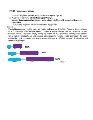 PAINT – rozciąganie obrazu 1. Zaznacz fragment rysunku, któr y chcesz rozciągnąć (rys. 1). 2. Wybierz opcje menu Obraz/Rozciągnij/Pochyl… W polu Rozciąganie/W poziomie: wpisz odpowiednią wartość procentową, np. 200, i kliknij OK. 3. Zaznaczony fr agment zostani e dwukrotnie wydłużony. Uwaga: W polu Rozciąganie można wpisywać liczby całkowite od 1 do 500. Wpisanie liczby większej od 100 powoduje powiększenie obrazu. Wpisanie liczby równej 100 nie powoduje zmiany wielkości obrazu. Wpisanie liczby mniejszej liczby od 100 powoduje zmniejszenie obrazu. Należy jednak wiedzieć, że taki sposób pomniejszania rysunku może prowadzić do utraty szczegółów. Jeśli ponownie powiększymy pomniejszony wcześniej fragment, nie będzie on już zgodny z or yginałem. Rys. 1.