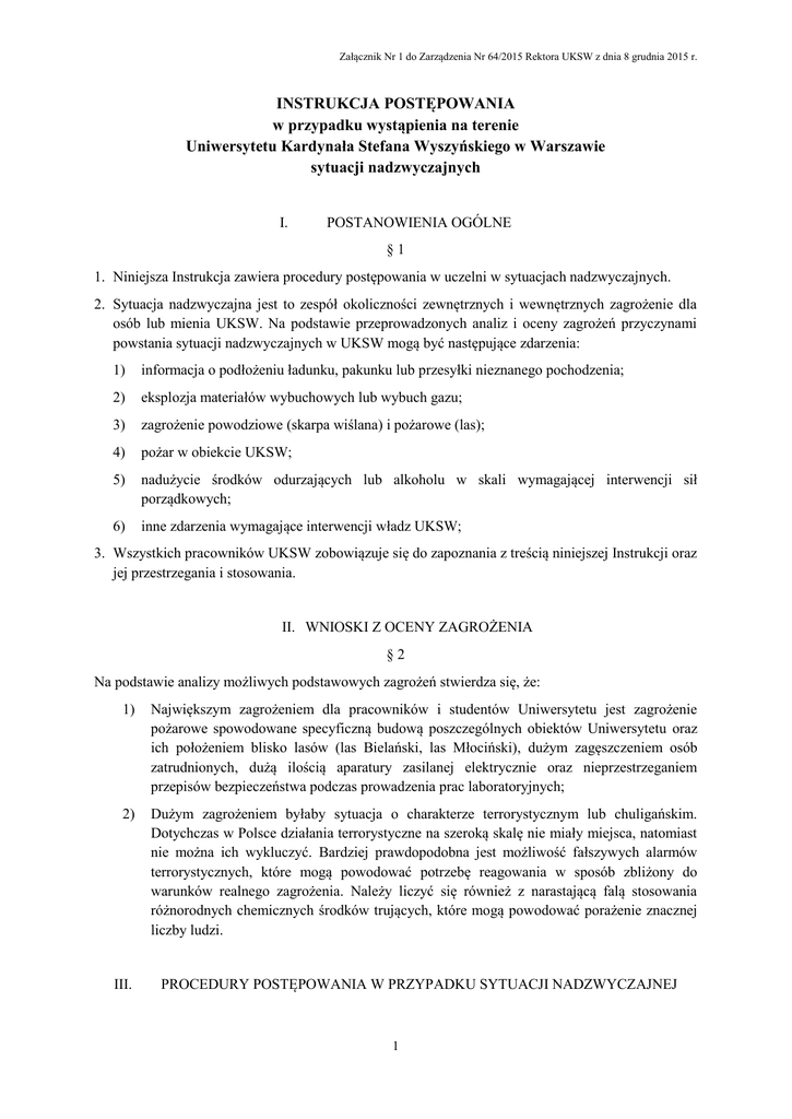 Załącznik Nr 1 do Zarządzenia Nr 64/2015 Rektora UKSW z dnia 8 grudnia 2015 r. INSTRUKCJA POSTĘPOWANIA w przypadku wystąpienia na terenie Uniwersytetu Kardynała Stefana Wyszyńskiego w Warszawie sytuacji nadzwyczajnych I. POSTANOWIENIA OGÓLNE §1 1. Niniejsza Instrukcja zawiera procedury postępowania w uczelni w sytuacjach nadzwyczajnych. 2. Sytuacja nadzwyczajna jest to zespół okoliczności zewnętrznych i wewnętrznych zagrożenie dla osób lub mienia UKSW. Na podstawie przeprowadzonych analiz i oceny zagrożeń przyczynami powstania sytuacji nadzwyczajnych w UKSW mogą być następujące zdarzenia: 1) informacja o podłożeniu ładunku, pakunku lub przesyłki nieznanego pochodzenia; 2) eksplozja materiałów wybuchowych lub wybuch gazu; 3) zagrożenie powodziowe (skarpa wiślana) i pożarowe (las); 4) pożar w obiekcie UKSW; 5) nadużycie środków odurzających lub alkoholu w skali wymagającej interwencji sił porządkowych; 6) inne zdarzenia wymagające interwencji władz UKSW; 3. Wszystkich pracowników UKSW zobowiązuje się do zapoznania z treścią niniejszej Instrukcji oraz jej przestrzegania i stosowania. II. WNIOSKI Z OCENY ZAGROŻENIA §2 Na podstawie analizy możliwych podstawowych zagrożeń stwierdza się, że: 1) Największym zagrożeniem dla pracowników i studentów Uniwersytetu jest zagrożenie pożarowe spowodowane specyficzną budową poszczególnych obiektów Uniwersytetu oraz ich położeniem blisko lasów (las Bielański, las Młociński), dużym zagęszczeniem osób zatrudnionych, dużą ilością aparatury zasilanej elektrycznie oraz nieprzestrzeganiem przepisów bezpieczeństwa podczas prowadzenia prac laboratoryjnych; 2) Dużym zagrożeniem byłaby sytuacja o charakterze terrorystycznym lub chuligańskim. Dotychczas w Polsce działania terrorystyczne na szeroką skalę nie miały miejsca, natomiast nie można ich wykluczyć. Bardziej prawdopodobna jest możliwość fałszywych alarmów terrorystycznych, które mogą powodować potrzebę reagowania w sposób zbliżony do warunków realnego zagrożenia. Należy liczyć się również z narastającą falą stosowania różnorodnych chemicznych środków trujących, które mogą powodować porażenie znacznej liczby ludzi. III. PROCEDURY POSTĘPOWANIA W PRZYPADKU SYTUACJI NADZWYCZAJNEJ 1 Załącznik Nr 1 do Zarządzenia Nr 64/2015 Rektora UKSW z dnia 8 grudnia 2015 r. CZYNNOŚCI: RODZAJ ZAGROŻENIA 2.1. Informacja o podłożeniu ładunku, pakunku lub przesyłki nieznanego pochodzenia Pracownika ochrony lub innej osoby stwierdzającej zagrożenie 1. Nagrywa lub zapisuje informację (zdarzenie) w dzienniku dyżurów. 2. Zawiadamia Kierownika DAG. 3. Informuje kierownika komórki organizacyjnej. 4. Wypełnia ankietę Kierownik Działu Administracyjno -Gospodarczego 1. Zawiadamia Kanclerza* o zaistniałym zdarzeniu, zabezpiecza miejsce zdarzenia, realizuje inne zadania zlecone przez Kanclerza. 2. Sporządza stosowną notatkę służbową. Zespół Reagowania Kryzysowego Prorektora/ Kanclerza W zależności od charakteru i rozmiarów zagrożenia: Szef Zespołu: 1. Zawiadamia Biuro Bezpieczeństwa i Zarządzania Kryzysowego m.st. Warszawy. Wzywa policję. 1. 2. Wzywa do wyznaczonego miejsca pracy – członków Zespołu. Wzywa oddział antyterrorystyczny. 2. 3. Koordynuje działania FOC. Zawiadamia PSP. 3. 4. Nadzoruje przebieg ewakuacji ludzi i mienia. Zarządza ewakuację 4. 5. Kieruje ludzi do budynków 2 Sił ratowniczych Formacji lub Obrony Cywilnej współdziałającyc h FOC organizuje działania członków formacji wg. Wytycznych i we współpracy z Zespołem Reagowania Kryzysowego. Realizują zadania w zależności od zaistniałej sytuacji. UWAGI *osoba, która otrzymała pisemne upoważnienie Rektora do wzywania na teren UKSW policji lub innych sił porządkowych; **podstawą do ewakuacji są wewnętrzne, zatwierdzone przez Rektora plany ewakuacji z każdego Załącznik Nr 1 do Zarządzenia Nr 64/2015 Rektora UKSW z dnia 8 grudnia 2015 r. dotyczącą rozmówcy Załącznik nr 4 do Zarządzenia pracowników ** zastępczych. 6. Organizuje ochronę mienia. Sporządza notatkę służbową z zaistniałego zdarzenia 5. 7. Prognozuje rozwój wydarzeń. 8. Przygotowuje pisemną informację dla potrzeb Biura Bezpieczeństwa i Zarządzania Kryzysowego m.st. Warszawy. 3 obiektu. Załącznik Nr 1 do Zarządzenia Nr 64/2015 Rektora UKSW z dnia 8 grudnia 2015 r. CZYNNOŚCI: RODZAJ Pracownika ochrony Kierownik Działu ZAGROŻEN lub innej osoby AdministracyjnoIA stwierdzającej Gospodarczego zagrożenie 2.2 Eksplozja 1. Zawiadamia materiałów Kierownika DAG o wybuchowych zdarzeniu. lub wybuch gazu 2. Informuje kierownika komórki organizacyjnej. Zawiadamia Kanclerza. Przybywa na miejsce Zdarzenia i do czasu przybycia Kanclerza oraz profesjonalnych sił ratowniczych kieruje akcją ratowniczą, a w razie braku osób z kierownictwa zarządza ewakuację. Prorektora/ Kanclerza 1. Zawiadamia Rektora. 2. Zarządza ewakuację. 3. Wzywa pogotowie ratunkowe. Zespołu Reagowania Kryzysowego Formacji obrony cywilnej Szef Zespołu: FOC organizuje działania członków formacji wg. Wytycznych i we współpracy z Zespołem Reagowania Kryzysowego. 1. zawiadamia Biuro Bezpieczeństwa i Zarządzania Kryzysowego m st. Warszawy. 2. Wzywa do 4. Wzywa wyznaczonego pogotowie Gazowe. miejsca pracy członków Zespołu. 5. Zawiadamia 3. Koordynuje działania policję. FOC. 6. Zawiadamia PSP 4. Nadzoruje przebieg ewakuacji ludzi i 7. Do czasu mienia. przybycia profesjonalnych sil 5. Kieruje ludzi do budynków zastępczych. ratowniczych kieruje 6. Organizuje ochronę akcją ratowniczą. 4 Sił ratowniczych lub współdziałających Realizują zadania w zależności od zaistniałej sytuacji. UWAGI Załącznik Nr 1 do Zarządzenia Nr 64/2015 Rektora UKSW z dnia 8 grudnia 2015 r. mienia. 7. Prognozuje rozwój wydarzeń. 8. Przygotowuje pisemną informację dla potrzeb Biura Bezpieczeństwa i Zarządzania Kryzysowego m.st. Warszawy. 5 Załącznik