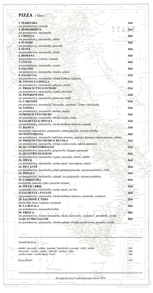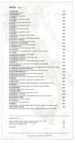 PIZZA ( 32cm ) 1. MARINARA sos pomidorowy, czosnek 2. MARGHERITA sos pomidorowy, mozzarella 3. CIPOLLA sos pomidorowy, mozzarella, cebula 4. FUNGHI sos pomidorowy, mozzarella, pieczarki 5. OLIVE sos pomidorowy, mozzarella, oliwki 6. ROMANA sos pomidorowy, anchois, czosnek 7. COTTO sos pomidorowy, mozzarella, szynka 8. SALAME sos pomidorowy, mozzarella, włoskie salami 9. SALSICCIA sos pomidorowy, mozzarella, włoska kiełbasa salsiccia 10. TONNO E CIPOLLA sos pomidorowy, mozzarella, tuńczyk, cebula 11. PROSCIUTTO E FUNGHI sos pomidorowy, mozzarella, szynka, pieczarki 12. PEPERONCINO sos pomidorowy, mozzarella, parmezan, chilli 13. CARCIOFI sos pomidorowy, mozzarella, karczochy „rzymskie”, krem z karczocha 14. NAPOLI sos pomidorowy, mozzarella, anchois, kapary 15.PROSCIUTTO CRUDO sos pomidorowy, mozzarella, włoska szynka crudo 16.SALSICCIA E SPiNACI sos pomidorowy, mozzarella, włoska kiełbasa salsiccia, szpinak 17. BIANCA mozzarella, mascarpone, gorgonzola, cebula parzona, orzechy włoskie 18.VEGETARIANA sos pomidorowy, mozzarella, bakłażan smażony, papryka duszona, cebula parzona, cukinia 19. PROSCIUTTO CRUDO E RUCOLA sos pomidorowy, mozzarella, włoska szynka crudo, rukola, parmezan 20. QUATTRO FORMAGGI sos pomidorowy, mozzarella, gorgonzola, taleggio, parmezan 21. QUATTRO STAGIONI sos pomidorowy, mozzarella, szynka, pieczarki, oliwki, cebula 22. SPECK sos pomidorowy, mozzarella, szynka speck, mascarpone, rukola 23. PICCANTE sos pomidorowy, mozzarella, salami spianata piccante, suszone pomidory, chilli 24. SPINACI sos pomidorowy, mozzarella, szpinak, ser gorgonzola, suszone pomidory 25. CARBONARA mozzarella, pancetta, jajko, pecorino romano 26. SPECK e BRIE sos pomidorowy, mozzarella, szynka speck, ser brie 27.SALSICCIA e PATATE sos pomidorowy, mozzarella, włoska kiełbasa salsiccia, ziemniaki, rozmaryn 28. SALMONE E TIMO mozzarella, łosoś wędzony, tymianek 29. LA BUFALA sos pomidorowy, mozzarella bufala 30. FRESCA sos pomidorowy, świeża mozzarella, rukola, karczochy „rzymskie”, pomidorki, oliwki 31.QUATTRO SALUMI sos pomidorowy, mozzarella, włoskie salami, włoska szynka crudo, pancetta, szynka 14zł 16zł 18zł 18zł 18zł 18zł 20zł 20zł 22zł 22zł 22zł 22zł 24zł 24zł 24zł 24zł 24zł 26zł 26zł 26zł 26zł 26zł 26zł 26zł 26zł 26zł 26zł 26zł 28zł 28zł 28zł Dodatki do pizzy: oliwki / pieczarki / cebula / papryka / pomidorki / czosnek / chilli / rukola karczochy / szynka / salami / tuńczyk / anchois / jajko szynka crudo / szynka speck / łosoś +2zł +4zł +6zł pizza pół/pół +2zł Do grup powyżej 8 osób doliczamy serwis 10 % ANTIPASTI (Przystawki) PROFUMI EMILIANI cztery rodzaje włoskich wędlin, radicchio, roszponka, ricotta, domowa ciabatta 21zł PROFUMI DI MONTAGNA pięć rodzajów włoskich serów, szpinak, orzechy włoskie, dressing , domowa ciabatta 21zł FOCACCIA rozmaryn, czosnek 8zł INSALATE (Sałaty) FRUTTI DELLA TERRA rukola, gruszka, orzechy włoskie, parmezan, dressing 18zł IL CRUDO D'ITALIA rukola, szynka crudo, parmezan, pomidory cherry, domowa ciabatta 18zł ZUCCHINO cukinia, pomidory cherry, ser ricotta, parmezan, orzechy włoskie, orzechy pinii, domowa ciabatta 18zł DOLCI (Desery) TIRAMISU 6zł BEVANDE (Napoje) WODA 0.3 l gazowana / niegazowana COLA / COLA ZERO/ SPRITE / FANTA 0.33 l SOK 0.3 l pomarańczowy / jabłkowy / czarna porzeczka / pomidorowy SAN PELLEGRINO 0.75 l włoska woda gazowana AQUA PANNA 0.75 l włoska woda niegazowana SODA 0.3 l orange / lemon / mojito / pinacolada CHINO 0.3 l 4zł 5zł 5zł 12zł 12zł 7zł 7zł CAFFETERIA (Kawa/Herbata) CAFFE ESPRESSO CAFFE ESPRESSO DOPPIO CAFFE LUNGO + mleko CAPPUCCINO CAFFE LATTE 5zł 8zł 7zł +1zł 8zł 9zł HERBATA SIROCCO 0,4 ml centle blue – el grey golden assam – czarna japanese sencha – zielona red kiss – owocowa maroccan mint - ziołowa 9zł ALCOL (Alkohol) WINO STOŁOWE białe / czerwone Kieliszek 0.15 l Karafka 0.25 l Karafka 0.5 l Karafka 1.0 l PIWO Moretti 0,33 l Peroni 0.33 l Żywiec 0.33 l Heineken 0.33 l 8zł 12zł 20zł 36zł 8zł 8zł 7zł 7zł Do grup powyżej 8 osób doliczamy serwis 10%
