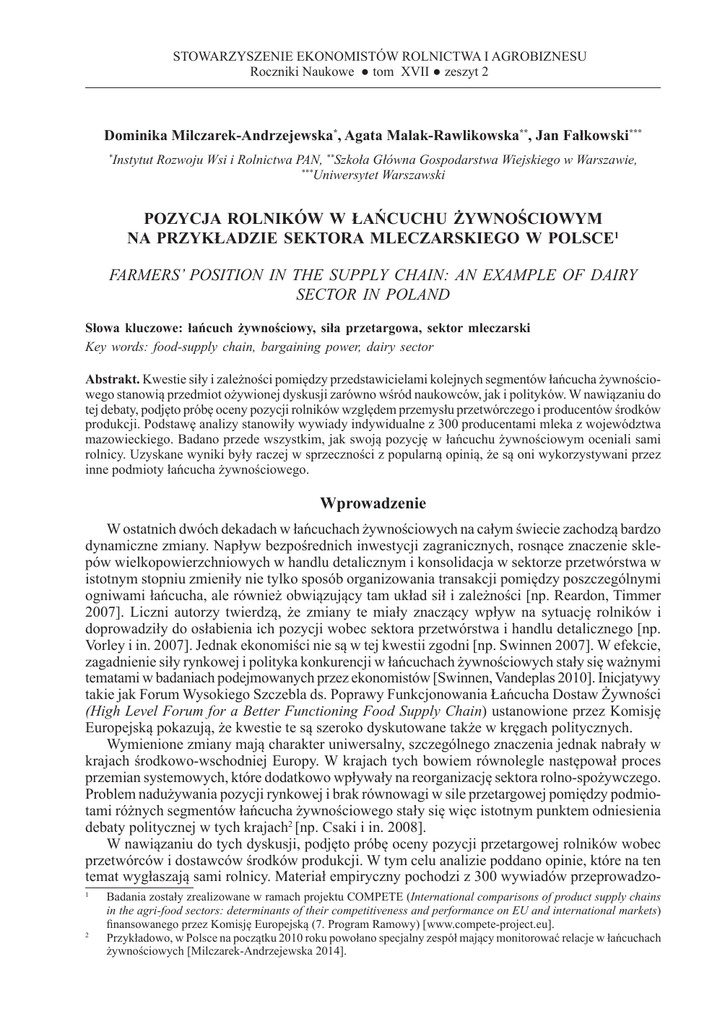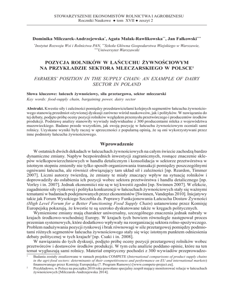STOWARZYSZENIE EKONOMISTÓW ROLNICTWA AGROBIZNESU Pozycja rolników w łańcuchu żywnościowym na przykładzie sektora Imleczarskiego w Polsce Roczniki Naukowe ● tom XVII ● zeszyt 2 163 Dominika Milczarek-Andrzejewska*, Agata Malak-Rawlikowska**, Jan Fałkowski*** Instytut Rozwoju Wsi i Rolnictwa PAN, **Szkoła Główna Gospodarstwa Wiejskiego w Warszawie, *** Uniwersytet Warszawski * POZYCJA ROLNIKÓW W ŁAŃCUCHU ŻYWNOŚCIOWYM NA PRZYKŁADZIE SEKTORA MLECZARSKIEGO W POLSCE1 FARMERS’ POSITION IN THE SUPPLY CHAIN: AN EXAMPLE OF DAIRY SECTOR IN POLAND Słowa kluczowe: łańcuch żywnościowy, siła przetargowa, sektor mleczarski Key words: food-supply chain, bargaining power, dairy sector Abstrakt. Kwestie siły i zależności pomiędzy przedstawicielami kolejnych segmentów łańcucha żywnościowego stanowią przedmiot ożywionej dyskusji zarówno wśród naukowców, jak i polityków. W nawiązaniu do tej debaty, podjęto próbę oceny pozycji rolników względem przemysłu przetwórczego i producentów środków produkcji. Podstawę analizy stanowiły wywiady indywidualne z 300 producentami mleka z województwa mazowieckiego. Badano przede wszystkim, jak swoją pozycję w łańcuchu żywnościowym oceniali sami rolnicy. Uzyskane wyniki były raczej w sprzeczności z popularną opinią, że są oni wykorzystywani przez inne podmioty łańcucha żywnościowego. Wprowadzenie W ostatnich dwóch dekadach w łańcuchach żywnościowych na całym świecie zachodzą bardzo dynamiczne zmiany. Napływ bezpośrednich inwestycji zagranicznych, rosnące znaczenie sklepów wielkopowierzchniowych w handlu detalicznym i konsolidacja w sektorze przetwórstwa w istotnym stopniu zmieniły nie tylko sposób organizowania transakcji pomiędzy poszczególnymi ogniwami łańcucha, ale również obwiązujący tam układ sił i zależności [np. Reardon, Timmer 2007]. Liczni autorzy twierdzą, że zmiany te miały znaczący wpływ na sytuację rolników i doprowadziły do osłabienia ich pozycji wobec sektora przetwórstwa i handlu detalicznego [np. Vorley i in. 2007]. Jednak ekonomiści nie są w tej kwestii zgodni [np. Swinnen 2007]. W efekcie, zagadnienie siły rynkowej i polityka konkurencji w łańcuchach żywnościowych stały się ważnymi tematami w badaniach podejmowanych przez ekonomistów [Swinnen, Vandeplas 2010]. Inicjatywy takie jak Forum Wysokiego Szczebla ds. Poprawy Funkcjonowania Łańcucha Dostaw Żywności (High Level Forum for a Better Functioning Food Supply Chain) ustanowione przez Komisję Europejską pokazują, że kwestie te są szeroko dyskutowane także w kręgach politycznych. Wymienione zmiany mają charakter uniwersalny, szczególnego znaczenia jednak nabrały w krajach środkowo-wschodniej Europy. W krajach tych bowiem równolegle następował proces przemian systemowych, które dodatkowo wpływały na reorganizację sektora rolno-spożywczego. Problem nadużywania pozycji rynkowej i brak równowagi w sile przetargowej pomiędzy podmiotami różnych segmentów łańcucha żywnościowego stały się więc istotnym punktem odniesienia debaty politycznej w tych krajach2 [np. Csaki i in. 2008]. W nawiązaniu do tych dyskusji, podjęto próbę oceny pozycji przetargowej rolników wobec przetwórców i dostawców środków produkcji. W tym celu analizie poddano opinie, które na ten temat wygłaszają sami rolnicy. Materiał empiryczny pochodzi z 300 wywiadów przeprowadzo 1 2 Badania zostały zrealizowane w ramach projektu COMPETE (International comparisons of product supply chains in the agri-food sectors: determinants of their competitiveness and performance on EU and international markets) finansowanego przez Komisję Europejską (7. Program Ramowy) [www.compete-project.eu]. Przykładowo, w Polsce na początku 2010 roku powołano specjalny zespół mający monitorować relacje w łańcuchach żywnościowych [Milczarek-Andrzejewska 2014]. 164 Dominika Milczarek-Andrzejewska, Agata Malak-Rawlikowska, Jan Fałkowski nych w 2014 roku z producentami mleka w województwie mazowieckim. Choć badana próba była dobierana tak, aby pod względem wielkości stada odpowiadała rozkładowi gospodarstw mleczarskich w województwie mazowieckim, to przy uogólnianiu uzyskanych wyników, nawet w kontekście badanego województwa, należy zachować dużą ostrożność. Przede wszystkim z tego względu, że siła przetargowa (pozycja w łańcuchu) jest składową bardzo wielu czynników, których w badaniu prawdopodobnie nie uwzględniono. Wybór sektora mleczarskiego do analizy podyktowany był dwiema podstawowymi kwestiami. Z jednej strony, w literaturze przedmiotu często podkreśla się, że sektor ten charakteryzuje się rozdrobnioną strukturą gospodarstw rolnych, złą sytuacją dochodową małych producentów rolnych i słabą pozycją rolników w stosunku do dużych przedsiębiorstw przetwórstwa żywności [Milczarek-Andrzejewska 2014]. Z drugiej strony, polski sektor mleczarski został poddany gruntownej modernizacji [Dries i in. 2011]. W związku z tym, analiza relacji zachodzących w ramach łańcucha mleczarskiego daje możliwość uchwycenia kontekstu charakteryzującego się dużą dynamiką, zarówno gdy chodzi o tempo, jak i o zakres dokonujących się tam zmian. W badaniu skoncentrowano się na trzech segmentach łańcucha żywnościowego, a mianowicie na dostawcach czynników produkcji, rolnikach i przetwórcach. Według wiedzy autorów, takie badania nie były dotychczas prowadzone. Podejście to pozwala nie tylko przedstawić bardziej szczegółowy obraz relacji między podmiotami, ale także ocenić, przynajmniej w części, względną pozycję rolników wobec dostawców i odbiorców. Pozwala ono również na pokazanie relacji rolników z dostawcami środków produkcji (w naszym przypadku z dostawcami pasz), która w przeciwieństwie do relacji z mleczarniami, jest stosunkowo słabo udokumentowana w literaturze. Materiał i metodyka badań W badaniu wykorzystano mat