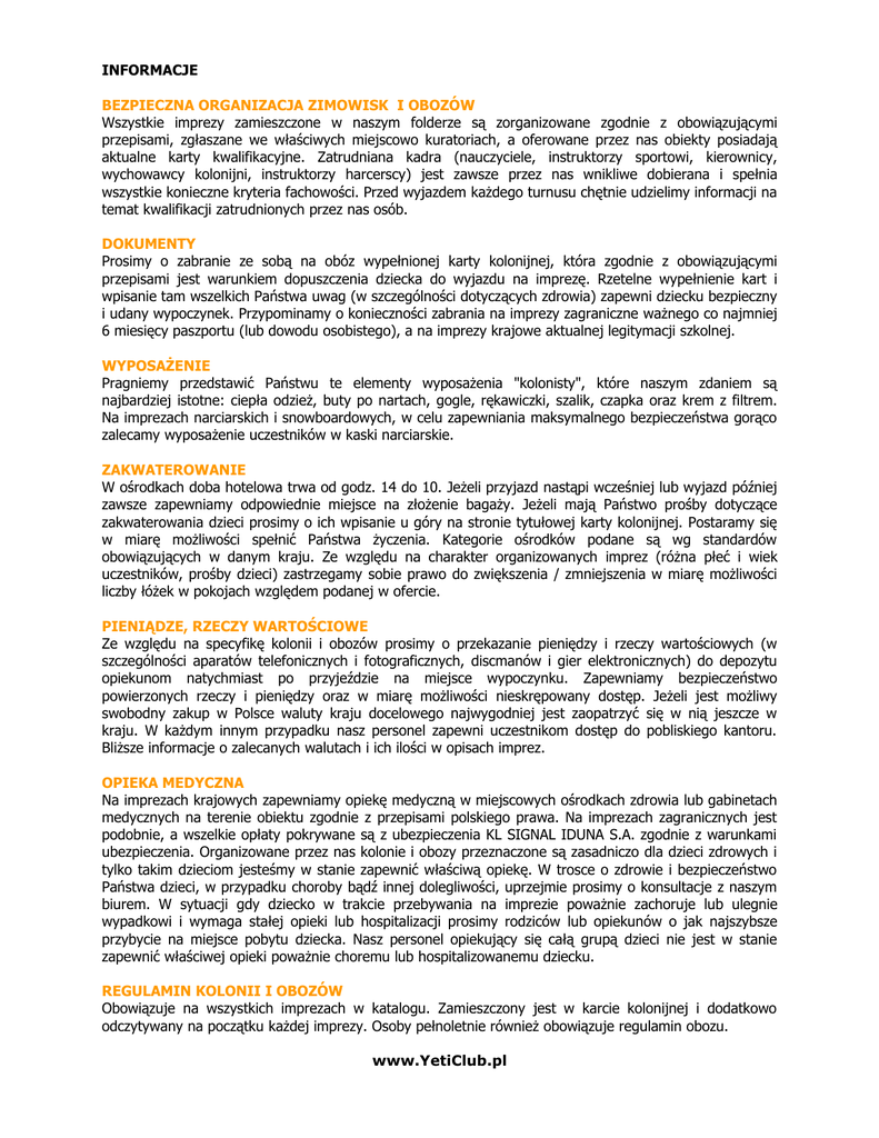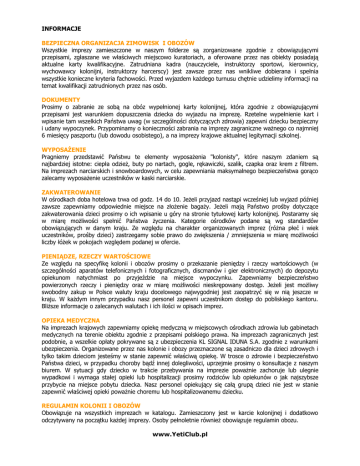 INFORMACJE BEZPIECZNA ORGANIZACJA ZIMOWISK I OBOZÓW Wszystkie imprezy zamieszczone w naszym folderze są zorganizowane zgodnie z obowiązującymi przepisami, zgłaszane we właściwych miejscowo kuratoriach, a oferowane przez nas obiekty posiadają aktualne karty kwalifikacyjne. Zatrudniana kadra (nauczyciele, instruktorzy sportowi, kierownicy, wychowawcy kolonijni, instruktorzy harcerscy) jest zawsze przez nas wnikliwe dobierana i spełnia wszystkie konieczne kryteria fachowości. Przed wyjazdem każdego turnusu chętnie udzielimy informacji na temat kwalifikacji zatrudnionych przez nas osób. DOKUMENTY Prosimy o zabranie ze sobą na obóz wypełnionej karty kolonijnej, która zgodnie z obowiązującymi przepisami jest warunkiem dopuszczenia dziecka do wyjazdu na imprezę. Rzetelne wypełnienie kart i wpisanie tam wszelkich Państwa uwag (w szczególności dotyczących zdrowia) zapewni dziecku bezpieczny i udany wypoczynek. Przypominamy o konieczności zabrania na imprezy zagraniczne ważnego co najmniej 6 miesięcy paszportu (lub dowodu osobistego), a na imprezy krajowe aktualnej legitymacji szkolnej. WYPOSAŻENIE Pragniemy przedstawić Państwu te elementy wyposażenia "kolonisty", które naszym zdaniem są najbardziej istotne: ciepła odzież, buty po nartach, gogle, rękawiczki, szalik, czapka oraz krem z filtrem. Na imprezach narciarskich i snowboardowych, w celu zapewniania maksymalnego bezpieczeństwa gorąco zalecamy wyposażenie uczestników w kaski narciarskie. ZAKWATEROWANIE W ośrodkach doba hotelowa trwa od godz. 14 do 10. Jeżeli przyjazd nastąpi wcześniej lub wyjazd później zawsze zapewniamy odpowiednie miejsce na złożenie bagaży. Jeżeli mają Państwo prośby dotyczące zakwaterowania dzieci prosimy o ich wpisanie u góry na stronie tytułowej karty kolonijnej. Postaramy się w miarę możliwości spełnić Państwa życzenia. Kategorie ośrodków podane są wg standardów obowiązujących w danym kraju. Ze względu na charakter organizowanych imprez (różna płeć i wiek uczestników, prośby dzieci) zastrzegamy sobie prawo do zwiększenia / zmniejszenia w miarę możliwości liczby łóżek w pokojach względem podanej w ofercie. PIENIĄDZE, RZECZY WARTOŚCIOWE Ze względu na specyfikę kolonii i obozów prosimy o przekazanie pieniędzy i rzeczy wartościowych (w szczególności aparatów telefonicznych i fotograficznych, discmanów i gier elektronicznych) do depozytu opiekunom natychmiast po przyjeździe na miejsce wypoczynku. Zapewniamy bezpieczeństwo powierzonych rzeczy i pieniędzy oraz w miarę możliwości nieskrępowany dostęp. Jeżeli jest możliwy swobodny zakup w Polsce waluty kraju docelowego najwygodniej jest zaopatrzyć się w nią jeszcze w kraju. W każdym innym przypadku nasz personel zapewni uczestnikom dostęp do pobliskiego kantoru. Bliższe informacje o zalecanych walutach i ich ilości w opisach imprez. OPIEKA MEDYCZNA Na imprezach krajowych zapewniamy opiekę medyczną w miejscowych ośrodkach zdrowia lub gabinetach medycznych na terenie obiektu zgodnie z przepisami polskiego prawa. Na imprezach zagranicznych jest podobnie, a wszelkie opłaty pokrywane są z ubezpieczenia KL SIGNAL IDUNA S.A. zgodnie z warunkami ubezpieczenia. Organizowane przez nas kolonie i obozy przeznaczone są zasadniczo dla dzieci zdrowych i tylko takim dzieciom jesteśmy w stanie zapewnić właściwą opiekę. W trosce o zdrowie i bezpieczeństwo Państwa dzieci, w przypadku choroby bądź innej dolegliwości, uprzejmie prosimy o konsultacje z naszym biurem. W sytuacji gdy dziecko w trakcie przebywania na imprezie poważnie zachoruje lub ulegnie wypadkowi i wymaga stałej opieki lub hospitalizacji prosimy rodziców lub opiekunów o jak najszybsze przybycie na miejsce pobytu dziecka. Nasz personel opiekujący się całą grupą dzieci nie jest w stanie zapewnić właściwej opieki poważnie choremu lub hospitalizowanemu dziecku. REGULAMIN KOLONII I OBOZÓW Obowiązuje na wszystkich imprezach w katalogu. Zamieszczony jest w karcie kolonijnej i dodatkowo odczytywany na początku każdej imprezy. Osoby pełnoletnie również obowiązuje regulamin obozu. www.YetiClub.pl PROGRAM, WYCIECZKI FAKULTATYWNE Opisany w programie imprezy program turystyczny, rekreacyjny i sportowy jest realizowany w zależności od ilości chętnych i warunków pogodowych. Wycieczki fakultatywne odbywają się dla min. 20 osób (chyba, że Oferta wskazuje inaczej) i są dodatkowo płatne na miejscu u opiekuna grupy. W przypadku mniejszej ilości osób ceny wycieczek mogę ulec zmianie. WYŻYWIENIE Na naszych obozach najczęściej serwowana jest kuchnia regionalna lub europejska, jednakże dokładamy wszelkich starań, aby posiłki były dopasowane do preferencji smakowych naszych obozowiczów. Wszelkie życzenia lub zastrzeżenia odnośnie posiłków prosimy, w pierwszej kolejności, zgłaszać kadrze obecnej na obozie. W większości przypadków istnieje możliwość dokładek, co również prosimy sygnalizować wychowawcom. Na czas wycieczek fakultatywnych uczestnicy otrzymują suchy prowiant zamiast przewidywanego posiłku w ośrodku. JAZDA NA NARTACH I SNOWBOARDZIE Na trasach narciarskich wszyscy uczestnicy pozostają pod opieką instruktora i wychowawców. Ze względu na bezpieczeństwo decyzję o odbyciu się zajęć narciarskich i snowboardowych, ich rodzaju i formie oraz wyborze stoków podejmuje kadra zimowiska. Codziennie dla chętnych jest organizowana nauka jazdy, która odbywa się w grupach w zależności od umiejętności. Nauka obejmuje m. in. techniki jazdy klasycznej, carvingowej, elementy jazdy sportowej, w puchu, na muldach. Co 2-3 godz. jest zmiana grupy. Młodzież średnio przebywa ok.. 6 godz. dziennie na stoku. Uczestnicy powinni pamiętać, że nie mogą zostawić sprzętu narciarskiego bez opieki. (Dekalog FIS). DYSKOTEKI Dla "kolonistów" w wieku do 13 lat organizowane są na miejscu wypoczynku w ośrodku lub hotelu. Młodzież powyżej 13 lat często korzysta z dy