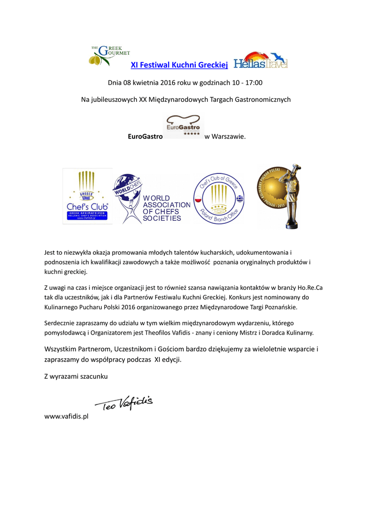 XI Festiwal Kuchni Greckiej Dnia 08 kwietnia 2016 roku w godzinach 10 - 17:00 Na jubileuszowych XX Międzynarodowych Targach Gastronomicznych EuroGastro w Warszawie. Jest to niezwykła okazja promowania młodych talentów kucharskich, udokumentowania i podnoszenia ich kwalifikacji zawodowych a także możliwość poznania oryginalnych produktów i kuchni greckiej. Z uwagi na czas i miejsce organizacji jest to również szansa nawiązania kontaktów w branży Ho.Re.Ca tak dla uczestników, jak i dla Partnerów Festiwalu Kuchni Greckiej. Konkurs jest nominowany do Kulinarnego Pucharu Polski 2016 organizowanego przez Międzynarodowe Targi Poznańskie. Serdecznie zapraszamy do udziału w tym wielkim międzynarodowym wydarzeniu, którego pomysłodawcą i Organizatorem jest Theofilos Vafidis - znany i ceniony Mistrz i Doradca Kulinarny. Wszystkim Partnerom, Uczestnikom i Gościom bardzo dziękujemy za wieloletnie wsparcie i zapraszamy do współpracy podczas XI edycji. Z wyrazami szacunku www.vafidis.pl