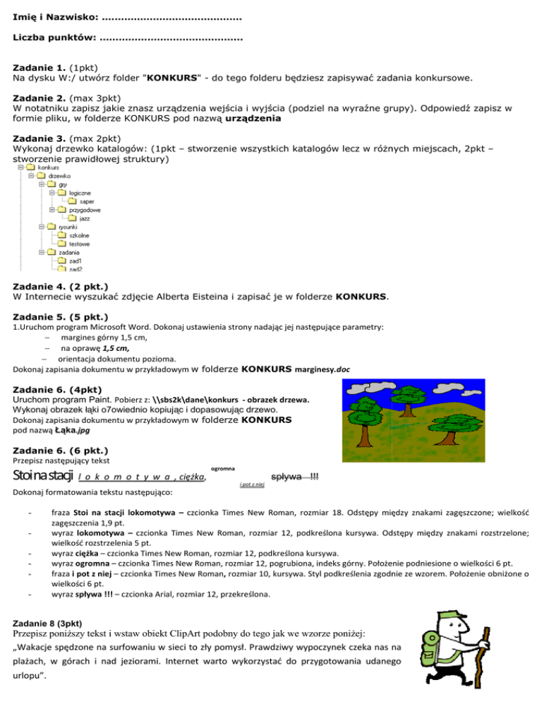 Imię i Nazwisko: .……………………………………. ……………………………………. Liczba punktów: ……………………………………... Zadanie 1. (1pkt) Na dysku W:/ utwórz folder "KONKURS KONKURS" - do tego folderu będziesz zapisywać zadania konkursowe. Zadanie 2. (max 3pkt) W notatniku zapisz jakie znasz urządzenia wejścia i wyjścia (podziel na wyraźne grupy). grupy) Odpowiedź zapisz w formie pliku, w folderze KONKURS pod nazwą urządzenia Zadanie 3. (max 2pkt) Wykonaj drzewko katalogów: (1pkt – stworzenie wszystkich katalogów lecz w róŜnych miejscach, 2pkt – stworzenie prawidłowej struktury) Zadanie 4. (2 pkt.) W Internecie wyszukać zdjęcie Alberta Eisteina i zapisać je w folderze KONKURS. Zadanie 5. (5 pkt.) 1.Uruchom program Microsoft Word. Dokonaj ustawienia strony nadając jej następujące parametry: − margines górny 1,5 cm, − na oprawę 1,5 cm, − orientacja dokumentu pozioma. Dokonaj zapisania dokumentu w przykładowym w folderze KONKURS marginesy.doc Zadanie 6. (4pkt) Uruchom program Paint. Pobierz z: \\sbs2k\dane dane\konkurs - obrazek drzewa. Wykonaj obrazek łąki o7owiednio kopiującc i dopasowując dopasowuj drzewo. Dokonaj zapisania dokumentu w przykładowym w folderze KONKURS pod nazwą Łąka.jpg Zadanie 6. (6 pkt.) Przepisz następujący tekst Stoinastacji l o k o m o t y w a , ciężka, ciężka ogromna spływa !!! i pot z niej Dokonaj formatowania tekstu następująco: - fraza Stoi na stacji lokomotywa – czcionka Times New Roman, rozmiar 18. Odstępy między znakami zagęszczone; wielkość zagęszczenia 1,9 pt. wyraz lokomotywa – czcionka Times New Roman, rozmiar 12, podkreślona kursywa. Odstępy Odstęp między znakami rozstrzelone; wielkość rozstrzelenia 5 pt. wyraz ciężka – czcionka Times New Roman, rozmiar 12, podkreślona kursywa. wyraz ogromna – czcionka Times New Roman, rozmiar 12, pogrubiona, indeks górny. Położenie podniesione o wielkości 6 pt. fraza i pot z niej – czcionka Times New Roman, Roman rozmiar 10, kursywa. Styl podkreślenia zgodnie ze wzorem. Położenie obniżone o wielkości 6 pt. wyraz spływa !!! – czcionka Arial, rozmiar 12, przekreślona. Zadanie 8 (3pkt) Przepisz poniŜszy tekst i wstaw obiekt iekt ClipArt podobny do tego jak we wzorze poniŜej: poni „Wakacje spędzone na surfowaniu w sieci to zły pomysł. Prawdziwy wypoczynek czeka nas na plażach, w górach i nad jeziorami. Internet warto wykorzystać do przygotowania udanego urlopu”. Zadanie 9 (6pkt) Dokonaj formatowania tekstu. Tekst, Bajka o Ciepłym Puchatku pobierz: \\sbs2k\dane\konkurs . - 1 akapit: środkowanie, Arial, rozmiar 18 , kolor niebieski - 2 akapit: wyjustowanie, Arial, rozmiar 12, pierwszy wiersz 1,25cm - 3 akapit: wyjustowanie, Verdana, rozmiar 10, wcięcie z lewej 2cm, wcięcie z prawej 1cm - 4 – 5 akapit: odległości między wierszami 1,5 znaku, odległości między akapitami 12pkt (po akapice), wyjustowane, rozmiar 9, kolor ciemnoczerwony!, pogrubienie, wysunięcie 2cm - 6 – 7 akapit: do prawej, cień, rozmiar 22, podwójne podkreślenie, pogrubienie, kursywa Zadanie 10 (5pkt) Wykorzystując obiekty WordArt wpisz następujący tekst „Edytor napisów ozdobnych” i dokonaj jego formatowania zgodnie ze wzorem: - czcionka Arial Black, rozmiar 30, - kształt obiektu – wklęśnięcie u dołu, - kolor wypełnienia zielony, efekt jasnoszarego cienia, - rozmiar obiektu: 2 cm wysokości, 10 cm szerokości. Zadanie 11 (5pkt) Utwórz tabelę według wzoru i dokonaj jej formatowania. Kategoria Cena Jednostkowa Ilość na Składzie Ilość Potrzebna Krzesło 76 zł 12 15 Szafka Biurko 134 zł 235 zł 14 2 9 8 Wartość Zapasów Zamówienie (tak/nie) Wartość Zamówienia Funkcja logiczna Funkcja logiczna Razem wartość zamówienia Zadanie 12 (5pkt) Pobierz arkusz POLA FIGUR: \\sbs2k\dane\konkurs. W komórkach C7, F7 i I8 wprowadź poprawki według wzoru. Zapisz arkusz pod niezmienioną nazwą w katalogu KONKURS. Wzór: W komórce C7 wpisz formułę =C5*C6 W komórce F7 wpisz formułę =0,5*F5*F6 W komórce I8 wpisz formułę =0,5*(I5+I6)*I7