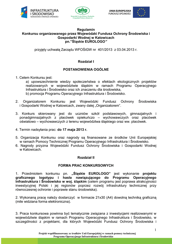 Regulamin Konkursu organizowanego przez Wojewódzki Fundusz Ochrony Środowiska i Gospodarki Wodnej w Katowicach pn.”Śląskie EUROLOGO” przyjęty uchwałą Zarządu WFOŚiGW nr 401/2013 z 03.04.2013 r. Rozdział I POSTANOWIENIA OGÓLNE 1. Celem Konkursu jest: a) upowszechnienie wiedzy społeczeństwa o efektach ekologicznych projektów realizowanych w województwie śląskim w ramach Programu Operacyjnego Infrastruktura i Środowisko oraz ich znaczeniu dla środowiska, b) promocja Programu Operacyjnego Infrastruktura i Środowisko. 2. Organizatorem Konkursu jest Wojewódzki Fundusz Ochrony i Gospodarki Wodnej w Katowicach, zwany dalej „Organizatorem”. Środowiska 3. Konkurs skierowany jest do uczniów szkół podstawowych, gimnazjalnych i ponadgimnazjalnych z placówek opiekuńczo – wychowawczych oraz placówek oświatowo – wychowawczych z terenu województwa śląskiego oraz ww. placówek. 4. Termin nadsyłania prac: do 17 maja 2013 r. 5. Organizacja Konkursu oraz nagrody są finansowane ze środków Unii Europejskiej w ramach Pomocy Technicznej Programu Operacyjnego Infrastruktura i Środowisko. 6. Nagrody przyzna Wojewódzki Fundusz Ochrony Środowiska i Gospodarki Wodnej w Katowicach. Rozdział II FORMA PRAC KONKURSOWYCH 1. Przedmiotem konkursu pn. „Śląskie EUROLOGO” jest wykonanie projektu graficznego logotypu i hasła nawiązującego do Programu Operacyjnego Infrastruktura i Środowisko w woj. śląskim (celem programu jest poprawa atrakcyjności inwestycyjnej Polski i jej regionów poprzez rozwój infrastruktury technicznej przy równoczesnej ochronie i poprawie stanu środowiska). 2. Wykonaną pracę należy dostarczyć w formacie 21x30 (A4) dowolną techniką graficzną (mile widziana forma elektroniczna). 3. Praca konkursowa powinna być tematycznie związana z inwestycjami realizowanymi w województwie śląskim w ramach Programu Operacyjnego Infrastruktura i Środowisko, w szczególności z projektami, dla których Wojewódzki Fundusz Ochrony Środowiska i Projekt współfinansowany ze środków Unii Europejskiej w ramach pomocy technicznej Programu Operacyjnego Infrastruktura i Środowisko 1 Gospodarki Wodnej w Katowicach jest Instytucją Wdrażającą. Wykaz projektów (inwestycji) znajduje się w punkcie 4. 4. Wykaz projektów POIiŚ w województwie śląskim: Beneficjent - tytuł projektu 1. Gmina Kłobuck - Uporządkowanie gospodarki ściekowej na terenie Gminy Kłobuck poprzez budowę kanalizacji sanitarnej. 2. Gmina Buczkowice - Budowa kanalizacji sanitarnej w Gminie Buczkowice. 3. Gmina Poczesna - Budowa kanalizacji sanitarnej w Brzezinach Nowych, Brzezinach Kolonii, Sobuczynie i we Wrzosowej. 4. Zakład Gospodarki Odpadami SA w Bielsku-Białej - Budowa kompleksowego systemu gospodarki odpadami dla miasta Bielsko-Biała i gmin powiatu bielskiego. 5. Przedsiębiorstwo Gospodarki Komunalnej i Mieszkaniowej Sp. z o.o. - Budowa systemu kanalizacji w Gminie Łaziska Górne. 6. Gmina Myszków - Uporządkowanie gospodarki wodno-ściekowej na terenie miasta Myszków – etap I i II 7. Gmina Wisła - Rozbudowa sieci wodociągowej i kanalizacji sanitarnej w aglomeracji Wisła – etap III. 8. Gmina Konopiska - Uporządkowanie gospodarki ściekowej na terenie Gminy Konopiska. 9. Gmina Jasienica - Kanalizacja sanitarna Gminy Jasienica w ramach ochrony zlewni zbiornika Goczałkowickiego. 10. Miejski Zakład Składowania Odpadów Spółka z o.o. w Sosnowcu - Budowa kompleksowego systemu gospodarki odpadami w Sosnowcu. 11. Gmina Jaworze - Budowa kanalizacji sanitarnej w Gminie Jaworze. 12. Gmina Wojkowice - Budowa kanalizacji sanitarnej i deszczowej na terenie Miasta Wojkowice – etap I. 13. Częstochowskie Przedsiębiorstwo Komunalne Sp. z o.o. - Rozbudowa Zakładu Zagospodarowania Odpadów dla Subregionu Północnego Województwa Śląskiego. 14. Gmina Świętochłowice - Oczyszczenie i zabezpieczenie przed wtórną degradacją stawu Kalina oraz rewitalizacja terenu przyległego. 15. Miejskie Przedsiębiorstwo Wodociągów i Kanalizacji Sp. z o.o. w Jaworznie - Modernizacja i rozbudowa systemu kanalizacyjnego Miasta Jaworzna – faza II. 5. Prace, które nie będą spełniać warunków niniejszego Regulaminu, a także nadesłane po terminie, nie zostaną uwzględnione w Konkursie. Projekt współfinansowany ze środków Unii Europejskiej w ramach pomocy technicznej Programu Operacyjnego Infrastruktura i Środowisko 2 Rozdział III WARUNKI UDZIAŁU I PRZEBIEG KONKURSU 1. Konkurs ogłoszono na stronie internetowej Wojewódzkiego Funduszu Ochrony Środowiska i Gospodarki Wodnej w Katowicach www.wfosigw.katowice.pl 2. Do placówek opiekuńczo – wychowawczych oraz placówek oświatowo wychowawczych przesłano informację o konkursie wraz ze wzorem zgłoszenia. – 3. Prace konkursowe należy złożyć w terminie do 17 maja 2013 roku do godz. 15.30 pod adresem: Wojewódzki Fundusz Ochrony Środowiska i Gospodarki Wodnej w Katowicach, ul. Plebiscytowa 19, 40-035 Katowice z dopiskiem Konkurs „Śląskie EUROLOGO”. 4. Do pracy konkursowej, podpisanej przez autora (imię i nazwisko autora), należy załączyć zgłoszenie zawierające dane adresowe (wg załączonego wzoru), podpisane przez nauczyciela/opiekuna placówki. 5. Pracę konkursową w formie projektu graficznego należy wykonać indywidualnie. 6. Każdy uczestnik konkursu może nadesłać 1 pracę. 7. Praca konkursowa ma zawierać: projekt graficzny logotypu z hasłem. 8. Projekty graficzne nadesłane na konkurs winny być pracami własnymi, nigdzie wcześniej nie opublikowanymi i nie przedstawianymi w innych konkursach. Nadesłanie pracy na konkurs jest jednoznaczne ze złożeniem deklaracji o powyższym. 9. Udział w konkursie jest jednoznaczny z nieodpłatnym udzieleniem prawa do wykorzystania prac w drukach publikacji, do używania w Internecie oraz umieszczania na innych nośnikach elektronicznych, a także do publicznego ich wykorzystania przez Organizatora. Rozdział IV OCENA PRAC 1. Komisję Konkur