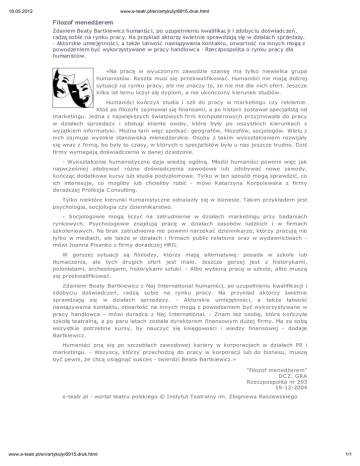 18.05.2012 www.e-teatr.pl/en/artykuly/6915,druk.html Filozof menedżerem Zdaniem Beaty Bartkiewicz humaniści, po uzupełnieniu kwalifikacji i zdobyciu doświadczeń, radzą sobie na rynku pracy. Na przykład aktorzy świetnie sprawdzają się w działach sprzedaży. - Aktorskie umiejętności, a także łatwość nawiązywania kontaktu, otwartość na innych mogą z powodzeniem być wykorzystywane w pracy handlowca - Rzeczpospolita o rynku pracy dla humanistów. «Na pracę w wyuczonym zawodzie szansę ma tylko niewielka grupa humanistów. Reszta musi się przekwalifikować. Humaniści nie mają dobrej sytuacji na rynku pracy, ale nie znaczy to, że nie ma dla nich ofert. Jeszcze kilka lat temu liczył się dyplom, a nie ukończony kierunek studiów. Humaniści kończyli studia i szli do pracy w marketingu czy reklamie. Ktoś po filozofii zajmował się finansami, a po historii zostawał specjalistą od marketingu. Jedna z największych światowych firm komputerowych przyjmowała do pracy w działach sprzedaży i obsługi klienta osoby, które były po wszystkich kierunkach z wyjątkiem informatyki. Można tam więc spotkać: geografów, filozofów, socjologów. Wielu z nich zajmuje wysokie stanowiska menedżerskie. Osoby z takim wykształceniem rozwijały się wraz z firmą, bo były to czasy, w których o specjalistów było u nas jeszcze trudno. Dziś firmy wymagają doświadczenia w danej dziedzinie. - Wykształcenie humanistyczne daje wiedzę ogólną. Młodzi humaniści powinni więc jak najwcześniej zdobywać różne doświadczenia zawodowe lub zdobywać nowe zawody, kończąc dodatkowe kursy lub studia podyplomowe. Tylko w ten sposób mogą sprawdzić, co ich interesuje, co mogliby lub chcieliby robić - mówi Katarzyna Korpolewska z firmy doradczej Profesja C onsulting. Tylko niektóre kierunki humanistyczne odnalazły się w biznesie. Takim przykładem jest psychologia, socjologia czy dziennikarstwo. - Socjologowie mogą liczyć na zatrudnienie w działach marketingu przy badaniach rynkowych. Psychologowie znajdują pracę w działach zasobów ludzkich i w firmach szkoleniowych. Na brak zatrudnienia nie powinni narzekać dziennikarze, którzy pracują nie tylko w mediach, ale także w działach i firmach public relations oraz w wydawnictwach mówi Joanna Pisanko z firmy doradczej HRIL W gorszej sytuacji są filolodzy, którzy mają alternatywę: posada w szkole lub tłumaczenia, ale tych drugich ofert jest mało. Jeszcze gorzej jest z historykami, polonistami, archeologami, historykami sztuki. - Albo wybiorą pracę w szkole, albo muszą się przekwalifikować. Zdaniem Beaty Bartkiewicz z Naj International humaniści, po uzupełnieniu kwalifikacji i zdobyciu doświadczeń, radzą sobie na rynku pracy. Na przykład aktorzy świetnie sprawdzają się w działach sprzedaży. - Aktorskie umiejętności, a także łatwość nawiązywania kontaktu, otwartość na innych mogą z powodzeniem być wykorzystywane w pracy handlowca - mówi doradca z Naj International. - Znam też osobę, która kończyła szkołę teatralną, a po paru latach została dyrektorem finansowym dużej firmy. Ma za sobą wszystkie potrzebne kursy, by nauczyć się księgowości i wiedzy finansowej - dodaje Bartkiewicz. Humaniści pną się po szczeblach zawodowej kariery w korporacjach w działach PR i marketingu. - Wszyscy, którzy przechodzą do pracy w korporacji lub do biznesu, muszą być pewni, że chcą osiągnąć sukces - twierdzi Beata Bartkiewicz.» "Filozof menedżerem" DC Z, GRA Rzeczpospolita nr 293 15-12-2004 e-teatr.pl - wortal teatru polskiego © Instytut Teatralny im. Zbigniewa Raszewskiego www.e-teatr.pl/en/artykuly/6915,druk.html 1/1