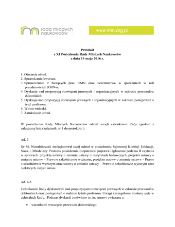Protokół z XI Posiedzenia Rady Młodych Naukowców z dnia 19 maja 2016 r. 1. Otwarcie obrad. 2. Sprawdzenie kworum. 3. Sprawozdanie z bieżących prac RMN oraz uczestnictwa w spotkaniach w roli przedstawicieli RMN-u. 4. Dyskusja nad propozycją rozwiązań prawnych i organizacyjnych w zakresie przewodów doktorskich. 5. Dyskusja nad propozycją rozwiązań prawnych i organizacyjnych w zakresie postępowań o tytuł profesora. 6. Wolne wnioski. 7. Zamknięcie obrad. W posiedzeniu Rady Młodych Naukowców udział wzięli członkowie Rady zgodnie z załączoną listą (załącznik nr 1 do protokołu ). Ad. 3 Dr M. Niezabitowski zrelacjonował swój udział w posiedzeniu Sejmowej Komisji Edukacji, Nauki i Młodzieży. Podczas posiedzenia rozpatrzono poprawki zgłoszone podczas II czytania w sprawach: projektu ustawy o zmianie ustawy o instytutach badawczych, projektu ustawy o zmianie ustawy – Prawo o szkolnictwie wyższym, projektu ustawy o zmianie ustawy – Prawo o szkolnictwie wyższym oraz ustawy o zmianie ustawy – Prawo o szkolnictwie wyższym oraz niektórych innych ustaw. Ad. 4-5 Członkowie Rady dyskutowali nad propozycjami rozwiązań prawnych w zakresie przewodów doktorskich oraz postępowań o nadanie tytułu profesora. Uwagi szczegółowe zostaną ujęte w uchwałach Rady. Podczas dyskusji omówiono m. in. sprawy związane z: warunkami wszczęcia przewodu doktorskiego; formą rozprawy doktorskiej; ramami czasowymi przygotowania rozprawy doktorskiej; otwartym dostępem do rozpraw doktorskich. Odnośnie do postępowań o nadanie tytułu profesora RMN zaproponowała poddać pod dyskusję kwestie: wprowadzenia obowiązku oceny kandydatów do tytułu profesora przez dwóch recenzentów afiliowanych w zagranicznych jednostkach naukowych; zniesienia obowiązku recenzowania w przewodzie doktorskich lub w przewodzie habilitacyjnym; braku obowiązku promocji doktorantów. Kwestie podnoszone podczas dyskusji szczegółowo zostaną uzasadnione w uchwałach. Uchwały zostaną przekazane do Ministra Nauki i Szkolnictwa Wyższego. Ponadto Rada podjęła decyzję o skierowaniu do uczelni posiadających uprawnienia akademickie wszystkich uchwał RMN w sprawie awansów naukowych z prośbą o zgłoszenie uwag bądź komentarzy. Ad. 6-7 W związku z brakiem wolnych wniosków Przewodniczący zamknął obrady. Następne spotkanie odbędzie się 16 czerwca 2016 r. Przewodniczący Rady Młodych Naukowców dr Emanuel Kulczycki