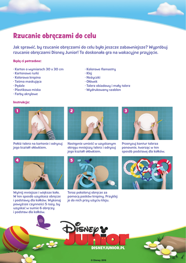 Rzucanie obręczami do celu Jak sprawić, by rzucanie obręczami do celu było jeszcze zabawniejsze? Wypróbuj rzucanie obręczami Disney Junior! To doskonała gra na wakacyjne przyjęcie. Będą ci potrzebne: · Karton o wymiarach 30 x 30 cm · Kartonowe rurki · Kolorowa krepina · Taśma maskująca · Pędzle · Plastikowa miska · Farby akrylowe · Kolorowe flamastry · Klej · Nożyczki · Ołówek · Talerz obiadowy i mały talerz · Wydrukowany szablon Instrukcja: 1 Połóż talerz na kartonie i odrysuj jego kształt ołówkiem. 4 Wytnij mniejsze i większe koło. W ten sposób uzyskasz obręcze i podstawy dla kołków. Wykonaj powyższe czynności 5 razy, by uzyskać w sumie 6 obręczy i podstaw dla kołków. 2 3 Następnie umieść w uzyskanym okręgu mniejszy talerz i odrysuj jego kształt ołówkiem. Przerysuj kontur talerza ponownie, tworząc w ten sposób podstawę dla kołków. 5 Teraz pokoloruj obręcze za pomocą pasków krepiny. Przyklej je do nich przy użyciu kleju. DISNEYJUNIOR.PL Rzucanie obręczami do celu Instrukcja (Kołki): 1 Przyklej kartonowe rurki do podstaw. Użyj w tym celu kleju i taśmy maskującej. Poczekaj, aż klej wyschnie. 2 3 Następnie pokoloruj podstawy i rurki tak, jak lubisz. Wydrukuj i wytnij symbol bohatera. Przyklej do każdego kołka po jednym logo. 4 Aby wzbogacić rywalizację, przypisz każdemu kołkowi inną liczbę punktów. Gotowe! Możesz zaprosić znajomych do zabawy! DISNEYJUNIOR.PL DISNEYJUNIOR.PL DISNEYJUNIOR.PL DISNEYJUNIOR.PL DISNEYJUNIOR.PL DISNEYJUNIOR.PL
