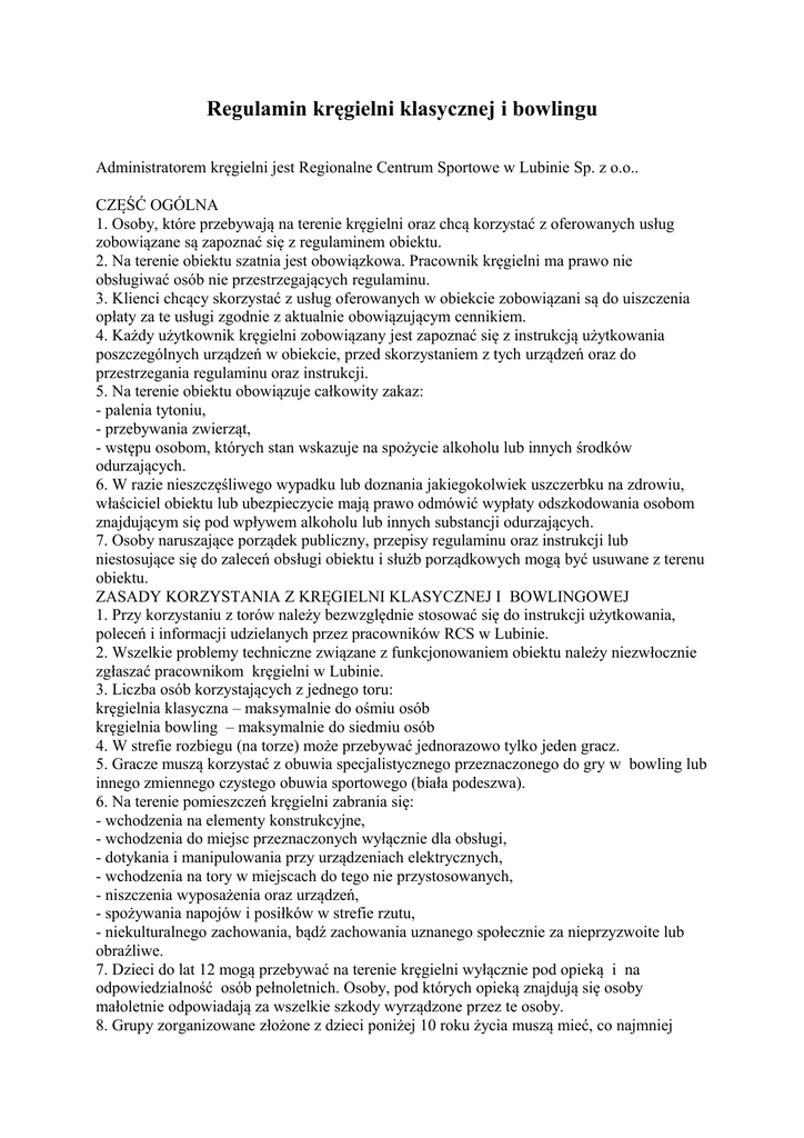 Regulamin kręgielni klasycznej i bowlingu Administratorem kręgielni jest Regionalne Centrum Sportowe w Lubinie Sp. z o.o.. CZĘŚĆ OGÓLNA 1. Osoby, które przebywają na terenie kręgielni oraz chcą korzystać z oferowanych usług zobowiązane są zapoznać się z regulaminem obiektu. 2. Na terenie obiektu szatnia jest obowiązkowa. Pracownik kręgielni ma prawo nie obsługiwać osób nie przestrzegających regulaminu. 3. Klienci chcący skorzystać z usług oferowanych w obiekcie zobowiązani są do uiszczenia opłaty za te usługi zgodnie z aktualnie obowiązującym cennikiem. 4. Każdy użytkownik kręgielni zobowiązany jest zapoznać się z instrukcją użytkowania poszczególnych urządzeń w obiekcie, przed skorzystaniem z tych urządzeń oraz do przestrzegania regulaminu oraz instrukcji. 5. Na terenie obiektu obowiązuje całkowity zakaz: - palenia tytoniu, - przebywania zwierząt, - wstępu osobom, których stan wskazuje na spożycie alkoholu lub innych środków odurzających. 6. W razie nieszczęśliwego wypadku lub doznania jakiegokolwiek uszczerbku na zdrowiu, właściciel obiektu lub ubezpieczycie mają prawo odmówić wypłaty odszkodowania osobom znajdującym się pod wpływem alkoholu lub innych substancji odurzających. 7. Osoby naruszające porządek publiczny, przepisy regulaminu oraz instrukcji lub niestosujące się do zaleceń obsługi obiektu i służb porządkowych mogą być usuwane z terenu obiektu. ZASADY KORZYSTANIA Z KRĘGIELNI KLASYCZNEJ I BOWLINGOWEJ 1. Przy korzystaniu z torów należy bezwzględnie stosować się do instrukcji użytkowania, poleceń i informacji udzielanych przez pracowników RCS w Lubinie. 2. Wszelkie problemy techniczne związane z funkcjonowaniem obiektu należy niezwłocznie zgłaszać pracownikom kręgielni w Lubinie. 3. Liczba osób korzystających z jednego toru: kręgielnia klasyczna – maksymalnie do ośmiu osób kręgielnia bowling – maksymalnie do siedmiu osób 4. W strefie rozbiegu (na torze) może przebywać jednorazowo tylko jeden gracz. 5. Gracze muszą korzystać z obuwia specjalistycznego przeznaczonego do gry w bowling lub innego zmiennego czystego obuwia sportowego (biała podeszwa). 6. Na terenie pomieszczeń kręgielni zabrania się: - wchodzenia na elementy konstrukcyjne, - wchodzenia do miejsc przeznaczonych wyłącznie dla obsługi, - dotykania i manipulowania przy urządzeniach elektrycznych, - wchodzenia na tory w miejscach do tego nie przystosowanych, - niszczenia wyposażenia oraz urządzeń, - spożywania napojów i posiłków w strefie rzutu, - niekulturalnego zachowania, bądź zachowania uznanego społecznie za nieprzyzwoite lub obraźliwe. 7. Dzieci do lat 12 mogą przebywać na terenie kręgielni wyłącznie pod opieką i na odpowiedzialność osób pełnoletnich. Osoby, pod których opieką znajdują się osoby małoletnie odpowiadają za wszelkie szkody wyrządzone przez te osoby. 8. Grupy zorganizowane złożone z dzieci poniżej 10 roku życia muszą mieć, co najmniej jednego opiekuna na 10 uczestników, odpowiedzialnego za swoich podopiecznych przez cały czas przebywania na terenie kręgielni. 9. Opiekun grupy po wejściu na teren kręgielni zobowiązany jest skontaktować się z obsługą celem ustalenia zasad korzystania z urządzeń kręgielni.
