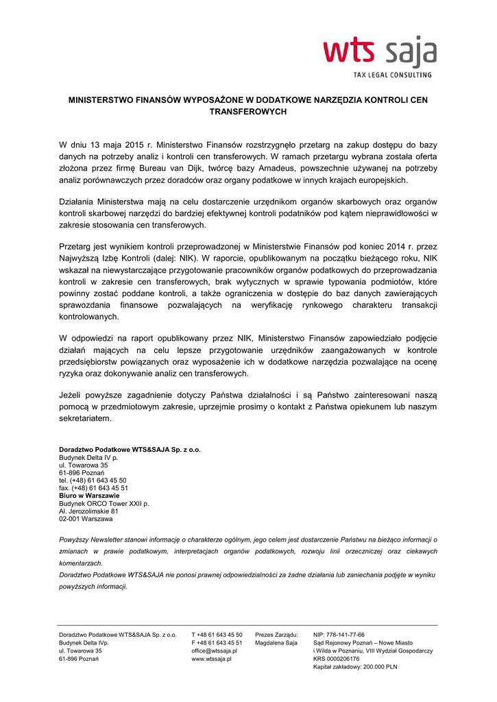 MINISTERSTWO FINANSÓW WYPOSAŻONE W DODATKOWE NARZĘDZIA KONTROLI CEN TRANSFEROWYCH W dniu 13 maja 2015 r. Ministerstwo Finansów rozstrzygnęło przetarg na zakup dostępu do bazy danych na potrzeby analiz i kontroli cen transferowych. W ramach przetargu wybrana została oferta złożona przez firmę Bureau van Dijk, twórcę bazy Amadeus, powszechnie używanej na potrzeby analiz porównawczych przez doradców oraz organy podatkowe w innych krajach europejskich. Działania Ministerstwa mają na celu dostarczenie urzędnikom organów skarbowych oraz organów kontroli skarbowej narzędzi do bardziej efektywnej kontroli podatników pod kątem nieprawidłowości w zakresie stosowania cen transferowych. Przetarg jest wynikiem kontroli przeprowadzonej w Ministerstwie Finansów pod koniec 2014 r. przez Najwyższą Izbę Kontroli (dalej: NIK). W raporcie, opublikowanym na początku bieżącego roku, NIK wskazał na niewystarczające przygotowanie pracowników organów podatkowych do przeprowadzania kontroli w zakresie cen transferowych, brak wytycznych w sprawie typowania podmiotów, które powinny zostać poddane kontroli, a także ograniczenia w dostępie do baz danych zawierających sprawozdania finansowe pozwalających na weryfikację rynkowego charakteru transakcji kontrolowanych. W odpowiedzi na raport opublikowany przez NIK, Ministerstwo Finansów zapowiedziało podjęcie działań mających na celu lepsze przygotowanie urzędników zaangażowanych w kontrole przedsiębiorstw powiązanych oraz wyposażenie ich w dodatkowe narzędzia pozwalające na ocenę ryzyka oraz dokonywanie analiz cen transferowych. Jeżeli powyższe zagadnienie dotyczy Państwa działalności i są Państwo zainteresowani naszą pomocą w przedmiotowym zakresie, uprzejmie prosimy o kontakt z Państwa opiekunem lub naszym sekretariatem. Doradztwo Podatkowe WTS&SAJA Sp. z o.o. Budynek Delta IV p. ul. Towarowa 35 61-896 Poznań tel. (+48) 61 643 45 50 fax. (+48) 61 643 45 51 Biuro w Warszawie Budynek ORCO Tower XXII p. Al. Jerozolimskie 81 02-001 Warszawa Powyższy Newsletter stanowi informację o charakterze ogólnym, jego celem jest dostarczenie Państwu na bieżąco informacji o zmianach w prawie podatkowym, interpretacjach organów podatkowych, rozwoju linii orzeczniczej oraz ciekawych komentarzach. Doradztwo Podatkowe WTS&SAJA nie ponosi prawnej odpowiedzialności za żadne działania lub zaniechania podjęte w wyniku powyższych informacji. Doradztwo Podatkowe WTS&SAJA Sp. z o.o. Budynek Delta IVp. ul. Towarowa 35 61-896 Poznań T +48 61 643 45 50 F +48 61 643 45 51 [email protected] www.wtssaja.pl Prezes Zarządu: Magdalena Saja NIP: 778-141-77-66 Sąd Rejonowy Poznań – Nowe Miasto i Wilda w Poznaniu, VIII Wydział Gospodarczy KRS 0000206176 Kapitał zakładowy: 200.000 PLN
