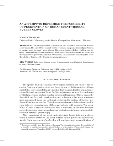 AN ATTEMPT TO DETERMINE THE POSSIBILITY OF PENETRATION OF HUMAN SCENT THROUGH RUBBER GLOVES* Miros³aw ROGOWSKI Criminalistic Laboratory of the Police Metropolitan Command, Warsaw ABSTRACT: The paper presents the methods and results of research on human scent traces. The aim of the research was to determine the possibilities of penetration of human scent through rubber gloves. The research showed that – taking into account the experimental assumptions – an individual human scent does not penetrate through rubber gloves (at least for 30 minutes) in an amount exceeding the scent threshold of dogs used for human scent experiments. KEY WORDS: Individual human scent; Human scent identification; Penetration of scent; Rubber gloves. Problems of Forensic Sciences, vol. LVII, 2004, 44–50 Received 14 November 2003; accepted 14 July 2004 INTRODUCTORY REMARKS The specific human scent sensed by dogs is probably the smell of the secretion from the apocrine gland and decay products of this secretion. A large part of this secretion is fats and other lipid substances. Rubber or plastic are generally good solvents of fat or fat-like substances, as both fats and some synthetic polymers contain similar structural fragments. This is caused by the affinity of fatty acid particles for such polymers. After scent molecules have vapourised from, e.g. cloth and settled on the surface of the polymer they diffuse into its interior. This phenomenon lasts until there is an equilibrium between concentrations of these particles in both sorbents. The possibility of such a transfer increases with a decrease in distance between sorbents, increase in duration of mutual contact, rise in temperature and decrease in external pressure [3]. After vaporising of the scent molecules from hands into worn gloves, these molecules settle on the inner surface of the gloves and diffuse outwards. Such movement of molecules will continue until an equilibrium of * The article partially uses the content of the paper “An attempt to determine the possibility of a transfer of scent through rubber gloves” delivered by the author of this article during the scientific workshop “Osmology 2002” – Janów Lubelski, 10–14 June, 2002. An attempt to determine the possibility ... 45 concentrations of these molecules on the surface of hands and gloves is reached. If the scent penetrates through the rubber gloves, the amount of scent molecules should be the same on the surface of the hand as on the outer surface of the glove. Touching an object with a hand clad in a rubber glove should result in the transfer of the individual scent onto this object. By securing a scent trace from the object, it would thus be possible to identify the person who had touched it. The experiment was carried out with the aim of determining the possibility of penetration of an individual scent through rubber gloves. MATERIAL AND METHODS USED IN THE EXPERIMENT The experiment was carried out at the laboratory of olfactory traces of the Department of Forensic Techniques at the Police Training Centre in Legionowo. In the experiment, four police dogs were used. The dogs were certified in the identification of human olfactory traces. The material for the experiment was prepared in a lecture hall. It was collected on 28th October, 1999, from trainees of the forensic techniques course. Person A put on a pair of brand new rubber gloves. After 5 minutes he picked up a plastic ballpoint pen and held it for 5 minutes. The same action was repeated by persons B and C, except that they held the ballpoint pen for 10 and 15 minutes respectively. These persons sat with their elbows propped on desks, thus precluding contact between the (gloved) hands and the rest of the body. After 1–2 minutes, olfactory traces were taken from the ballpoint pens. The duration of the collection was 40 minutes. On the same day, comparative material was collected from the above mentioned persons’ hands (collection duration was 15 minutes). Human scent examinations were carried out in accordance with standard procedures [1]. In order to build a selection sequence, complementary material was used, similar to the comparative material, i.e. collected by means of the same method, from persons of the same sex and at the same time. The control material, thus, fulfilled the same requirements as the complementary material. It had also been tested from the point of view of attractiveness to the dogs used in the experiment. First, three control tests were carried out with each dog. After having checked that the dogs were disposed towards carrying out olfactory work, and there were no attractive materials in the selection sequence, human scent identification was carried out. In the selection sequence, one comparative material was placed among four complementary ones. In control tests, a dog received control material to sniff at the beginning of the test, and during the human scent identification – olfactory traces secured from the ballpoint pens. 46 M. Rogowski For the purposes of the experiment, material secured from the plastic ballpoint pen held in the rubber-gloved hand of person A was marked MDa, of person B – MDb, and of person C – MDc. Dog handlers were not aware of the construction of the selection sequence. If there was no positive human scent identification in the course of the experiment, a fourth control test was carried out at the end. This confirmed that the dogs used in the experiment were disposed towards olfactory work. DISCUSSION OF RESULTS The obtained results were presented in Table I. Altogether, 18 identification tests were carried out concerning olfactory traces secured from plastic ballpoint pens held in rubber-gloved hands, compared to comparative material taken from these people. No indications were given by dogs, in spite of the fact that in each identification sample there was a theoretical olfactory match. For two dogs, the scent of person B turned out to be attractive. This
