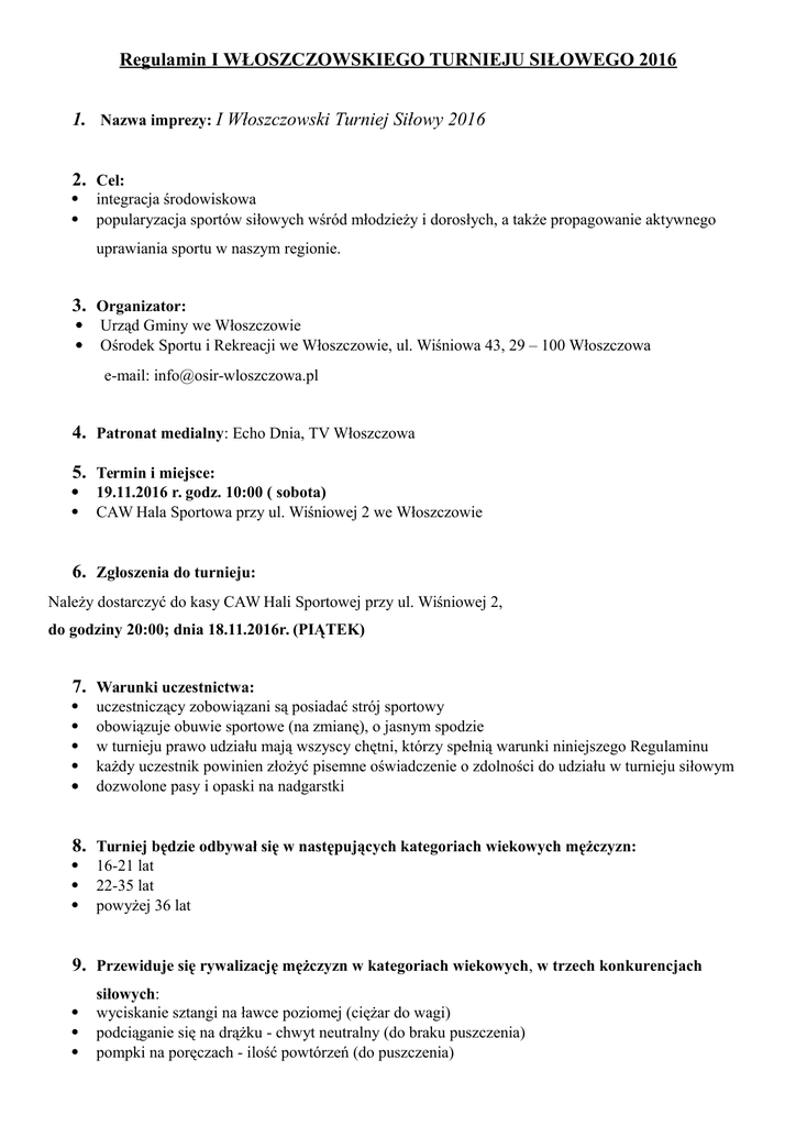 Regulamin I WŁOSZCZOWSKIEGO TURNIEJU SIŁOWEGO 2016 1. Nazwa imprezy: I Włoszczowski Turniej Siłowy 2016 2. Cel: integracja środowiskowa popularyzacja sportów siłowych wśród młodzieży i dorosłych, a także propagowanie aktywnego uprawiania sportu w naszym regionie. 3. Organizator: Urząd Gminy we Włoszczowie Ośrodek Sportu i Rekreacji we Włoszczowie, ul. Wiśniowa 43, 29 – 100 Włoszczowa e-mail: [email protected] 4. Patronat medialny: Echo Dnia, TV Włoszczowa 5. Termin i miejsce: 19.11.2016 r. godz. 10:00 ( sobota) CAW Hala Sportowa przy ul. Wiśniowej 2 we Włoszczowie 6. Zgłoszenia do turnieju: Należy dostarczyć do kasy CAW Hali Sportowej przy ul. Wiśniowej 2, do godziny 20:00; dnia 18.11.2016r. (PIĄTEK) 7. Warunki uczestnictwa: uczestniczący zobowiązani są posiadać strój sportowy obowiązuje obuwie sportowe (na zmianę), o jasnym spodzie w turnieju prawo udziału mają wszyscy chętni, którzy spełnią warunki niniejszego Regulaminu każdy uczestnik powinien złożyć pisemne oświadczenie o zdolności do udziału w turnieju siłowym dozwolone pasy i opaski na nadgarstki 8. Turniej będzie odbywał się w następujących kategoriach wiekowych mężczyzn: 16-21 lat 22-35 lat powyżej 36 lat 9. Przewiduje się rywalizację mężczyzn w kategoriach wiekowych, w trzech konkurencjach siłowych: wyciskanie sztangi na ławce poziomej (ciężar do wagi) podciąganie się na drążku - chwyt neutralny (do braku puszczenia) pompki na poręczach - ilość powtórzeń (do puszczenia) 10. Przewiduje się rywalizację kobiet w kategorii open. Konkurencje dla kobiet: wyciskanie na suwnicy (maszynie nożnej) stałego ciężaru 20 kg (w czasie 1 minuty) brzuszki na maszynie (w czasie 1 minuty) wyciskanie gryfu sztangi na ławeczce poziomej (liczy się ilość powtórzeń). Ciężar 20 kg Wyciskanie na suwnicy: Opuszczamy ciężar do 90, nie odrywamy stóp od podestu maszyny, następnie wyciskamy ciężar w górę. Stały ciężar 20 kg. Brzuszki na maszynie: Ugięte kolana podciągamy do brzucha, następnie opuszczamy do maksymalnego wyprostu kolan. Czynność powtarzamy w czasie 1 minuty. Wyciskanie gryfu sztangi: Zawodniczki wyciskają gryf sztangi od klatki piersiowej, do momentu wyprostowania przedramion w łokciach. Ruch powinien być równy – płynny. Stóp ani pleców nie wolno odrywać od podłoża. UWAGA!!! Osoby niepełnoletnie, zobowiązane są do przedstawienia pisemnego oświadczenia zawierającego zgodę na udział w w/w zawodach, podpisaną przez rodzica lub prawnego opiekuna. (Załącznik Nr 2) 11. Zasady rozgrywania turnieju: Przed konkurencją wyciskania sztangi - ciężar do w/w konkurencji będzie dobierany po ważeniu zawodnika (z dokładnością do 0,5 kg np. zawodnik ważący 90,5 kg będzie miał zaliczone 90,0 kg, a zawodnik ważący 90,7 kg będzie miał zaliczone 91,0 kg). Pierwsza konkurencja - wyciskanie sztangi na ławeczce płaskiej – Zawodnik podnosząc ciężar nie może odbijać sztangi od klatki, ruch powinien być w pełnym zakresie, czyli z wyprostowanych rąk sztangę opuszczamy do klatki, przytrzymujemy 1 sekundę i wyciskamy do góry do wyprostowania rąk, zatrzymujemy 1 sekundę. Stóp i pleców nie wolno odrywać od podłoża. Druga konkurencja - podciąganie na drążku w neutralnym uchwycie do brody – Zawodnik podnosi się na drążku do brody, przytrzymuje 1 sekundę, a następnie opuszcza do pełnego wyprostowania rąk (do puszczenia). Trzecia konkurencja – pompki na poręczach – Zawodnik podnosi na poręczach ciężar równy masie swojego ciała, uginając i wyprostowując ramiona w łokciach (do puszczenia). Za każde poprawnie wykonane powtórzenie zawodnik otrzyma jeden punkt. Wygrywa zawodnik, który w trzech konkurencjach zdobędzie największą liczbę punktów. KAŻDY UCZESTNIK BĘDZIE MIAŁ TYLKO TRZY PRÓBY PODEJŚCIA DO OKREŚLONEGO ZADANIA. 12. Zasady finansowania: Opłata startowa: osoby posiadające aktualne karnety miesięczne lub 3 miesięczne siłowni CAW OSiR zwolnione są z opłaty startowej. Warunkiem jest okazanie karnetu organizatorom przed turniejem. 18,00 zł od osób, nieposiadających aktualnych karnetów. Startujący dokonują wpłaty startowej do dnia 18.11.2016r. do godziny 20:00 (PIĄTEK) w kasie CAW Hali Sportowej przy ul. Wiśniowej 2. 13. Nagrody: Puchary, Medale, Nagrody rzeczowe, Dyplomy. 14. Postanowienia końcowe: Uczestnicy imprezy mają obowiązek ubezpieczenia się na własny koszt. Organizator nie ponosi odpowiedzialności z tytułu zaistnienia nieszczęśliwych wypadków. Uczestnicy zobowiązują się złożyć pisemne oświadczenie o zdolności do udziału w zawodach. (Załącznik Nr 1) W czasie Turnieju organizator zapewnia opiekę medyczną. * W oświadczeniu uczestnicy wyrażają również zgodę na publikację ich wyników i wizerunku (np. imienna tabela wyników, publikację zdjęć w prasie i na stronach internetowych itp.) zgodnie z ustawą o ochronie danych osobowych z dnia 29 sierpnia 1997r (Dz.U. 2014.1182) * Uczestnicy podczas rejestracji podpisują oświadczenie o braku przeciwwskazań zdrowotnych do udziału w I Włoszczowskim Turnieju Siłowym 2016 i własnej odpowiedzialności za wszelkie konsekwencje zdrowotne związane z udziałem w tym Turnieju. Wskazane jest wcześniejsze wykonania badań lekarskich; W sprawach organizacyjnych można kontaktować się bezpośrednio: Agnieszka Soboń-Koćwin - Kierownik Punktów Sprzedaży 785 465 957 Karol Drozdowski – Instruktor siłowni 663 240 775