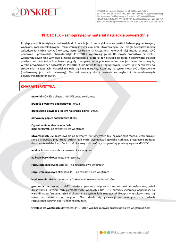 PHOTOTEX – samoprzylepny materiał na gładkie powierzchnie Przylepny nośnik tekstylny z możliwością drukowania jest kompatybilny ze wszystkimi farbami pigmentowymi, wodnymi, rozpuszczalnikowymi, rozpuszczalnikowymi eko oraz utwardzalnymi UV! Dzięki teksturowanemu wykończeniu można uzyskać wyraźny, ostry wydruk o fantastycznych kolorach! Klej można usunąć, użyć ponownie i przemieścić. Charakterystyki PHOTOTEX wyróżniają go na tle innych produktów na rynku, wykorzystujących folię winylową o niskiej przyczepności. Materiał ten przylega do każdej nieporowatej płaskiej powierzchni (przy każdych zmianach pogody i temperatury w pomieszczeniu) oraz jest łatwa do usunięcia, w 99% przypadków bez pozostałości. PHOTOTEX nie zrywa farby z zagruntowanej ściany i jest bezpieczny do stosowania na tapetach. Materiał nie rwie się i nie marszczy. Rezultaty na tynku mogą być zróżnicowane (preferowany jest tynk malowany). Nie jest zalecany do stosowania na cegłach i niepomalowanych powierzchniach betonowych. CHARAKTERYSTYKA materiał: 40-45% poliester, 40-45% pulpa celulozowa grubość z warstwą podkładową: 0.012 drukowalna powłoka z klejem na stronie dolnej: 0.006 odrywalny papier podkładowy: 0.006 Ograniczenie w stosowaniu farb: pigmentowych: na zewnątrz i we wnętrzach utwardzanych UV: zastosowanie na zewnątrz i we wnętrzach (nie nasycać zbyt mocno, jeżeli drukuje się do krawędzi, przy druku dużych apli może występować zjawisko curlingu, przegrzanie podczas o druku może osłabić klej). Podczas druku wszystkie nastawy temperatury powinny wynosić 40-50 C. wodnych: zastosowanie na zewnątrz i we wnętrzach na bazie barwników: mieszane rezultaty rozpuszczalnikowych: seria (S) – na zewnątrz i we wnętrzach rozpuszczalnikowych eko: seria (S) – na zewnątrz i we wnętrzach laminowanie: skuteczne może być także laminowanie na zimno 1-3m gwarancja na zewnątrz: 6-12 miesięcy gwarancji odporności na warunki atmosferyczne, jeżeli drukowany z użyciem farb pigmentowych, wodnych i UV, 6-12 miesięcy gwarancji odporności na warunki atmosferyczne, jeżeli drukowany z użyciem farb rozpuszczalnikowych – rezultaty mogą się różnić w zależności od regionu. Nie udziela się gwarancji na zewnątrz przy farbach rozpuszczalnikowych eko – zmienne rezultaty. trwałość we wnętrzach: dotychczas PHOTOTEX wisi bez żadnych oznak zużycia we wnętrzu od 5 lat ZASTOSOWANIE Kompatybilny z farbami pigmentowymi, wodnymi, rozpuszczalnikowymi, rozpuszczalnikowymi eko i utwardzanymi UV. W celu uzyskania najlepszych rezultatów nastawy farby muszą być zoptymalizowane w zależności od wytycznych dla farby, maszyny i oprogramowania oraz RIP i profilu. Odpowiedni dla większości wielkoformatowych drukarek termicznych i atramentowych. Temperatura o 40-50 C. Odpowiednia do sztancowania/precyzyjnego wycinania formatów (używać noża karbidowego pod o kątem 60 ) i powłokę ochronną w płynie lub aerozolu. KOMPATYBILNOŚĆ I INNE Odnosiliśmy sukcesy na wszystkich formatach drukarek atramentowych i uzyskiwaliśmy dobre rezultaty na wielkoformatowych maszynach płaskich. Jedynym problemem są farby barwnikowe. Nadaje się w formie arkuszy do maszyn offsetowych (litograficznych). Nadaje się do maszyn DI (indigo, Nexpress, Igen). W celu zapobiegania zarysowaniu zalecamy po druku płynną powłokę LIQUID. Według naszej interpretacji, testów i badań materiał jest bezpieczny dla środowiska i biodegradowalny. Materiał Photo-Tex i jego klej nie zawiera szkodliwych ftalanów.