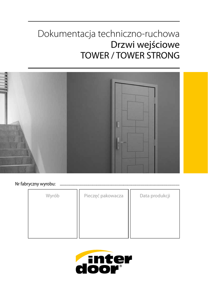 Dokumentacja techniczno-ruchowa Drzwi wejściowe TOWER / TOWER STRONG Nr fabryczny wyrobu: ....................................................................................................................... Wyrób Pieczęć pakowacza Data produkcji DTR DRZWI TOWER / TOWER STRONG DTR DRZWI TOWER / TOWER STRONG Spis treści 1. 2. 3. 4. 5. 6. 7. 8. 9. 10. 2 Niniejsza Dokumentacja Techniczno-Ruchowa została opracowana na podstawie wymagań Aprobaty Technicznej ITB AT-15-6998/2012 Informacje ogólne......................................................................................................................... Oznaczenie wyrobu..................................................................................................................... Wyposażenie standardowe..................................................................................................... Transport i przechowywanie.................................................................................................. Przepisy BHP...................................................................................................................................... Instrukcja montażu drzwi......................................................................................................... 6.1. Montaż drzwi na ościeżnicy MDF stałej lub regulowanej...................... 6.2. Montaż drzwi na ościeżnicy metalowej kątowej......................................... 6.3. Montaż drzwi na ościeżnicy metalowej regulowanej.............................. 6.4. Montaż progu stalowego........................................................................................... 6.5. Montaż progu drewnianego.................................................................................... Użytkowanie i konserwacja..................................................................................................... Przeglądy okresowe..................................................................................................................... Warunki gwarancji......................................................................................................................... 9.1. Okres gwarancji................................................................................................................ 9.2. Jak uzyskać serwis gwarancyjny............................................................................ 9.3. Czego gwarancja nie obejmuje.............................................................................. 9.4. Ograniczenia odpowiedzialności Gwaranta................................................... Karta gwarancyjna........................................................................................................................ Niniejsza Dokumentacja Techniczno-Ruchowa została opracowana na podstawie wymagań Aprobaty Technicznej ITB AT-15-6998/2012 4 4 4 4 4 5 5 6 7 8 8 9 9 10 10 10 10 10 11 3 DTR DRZWI TOWER / TOWER STRONG 1. DTR DRZWI TOWER / TOWER STRONG 6. Informacje ogólne Drzwi wejściowe wewnętrzne TOWER / TOWER STRONG charakteryzują się klasą RC 2 odporności na włamanie wg PN–EN 1627:2012 i izolacyjnością akustyczną Rw = 39 dB (klasa izolacyjności akustycznej 37 dB). Drzwi przeznaczone są do stosowania w budownictwie jako zamknięcie otworów w ścianach wewnętrznych pomiędzy klatką schodową lub korytarzem a pomieszczeniem mieszkalnym lub użyteczności publicznej. Drzwi występują w wersji jednoskrzydłowej przylgowej na ościeżnicy MDF STAŁEJ na grubość muru lub regulowanej z opaską od strony przeciwzawiasowej, ościeżnicy metalowej kątowej bądź regulowanej. Drzwi TOWER wyposażone w dwa zamki trzpieniowe oraz bolce antywyważeniowe posiadają 12 punktów mocowania skrzydła w ościeżnicy, natomiast drzwi TOWER STRONG wyposażone w zamek listwowy trzpieniowy klasy C oraz bolce antywyważeniowe posiadają 17 punktów mocowania skrzydła w ościeżnicy. 6.1. Montaż drzwi na ościeżnicy MDF stałej lub regulowanej 39 dB 12 ontaż drzwi należy wykonać w pomieszczeniach z kompletnie wykończonymi podłogami i ścianami (malowanie, M tapetowanie, kafelkowanie itp. musi być zakończone). Wykończenie powinno być doprowadzone do krawędzi otworu w murze. Przed rozpoczęciem prac montażowych należy sprawdzić wyrób pod względem zgodności z zamówieniem, ilości i jakości. Etap 1. Przygotowanie otworu Klasa 2 Instrukcja montażu drzwi a) dostosowanie otworu do wymiarów (wymagane wymiary minimalne): STANDARD INWESTYCYJNY (pianka) 17 TOWER TOWER TOWER TOWER STRONG TOWER STRONG TOWER STRONG Drzwi produkowane są zgodnie z wymaganiami Aprobaty Technicznej ITB AT-15-6998/2012 Krajowa deklaracja zgodności nr KDZ 8/2013 z dnia 31.01.2013 r. 2. Oznaczenie wyrobu Każde drzwi posiadają tabliczkę znamionową, zawierającą następujące dane: • Nazwa producenta, • Klasa odporności na włamanie, • Numer Aprobaty Technicznej, • Rok produkcji, • Nr fabryczny. 3. Wyposażenie standardowe • Skrzydło przylgowe z blachą w konstrukcji, • Dwa zamki trzpieniowe na wkładkę patentową (TOWER), • Zamek listwowy trzpieniowy klasy C (TOWER STRONG), • Okucia bezpieczne klasy 2 (TOWER) lub klasy 3 (TOWER STRONG): szyld dolny z klamką i rozeta górna, • Dwie wkładki antywłamaniowe klasy B (TOWER) lub klasy C (TOWER STRONG), • Bolce antywyważeniowe, • Uszczelka w skrzydle i ościeżnicy, • Trzy zawiasy czopowe, •Wizjer, • Próg drewniany, • Ościeżnica metalowa lub MDF. 4. Transport i przechowywanie Transport samego skrzydła lub ościeżnicy metalowej musi odbywać się w pozycji pionowej, ustawiając je na dolnej krawędzi. Ościeżnice z materiałów drewnopochodnych, pakowane osobno w nie zmontowanych elementach zaleca się przewozić w pozycji poziomej. Jeżeli drzwi nie są montowane bezpośrednio po zakupie, przy magazynowaniu lub przechowywaniu należy przestrzegać następujących zasad: 5. a) Drzwi przechowu
