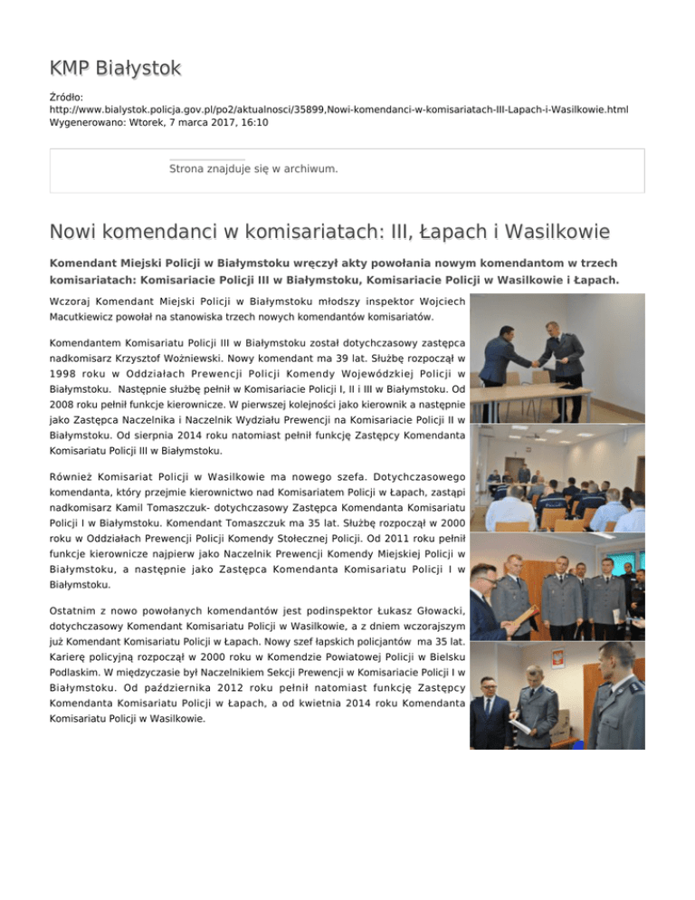 KMP Białystok Źródło: http://www.bialystok.policja.gov.pl/po2/aktualnosci/35899,Nowi-komendanci-w-komisariatach-III-Lapach-i-Wasilkowie.html Wygenerowano: Wtorek, 7 marca 2017, 16:10 Strona znajduje się w archiwum. Nowi komendanci w komisariatach: III, Łapach i Wasilkowie Komendant Miejski Policji w Białymstoku wręczył akty powołania nowym komendantom w trzech komisariatach: Komisariacie Policji III w Białymstoku, Komisariacie Policji w Wasilkowie i Łapach. Wczoraj Komendant Miejski Policji w Białymstoku młodszy inspektor Wojciech Macutkiewicz powołał na stanowiska trzech nowych komendantów komisariatów. Komendantem Komisariatu Policji III w Białymstoku został dotychczasowy zastępca nadkomisarz Krzysztof Wożniewski. Nowy komendant ma 39 lat. Służbę rozpoczął w 1998 roku w Oddziałach Prewencji Policji Komendy Wojewódzkiej Policji w Białymstoku. Następnie służbę pełnił w Komisariacie Policji I, II i III w Białymstoku. Od 2008 roku pełnił funkcje kierownicze. W pierwszej kolejności jako kierownik a następnie jako Zastępca Naczelnika i Naczelnik Wydziału Prewencji na Komisariacie Policji II w Białymstoku. Od sierpnia 2014 roku natomiast pełnił funkcję Zastępcy Komendanta Komisariatu Policji III w Białymstoku. Również Komisariat Policji w Wasilkowie ma nowego szefa. Dotychczasowego komendanta, który przejmie kierownictwo nad Komisariatem Policji w Łapach, zastąpi nadkomisarz Kamil Tomaszczuk- dotychczasowy Zastępca Komendanta Komisariatu Policji I w Białymstoku. Komendant Tomaszczuk ma 35 lat. Służbę rozpoczął w 2000 roku w Oddziałach Prewencji Policji Komendy Stołecznej Policji. Od 2011 roku pełnił funkcje kierownicze najpierw jako Naczelnik Prewencji Komendy Miejskiej Policji w Białymstoku, a następnie jako Zastępca Komendanta Komisariatu Policji I w Białymstoku. Ostatnim z nowo powołanych komendantów jest podinspektor Łukasz Głowacki, dotychczasowy Komendant Komisariatu Policji w Wasilkowie, a z dniem wczorajszym już Komendant Komisariatu Policji w Łapach. Nowy szef łapskich policjantów ma 35 lat. Karierę policyjną rozpoczął w 2000 roku w Komendzie Powiatowej Policji w Bielsku Podlaskim. W międzyczasie był Naczelnikiem Sekcji Prewencji w Komisariacie Policji I w Białymstoku. Od października 2012 roku pełnił natomiast funkcję Zastępcy Komendanta Komisariatu Policji w Łapach, a od kwietnia 2014 roku Komendanta Komisariatu Policji w Wasilkowie. Ocena: 0/5 (0) Tweetnij