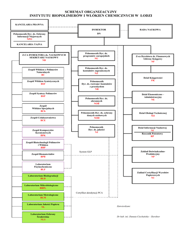 SCHEMAT ORGANIZACYJNY INSTYTUTU BIOPOLIMERÓW I WŁÓKIEN CHEMICZNYCH W ŁODZI KANCELARIA PRAWNA DYREKTOR Pełnomocnik Dyr. ds. Ochrony Informacji Niejawnych NPO RADA NAUKOWA DN KANCELARIA TAJNA Z-CA DYREKTORA ds. NAUKOWYCH SEKRETARZ NAUKOWY NB Zespół Włókien z Polimerów Naturalnych BC Zespół Włókien Syntetycznych BSF Zespół Syntezy Polimerów BSP Zespół Włókien Specjalnych BCh Zespół Celulozownictwa BCE Zespół Kompozytów Keratynowych BPK Pełnomocnik Dyr. ds. programów europejskich NU Z-ca Dyrektora ds. Finansowych Główny Księgowy NF Pełnomocnik Dyr. ds. kontaktów zagranicznych NZ Dział Księgowości FK Pełnomocnik Dyr. ds. rozwoju i kontaktów z przemysłem NR Dział Ekonomiczno – Administracyjny NE Pełnomocnik Dyr. ds. obronnych NOB Pełnomocnik Dyr. ds. ochrony danych osobowych NOD Dział Obsługi Technicznej NO Pełnomocnik Dyr. ds. jakości NJ Dział Informacji Naukowej NI Rzecznik Patentowy RP Zespół Biotechnologii Polimerów i Włókien BBP Zespół Biomateriałów BPB Zakład DoświadczalnoProdukcyjny NP System GLP Laboratorium Fizykochemiczne BLF Zakład Certyfikacji Wyrobów Papierowych NC Laboratorium Biodegradacji BLD Laboratorium Mikrobiologiczne BBPL Certyfikat akredytacji PCA Laboratorium Metrologiczne BLM Laboratorium Jakości Papieru NL Laboratorium Ochrony Środowiska NLS Zatwierdzam: Dr hab. inż. Danuta Ciechańska – Dyrektor
