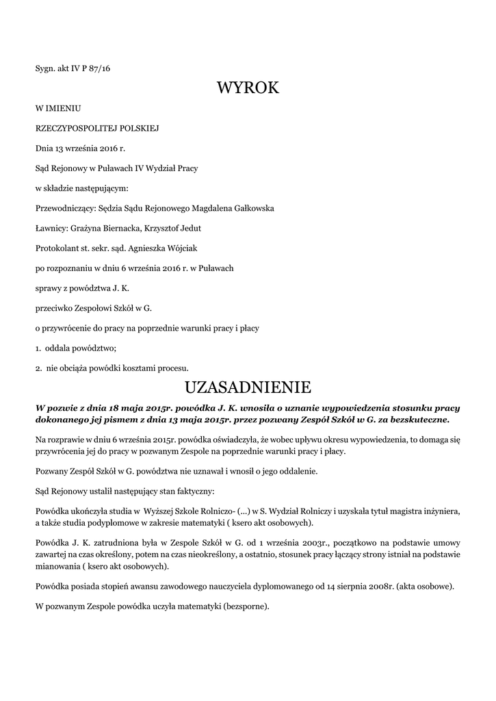 Sygn. akt IV P 87/16 WYROK W IMIENIU RZECZYPOSPOLITEJ POLSKIEJ Dnia 13 września 2016 r. Sąd Rejonowy w Puławach IV Wydział Pracy w składzie następującym: Przewodniczący: Sędzia Sądu Rejonowego Magdalena Gałkowska Ławnicy: Grażyna Biernacka, Krzysztof Jedut Protokolant st. sekr. sąd. Agnieszka Wójciak po rozpoznaniu w dniu 6 września 2016 r. w Puławach sprawy z powództwa J. K. przeciwko Zespołowi Szkół w G. o przywrócenie do pracy na poprzednie warunki pracy i płacy 1. oddala powództwo; 2. nie obciąża powódki kosztami procesu. UZASADNIENIE W pozwie z dnia 18 maja 2015r. powódka J. K. wnosiła o uznanie wypowiedzenia stosunku pracy dokonanego jej pismem z dnia 13 maja 2015r. przez pozwany Zespół Szkół w G. za bezskuteczne. Na rozprawie w dniu 6 września 2015r. powódka oświadczyła, że wobec upływu okresu wypowiedzenia, to domaga się przywrócenia jej do pracy w pozwanym Zespole na poprzednie warunki pracy i płacy. Pozwany Zespół Szkół w G. powództwa nie uznawał i wnosił o jego oddalenie. Sąd Rejonowy ustalił następujący stan faktyczny: Powódka ukończyła studia w Wyższej Szkole Rolniczo- (...) w S. Wydział Rolniczy i uzyskała tytuł magistra inżyniera, a także studia podyplomowe w zakresie matematyki ( ksero akt osobowych). Powódka J. K. zatrudniona była w Zespole Szkół w G. od 1 września 2003r., początkowo na podstawie umowy zawartej na czas określony, potem na czas nieokreślony, a ostatnio, stosunek pracy łączący strony istniał na podstawie mianowania ( ksero akt osobowych). Powódka posiada stopień awansu zawodowego nauczyciela dyplomowanego od 14 sierpnia 2008r. (akta osobowe). W pozwanym Zespole powódka uczyła matematyki (bezsporne). W pozwanym Zespole, oprócz powódki, matematyki uczy też, zatrudniona od 10 listopada 2003r. M. S., która ukończyła studia magisterskie w zakresie matematyki i wobec posiadanych kwalifikacji, uczy w pozwanym Zespole także fizyki z astronomią oraz wykonywała obowiązki wychowawcy świetlicy (zeznania dyrektora pozwanego P. K. słuchanego w trybie art. 299 kpc - k.34, wykaz kadry pedagogicznej - k.18-18v). M. S. posiada stopień awansu zawodowego nauczyciel mianowany, a jej stosunek pracy istnieje na podstawie mianowania ( zeznania dyrektora pozwanego P. K. słuchanego w trybie art. 299 kpc, wykaz kadry pedagogicznej). W roku szkolnym 2013/2014 powódka miała przydzielone nauczanie matematyki - 12/18 w szkole podstawowej i 6/18 gimnazjum, ale w tym roku szkolnym powódka przebywała nieprzerwanie na zwolnieniach lekarskich w związku z ciążą, potem korzystała z urlopu macierzyńskiego, dodatkowego urlopu macierzyńskiego i rodzicielskiego, uzupełniającego urlopu wypoczynkowego - aż do dnia 16 czerwca 2015r. ( ksero akt osobowych). O dnia 1 września 2015r. dyrektor pozwanego Zespołu przydzielił powódce 13 godzin matematyki, 1 godzinę wychowawczą i 6 godzin w świetlicy, a powódka w piśmie z dnia 19 października 2015r. zwróciła się do dyrektora pozwanego Zespołu o przywrócenie jej zatrudnienia na stanowisku nauczyciela matematyki w wymiarze 18/18, bo jest ona zatrudniona przez mianowanie jako nauczyciel matematyki, a nie matematyki i wychowania świetlicowego (k.28). W roku szkolnym 2015/2016 , wobec tego, że M. S. przebywała na urlopie macierzyńskim i rodzicielskim, to oprócz powódki, matematyki nauczała M. S. (3) na podstawie umowy o pracę na zastępstwo ( zawartej w roku szkolnym 2013/2014, gdy to powódka przebywała na urlopach macierzyńskim i rodzicielskim). Dyrektor pozwanego Zespołu przedstawił organowi prowadzącemu projekt arkusza organizacji roku szkolnego 2016/2017 i dnia 10 maja 2016r. Wójt Gminy K. zatwierdził projekt organizacji roku szkolnego ( k.17). W arkuszu tym dyrektor pozwanego przewidział dla powódki nauczanie matematyki w wymiarze 12 godzin i 1 godzinę wychowawczą ( k.17). W arkuszu tym dyrektor przewidział od 1 września 2016r. dla M. S. 12/18 godzin dydaktycznych matematyki, 4/18 godzin dydaktycznych fizyki, 4/26 godzin obowiązków wychowawcy świetlicy (zeznania dyrektora pozwanego P. K. słuchanego w trybie art. 299 kpc). W roku szkolnym 2016/2017 w świetlicy przewidziano 13 godzin i 9 godzin zostało przydzielonych M. D., nauczycielowi o stopniu awansu zawodowego nauczyciel dyplomowany, ze stażem pedagogicznym 25 lat, której stosunek pracy istnieje na podstawie mianowania, nauczającemu w roku szkolnym 2016/2017 informatyki w wymiarze 2 godzin, zajęć komputerowych w wymiarze 4 godzin, techniki w wymiarze 5 godzin, godzinę wychowawczą ( zeznania dyrektora pozwanego P. K. słuchanego w trybie art. 299 kpc, wykaz kadry pedagogicznej, arkusz organizacji roku szkolnego). Liczba oddziałów w pozwanym Zespole w roku szkolnym 2016/2017 nie zmniejszyła się w stosunku do poprzedniego roku szkolnym, ale w roku szkolnym 2015/1016 w pozwanym Zespole były realizowane 26,5 godziny matematyki, a w roku szkolnym 2016/2017 tych godzin jest 24, jako że w poprzednim roku szkolnym te dodatkowe 2,5 godziny istniały w szkole z racji tego, iż dyrektor pozwanego, w ramach godzin wolnych do dyspozycji dyrektora, przeznaczył te godziny min. na matematykę, a w roku szkolnym 2016/2017, te wolne godziny przeznaczył nie na nauczanie matematyki, jak było w poprzednim roku szkolnym, tylko na zajęcia dydaktyczne z historii i społeczeństwa w klasie V szkoły podstawowej- 1 godzina, zajęcia z muzyki w klasie VI szkoły podstawowej- 0,5 godziny, zajęcia z plastyki w klasie VI szkoły podstawowej -0,5 godziny, zajęcia z języka rosyjskiego w klasie I gimnazjum- 1 godzina i zajęcia z języka polskiego w klasie III gimnazjum- 1 godzina (zeznania dyrektora pozwanego P. K. słuchanego w trybie art. 299 kpc). W dniu 13 maja 2015r. dyrektor pozwanego P. K. zapoznał powódkę z treścią pisma – propozycja ograniczenia zatrudnienia, proponując powódce od dnia 1 września 2016r. do czasu ustania przyczyn ograniczenie do 0,72 eta