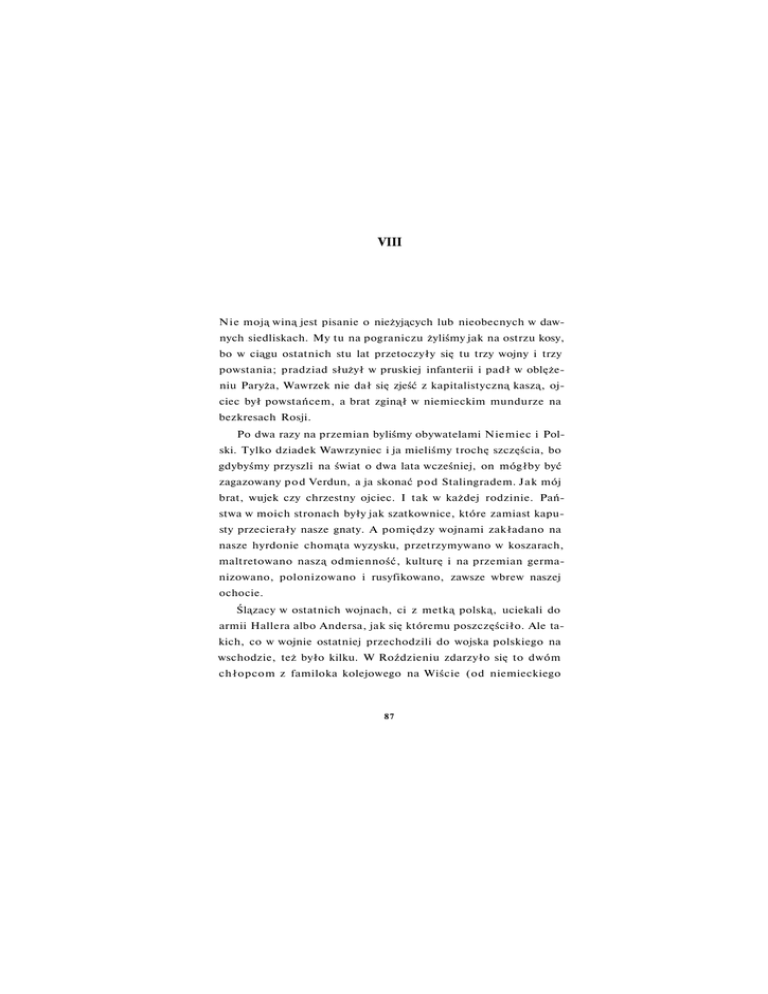VIII Nie moją winą jest pisanie o nieżyjących lub nieobecnych w daw nych siedliskach. My tu na pograniczu żyliśmy jak na ostrzu kosy, bo w ciągu ostatnich stu lat przetoczyły się tu trzy wojny i trzy powstania; pradziad służył w pruskiej infanterii i padł w oblęże niu Paryża, Wawrzek nie dał się zjeść z kapitalistyczną kaszą, oj ciec był powstańcem, a brat zginął w niemieckim mundurze na bezkresach Rosji. Po dwa razy na przemian byliśmy obywatelami Niemiec i Pol ski. Tylko dziadek Wawrzyniec i ja mieliśmy trochę szczęścia, bo gdybyśmy przyszli na świat o dwa lata wcześniej, on mógłby być zagazowany p o d Verdun, a ja skonać p o d Stalingradem. Jak mój brat, wujek czy chrzestny ojciec. I tak w każdej rodzinie. Pań stwa w moich stronach były jak szatkownice, które zamiast kapu sty przecierały nasze gnaty. A pomiędzy wojnami zakładano na nasze hyrdonie chomąta wyzysku, przetrzymywano w koszarach, maltretowano naszą odmienność, kulturę i na przemian germanizowano, polonizowano i rusyfikowano, zawsze wbrew naszej ochocie. Ślązacy w ostatnich wojnach, ci z metką polską, uciekali do armii Hallera albo Andersa, jak się któremu poszczęściło. Ale ta kich, co w wojnie ostatniej przechodzili do wojska polskiego na wschodzie, też było kilku. W Roździeniu zdarzyło się to dwóm chłopcom z familoka kolejowego na Wiście (od niemieckiego 87