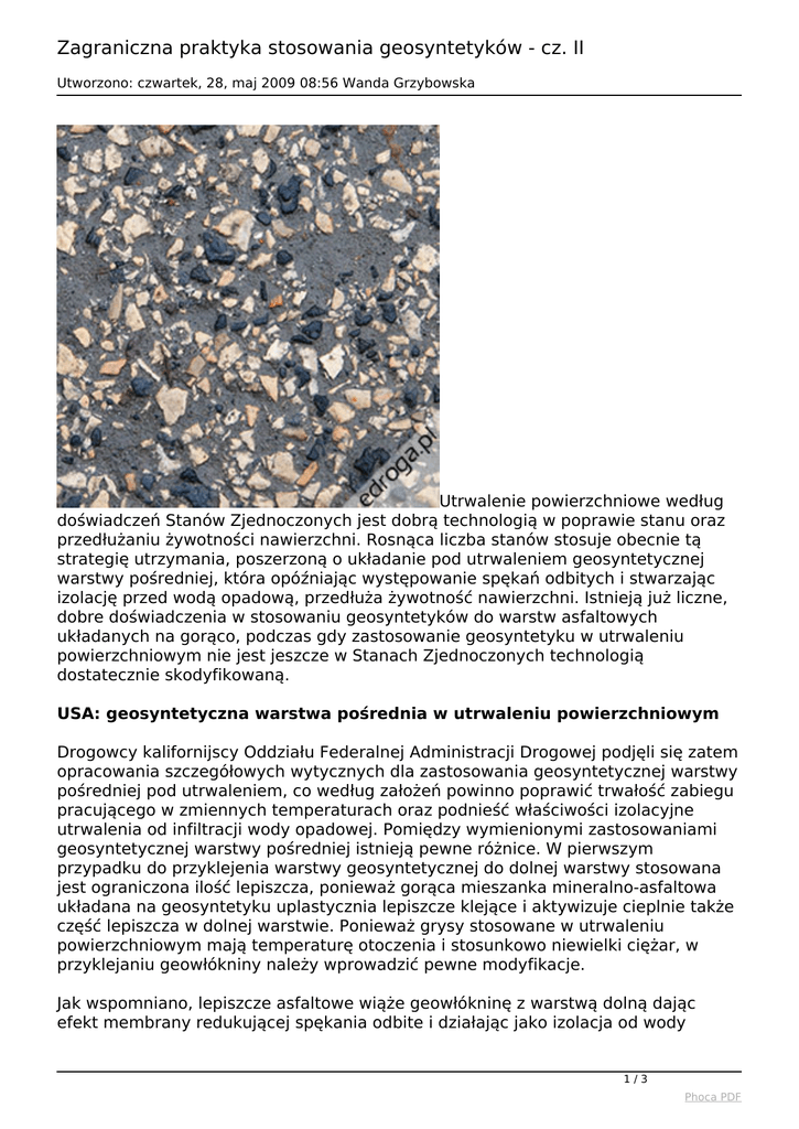 Zagraniczna praktyka stosowania geosyntetyków - cz. II Utworzono: czwartek, 28, maj 2009 08:56 Wanda Grzybowska Utrwalenie powierzchniowe według doświadczeń Stanów Zjednoczonych jest dobrą technologią w poprawie stanu oraz przedłużaniu żywotności nawierzchni. Rosnąca liczba stanów stosuje obecnie tą strategię utrzymania, poszerzoną o układanie pod utrwaleniem geosyntetycznej warstwy pośredniej, która opóźniając występowanie spękań odbitych i stwarzając izolację przed wodą opadową, przedłuża żywotność nawierzchni. Istnieją już liczne, dobre doświadczenia w stosowaniu geosyntetyków do warstw asfaltowych układanych na gorąco, podczas gdy zastosowanie geosyntetyku w utrwaleniu powierzchniowym nie jest jeszcze w Stanach Zjednoczonych technologią dostatecznie skodyfikowaną. USA: geosyntetyczna warstwa pośrednia w utrwaleniu powierzchniowym Drogowcy kalifornijscy Oddziału Federalnej Administracji Drogowej podjęli się zatem opracowania szczegółowych wytycznych dla zastosowania geosyntetycznej warstwy pośredniej pod utrwaleniem, co według założeń powinno poprawić trwałość zabiegu pracującego w zmiennych temperaturach oraz podnieść właściwości izolacyjne utrwalenia od infiltracji wody opadowej. Pomiędzy wymienionymi zastosowaniami geosyntetycznej warstwy pośredniej istnieją pewne różnice. W pierwszym przypadku do przyklejenia warstwy geosyntetycznej do dolnej warstwy stosowana jest ograniczona ilość lepiszcza, ponieważ gorąca mieszanka mineralno-asfaltowa układana na geosyntetyku uplastycznia lepiszcze klejące i aktywizuje cieplnie także część lepiszcza w dolnej warstwie. Ponieważ grysy stosowane w utrwaleniu powierzchniowym mają temperaturę otoczenia i stosunkowo niewielki ciężar, w przyklejaniu geowłókniny należy wprowadzić pewne modyfikacje. Jak wspomniano, lepiszcze asfaltowe wiąże geowłókninę z warstwą dolną dając efekt membrany redukującej spękania odbite i działając jako izolacja od wody 1/3 Phoca PDF Zagraniczna praktyka stosowania geosyntetyków - cz. II Utworzono: czwartek, 28, maj 2009 08:56 Wanda Grzybowska opadowej. Dla realizacji tych funkcji należy zarówno zastosować właściwą ilość lepiszcza asfaltowego, jak i odpowiednią geowłókninę. Badania i doświadczenia kalifornijskie mogą służyć jako przykład właściwego zastosowania technologii włączając w to: 1. 2. 3. 4. 5. 6. 7. 8. 9. wybór odcinka, dobór materiałów, użycie właściwego sprzętu, przeprowadzenie zabiegu w odpowiedniej temperaturze otoczenia, przygotowanie powierzchni warstwy do skropienia i ułożenia geowłókniny skropienie lepiszczem asfaltowym, instalacja geowłókniny, wstępne zagęszczenie, przygotowanie powierzchni geowłókniny do właściwego zabiegu utrwalenia powierzchniowego. Publikacja zawarta w Materiałach Konferencyjnych Międzynarodowej Konferencji RILEM nt. Pavement Crackings, Chicago 2008 r., podaje szczegółowo opisy i wymagania. W tym opracowaniu przedstawiono tylko najbardziej istotne elementy tej technologii. Ad 1. Wybór odcinka Efektywność technologii utrwalenia powierzchniowego w dużym stopniu zależy od wyboru właściwego odcinka. Utrwalenie, poprawiając szorstkość powierzchni jezdni powinno być stosowane szczególnie na ostrych zakrętach i dużych pochyleniach, jednak skuteczność będzie większa jeśli zastosujemy je w powiązaniu z geosyntetyczną warstwą pośrednią. Można wymienić kilka przypadków, w których technologia ta nie powinna być stosowana. Są to sytuacje następujące: skręty na skrzyżowaniach, ronda, krzywizny poziome o promieniu mniejszym od 70 m, cul de sac, pasy przyspieszonego ruchu, zatrzymywania lub zawracania, obszary poddawane zwiększonym obciążeniom od ruchu. Utrwalenie powierzchniowe na geowłókninie powinno się chronić przed działaniem wody opadowej (spadki poprzeczne i podłużne) oraz z dołu, tj. wody gruntowej (warstwa odsączająca). Ad 2. Materiały Lepiszcze asfaltowe dobrane jest odpowiednio do maksymalnej i minimalnej 2/3 Phoca PDF Zagraniczna praktyka stosowania geosyntetyków - cz. II Utworzono: czwartek, 28, maj 2009 08:56 Wanda Grzybowska temperatury w ciągu roku w obszarze usytuowania odcinka. W niskich temperaturach nie powinno stawać się kruche, w temperaturach podniesionych nie może się upłynniać. Emulsja asfaltowa może być stosowana lecz nie jest rekomendowana dla geowłókniny jako lepiszcze. Przed rozłożeniem włókniny emulsja powinna całkowicie ulec rozpadowi, a woda całkowicie odparować, co wymaga określonego czasu, zależnego od typu zastosowanej emulsji i temperatury otoczenia. Jeżeli przewidziane jest zastosowanie emulsji do przyklejenia włókniny, należy starannie przeanalizować i wybrać rodzaj emulsji, ilość potrzebną do przyklejenia, czas rozpadu i odparowania wody oraz rodzaj grysów. Ilość lepiszcza do przyklejenia wynosi 139 g/m2. Geowłóknina ma strukturę igłowaną, wydłużenie po nasyceniu mieści się w granicach 40-70%, temperatura topnienia 163°C. Powinna dobrze absorbować lepiszcze, dając trwałą i stabilną membranę chroniącą konstrukcję nawierzchni. Jedna strona geowłókniny jest prasowana na gorąco (kalandrowana), druga pozostawiona puszystą i tą stroną jest układana na lepiszczu. Obowiązkiem producenta jest dostarczenie certyfikatu zgodności - jest to warunek zastosowania danego rodzaju geowłókniny. Piasek stosowany przejściowo do posypania powierzchni geowłókniny ma na celu ochronę jej przed uszkodzeniami powodowanymi ewentualnie, przez koła walca ogumionego dociskającego włókninę dla jej przyklejenia lub przez koła pojazdów budowlanych. Powinien być jednorodny, czysty, o uziarnieniu do 10 mm, zawartość frakcji 3/3 Phoca PDF Powered by TCPDF (www.tcpdf.org)