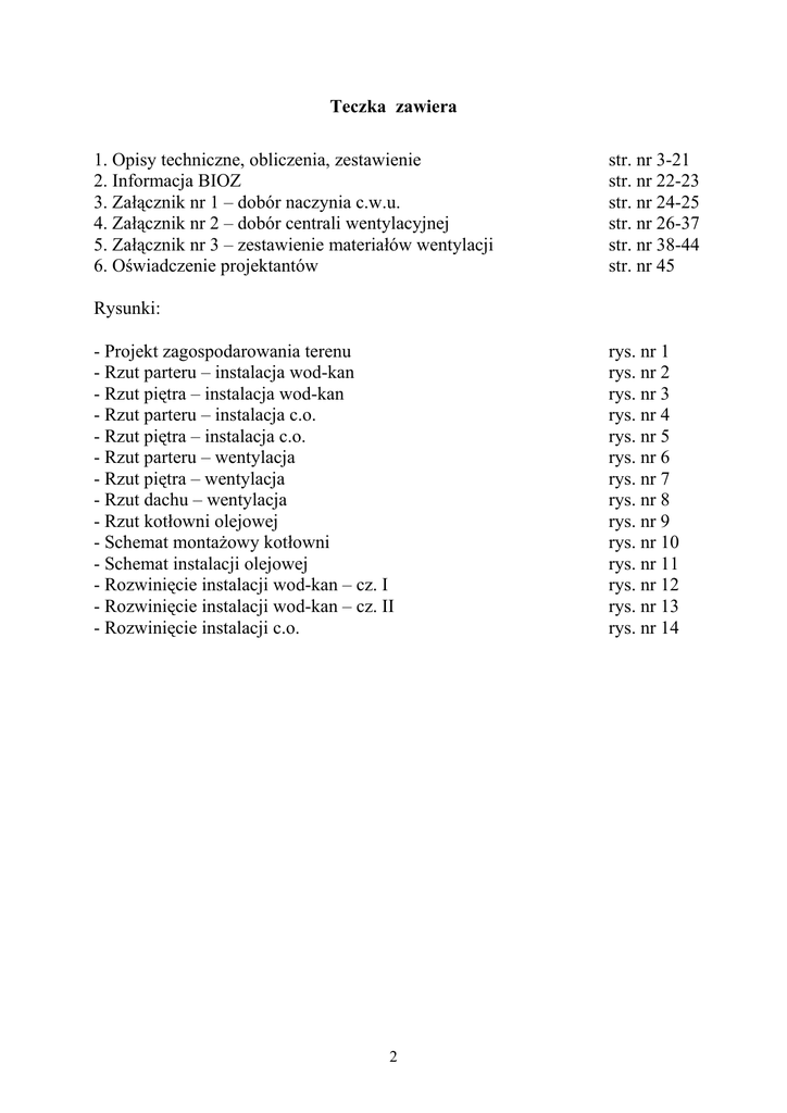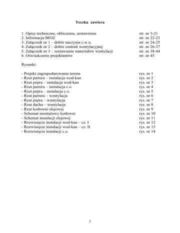 Teczka zawiera 1. Opisy techniczne, obliczenia, zestawienie str. nr 3