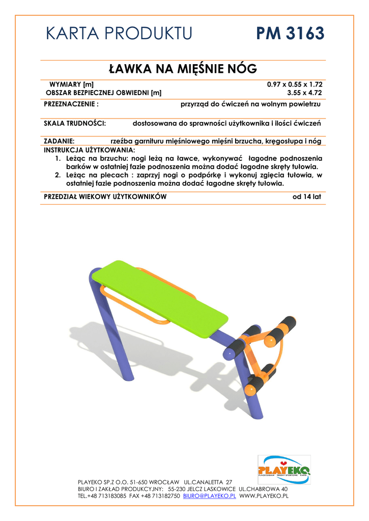 KARTA PRODUKTU PM 3163 ŁAWKA NA MIĘŚNIE NÓG WYMIARY [m] OBSZAR BEZPIECZNEJ OBWIEDNI [m] PRZEZNACZENIE : SKALA TRUDNOŚCI: 0.97 x 0.55 x 1.72 3.55 x 4.72 przyrząd do ćwiczeń na wolnym powietrzu dostosowana do sprawności użytkownika i ilości ćwiczeń ZADANIE: rzeźba garnituru mięśniowego mięśni brzucha, kręgosłupa i nóg INSTRUKCJA UŻYTKOWANIA: 1. Leżąc na brzuchu: nogi leżą na ławce, wykonywać łagodne podnoszenia barków w ostatniej fazie podnoszenia można dodać łagodne skręty tułowia. 2. Leżąc na plecach : zaprzyj nogi o podpórkę i wykonuj zgięcia tułowia, w ostatniej fazie podnoszenia można dodać łagodne skręty tułowia. PRZEDZIAŁ WIEKOWY UŻYTKOWNIKÓW PLAYEKO SP.Z O.O. 51-650 WROCŁAW UL.CANALETTA 27 BIURO I ZAKŁAD PRODUKCYJNY: 55-230 JELCZ LASKOWICE UL.CHABROWA 40 TEL.+48 713183085 FAX +48 713182750 [email protected] WWW.PLAYEKO.PL od 14 lat KARTA TECHNICZNA PM 3163 ŁAWKA NA MIĘŚNIE NÓG opis: PM konstrukcja wykonana z rur stalowych ø 76 mm i ø 30 mm, ocynkowanych ogniowo i malowanych wg RAL Siedzisko wykonane z HDPE/ opcjonalnie ze sklejki Oś obrotowa- łożyska stożkowe Możliwość montażu na prefabrykacie betonowym PLAYEKO SP.Z O.O. 51-650 WROCŁAW UL.CANALETTA 27 BIURO I ZAKŁAD PRODUKCYJNY: 55-230 JELCZ LASKOWICE UL.CHABROWA 40 TEL.+48 713183085 FAX +48 713182750 [email protected] WWW.PLAYEKO.PL